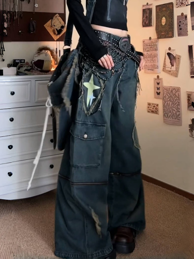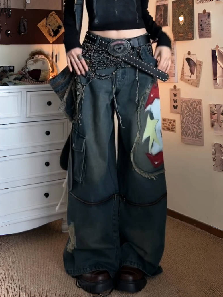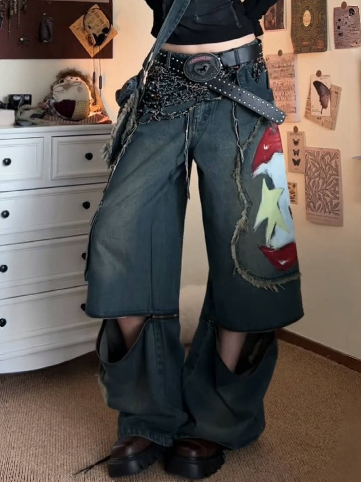 아메리칸 스트리트 플러스 사이즈 워싱 및 디스트레스드 애플 프린트 탈착식 청바지 여성용 루즈 슬리밍 와이드 레그 팬츠