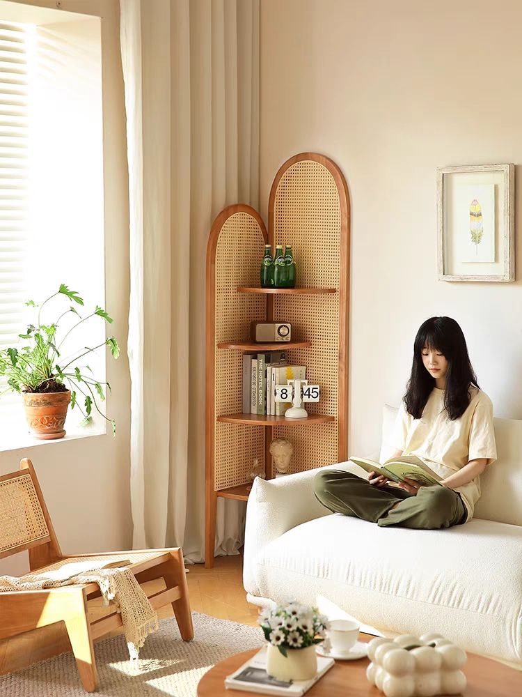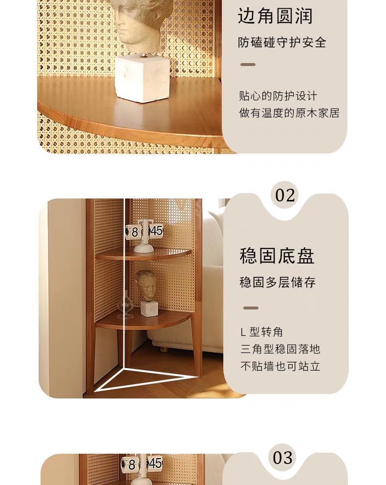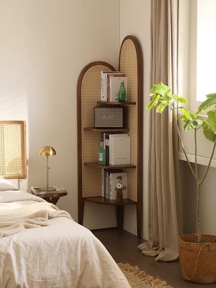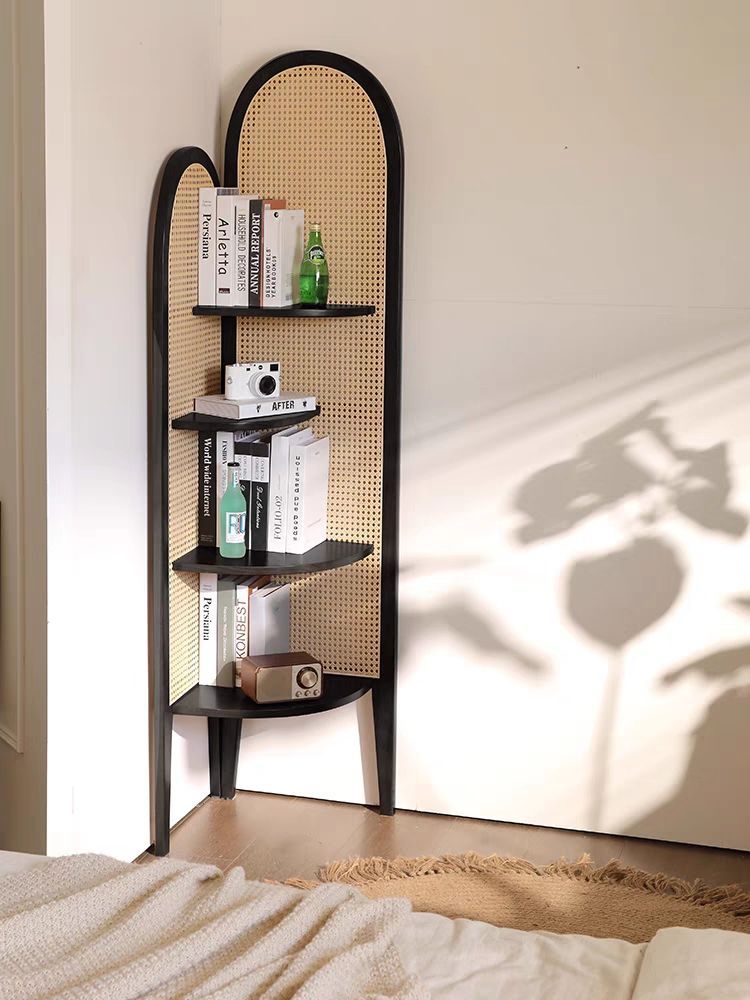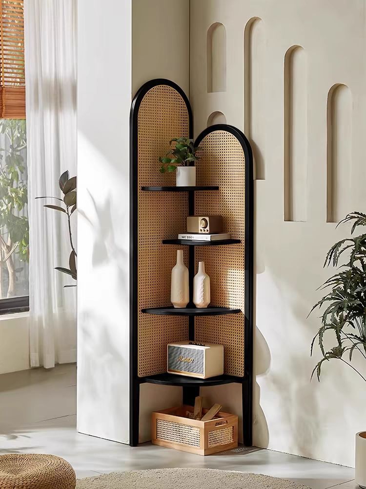중간 및 복고풍 스타일 가구 삼각형 저장 랙 솔리드 우드 등나무 소파 후면 검은 바닥 디스플레이 코너 벽면 캐비닛스토어 가기