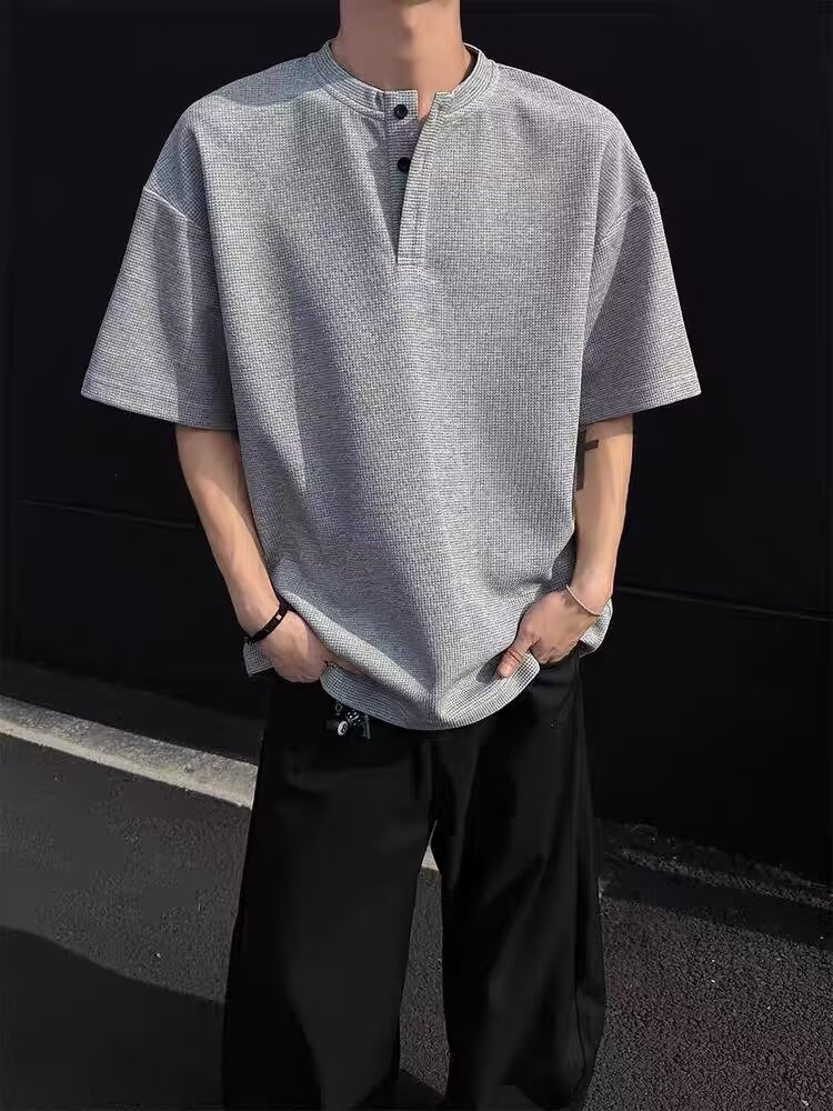 헨리 칼라 와플 반팔 티셔츠 남자 2025 년 여름 유행 브랜드 미국 스타일 반팔베이스 셔츠 루즈 캐주얼 티셔츠