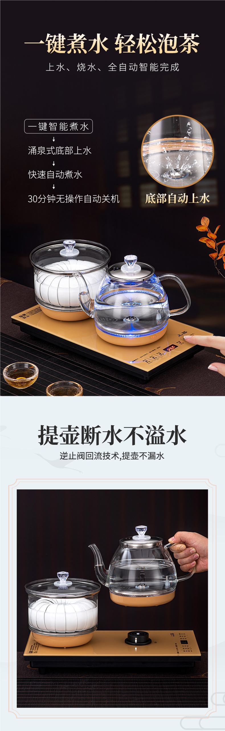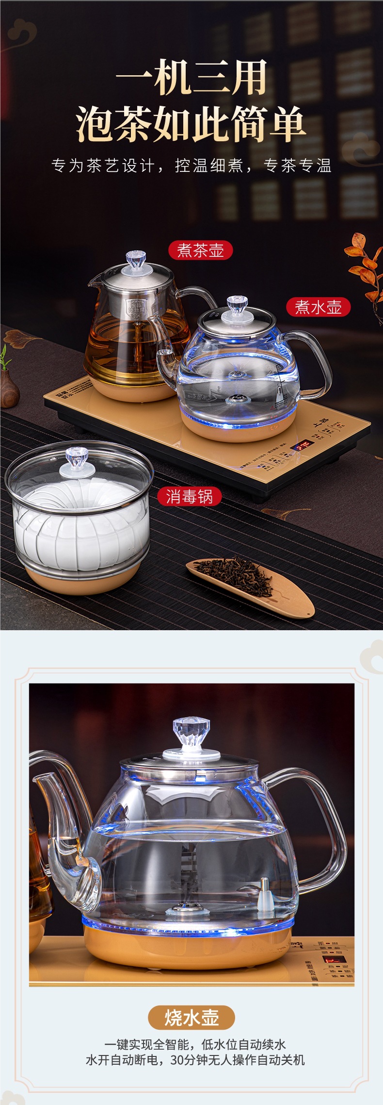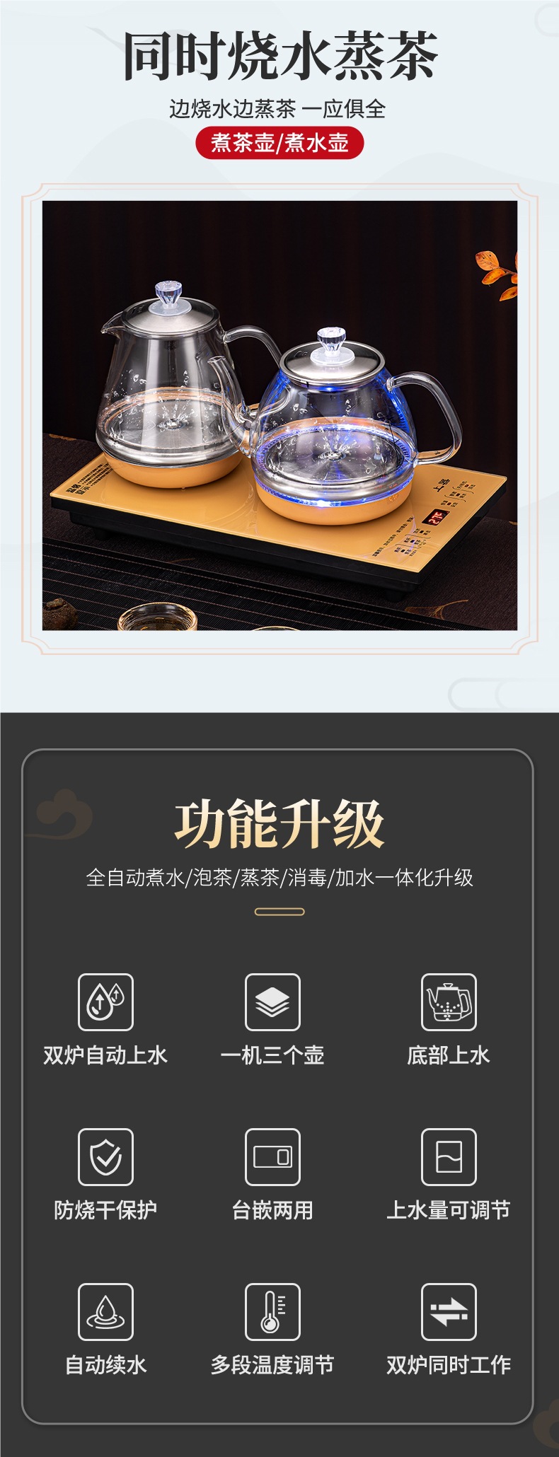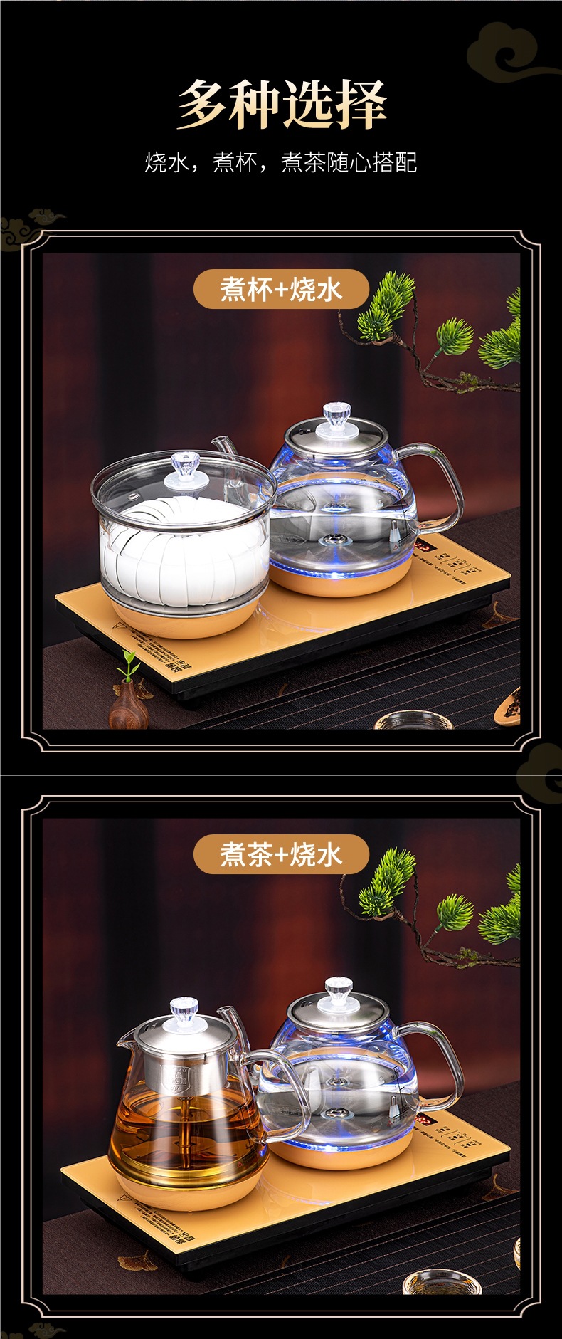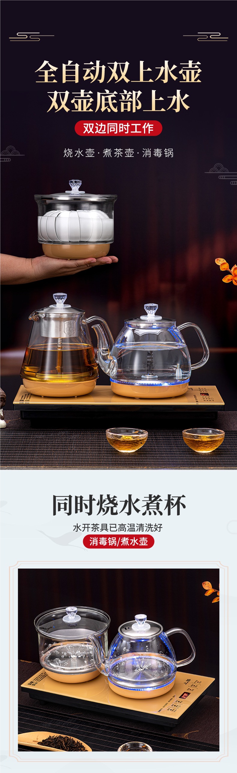 • 하단 물 보충 + 이중로 물 보충 + [황금 차 만들기 스타일] + 동시 가열 + 청색광 디스플레이 크기 20*37
