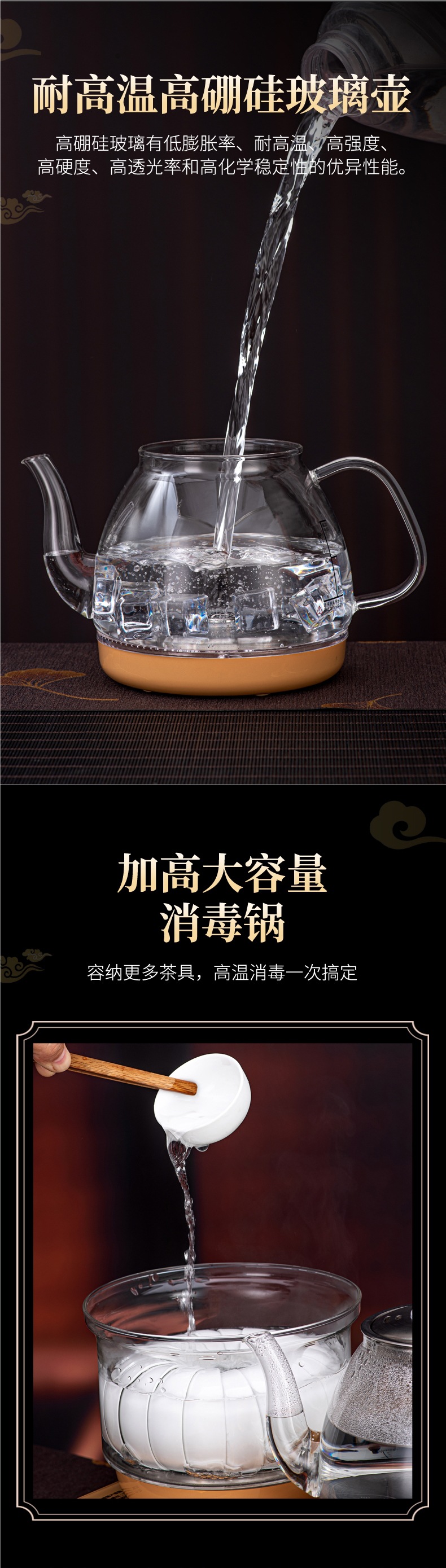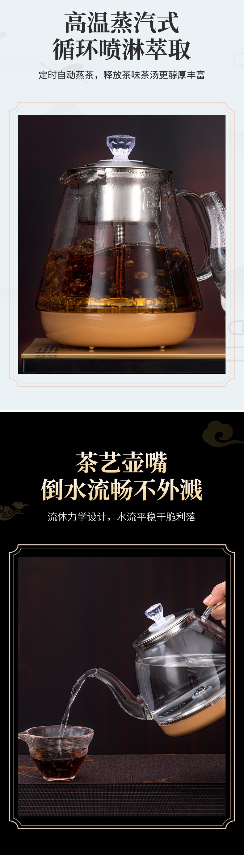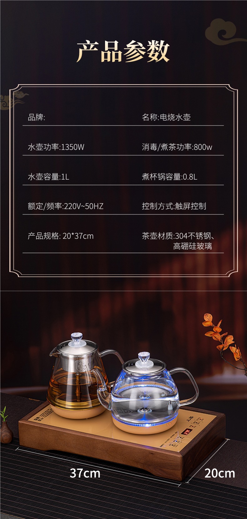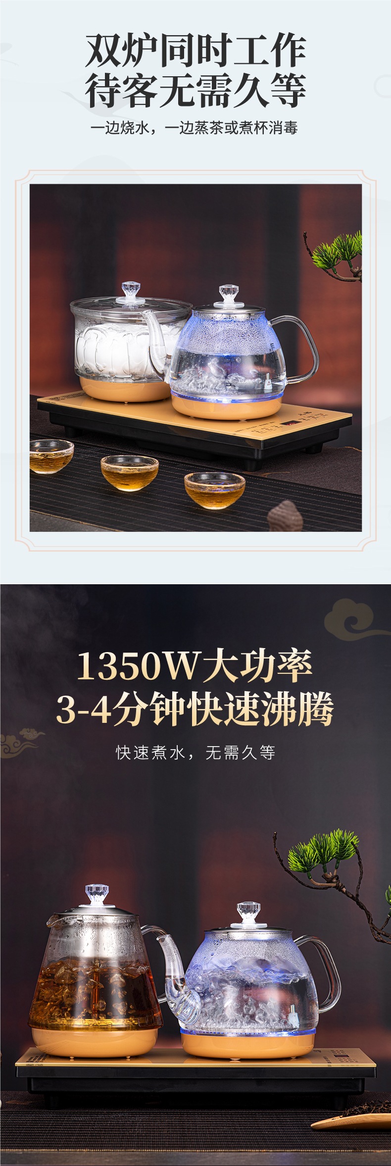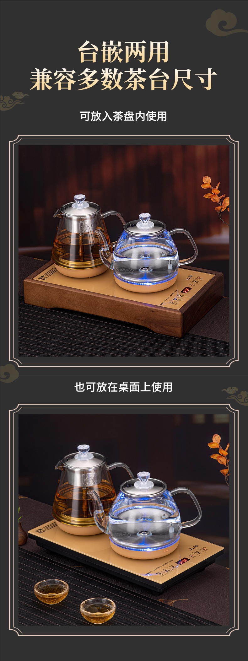 • 하단 물 보충 + 이중로 물 보충 + [황금 차 만들기 스타일] + 동시 가열 + 청색광 디스플레이 크기 20*37