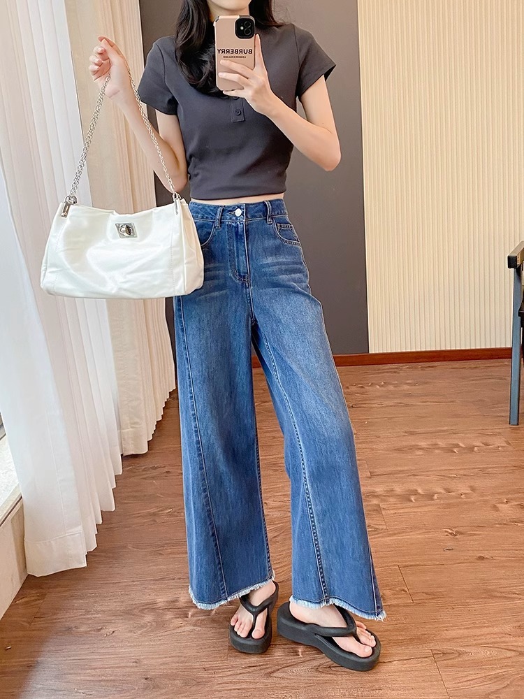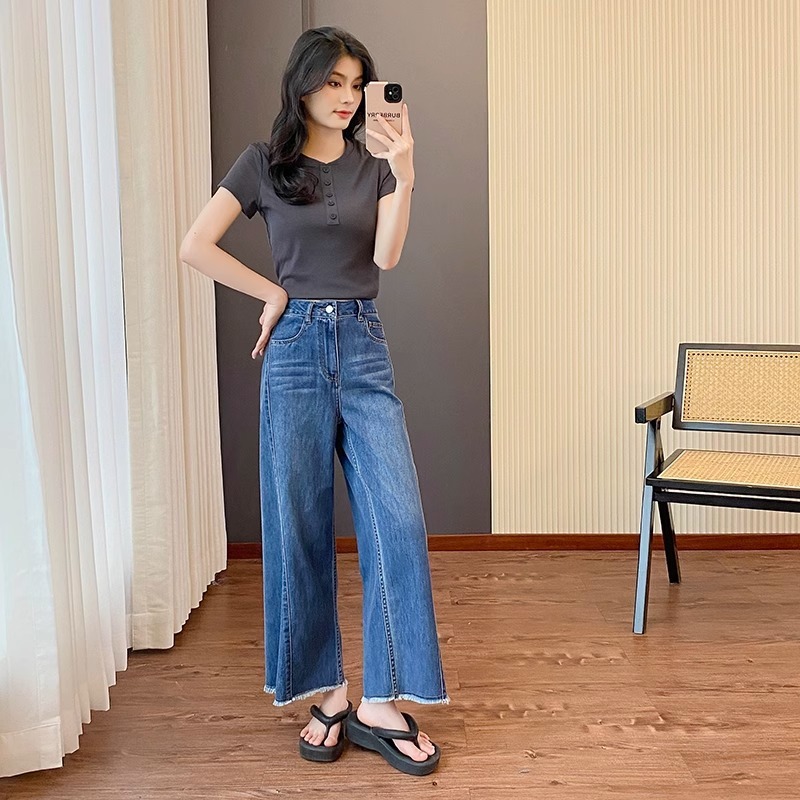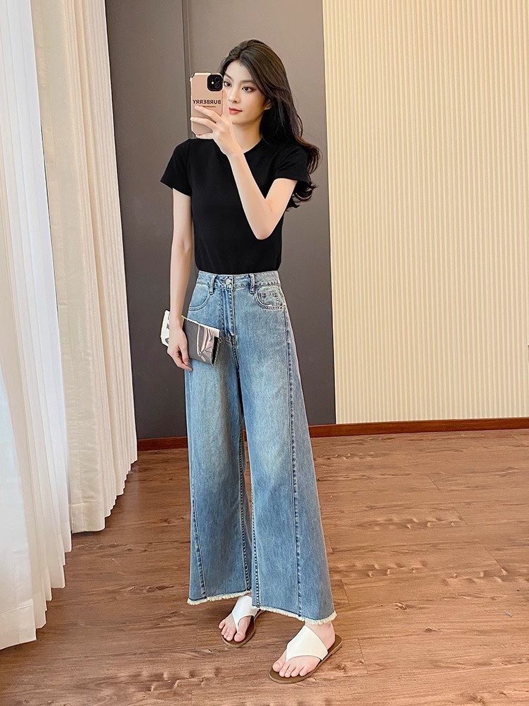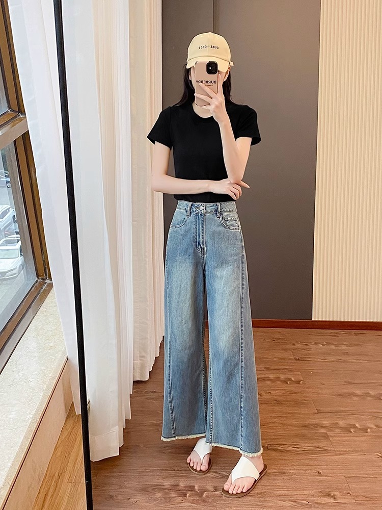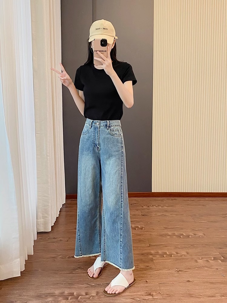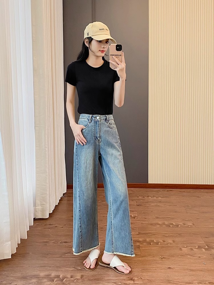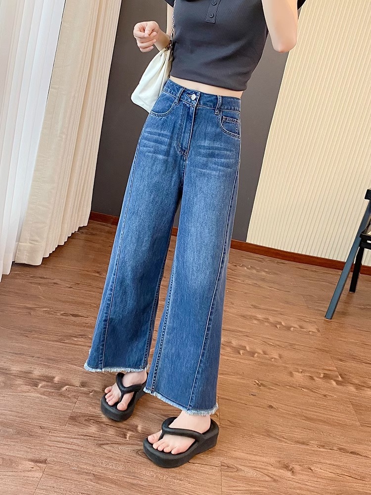 플러스 사이즈 여성의 여름 새로운 스트레이트 레그 청바지 슬리밍 통통 자매 배 모양의 몸 느슨한 작은 남자를위한 넓은 다리 바지스토어 가기