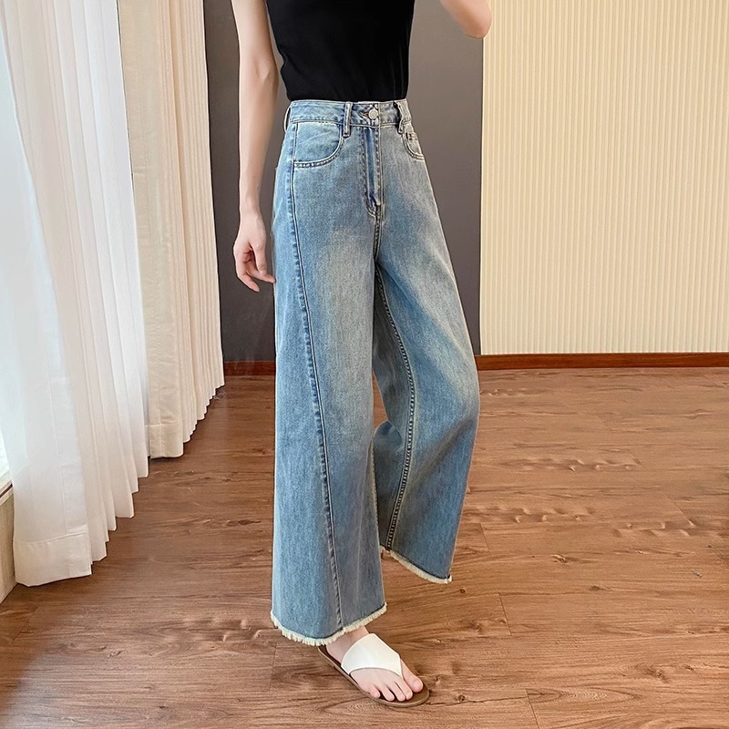 플러스 사이즈 여성의 여름 새로운 스트레이트 레그 청바지 슬리밍 통통 자매 배 모양의 몸 느슨한 작은 남자를위한 넓은 다리 바지