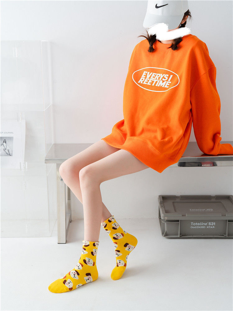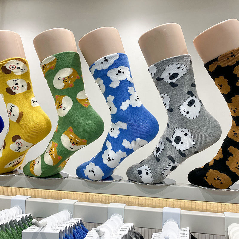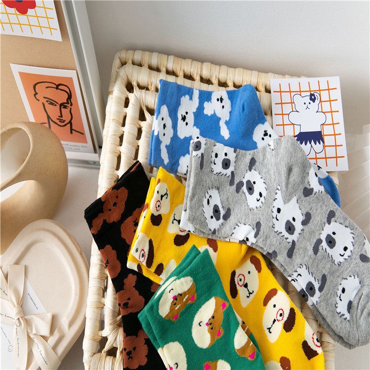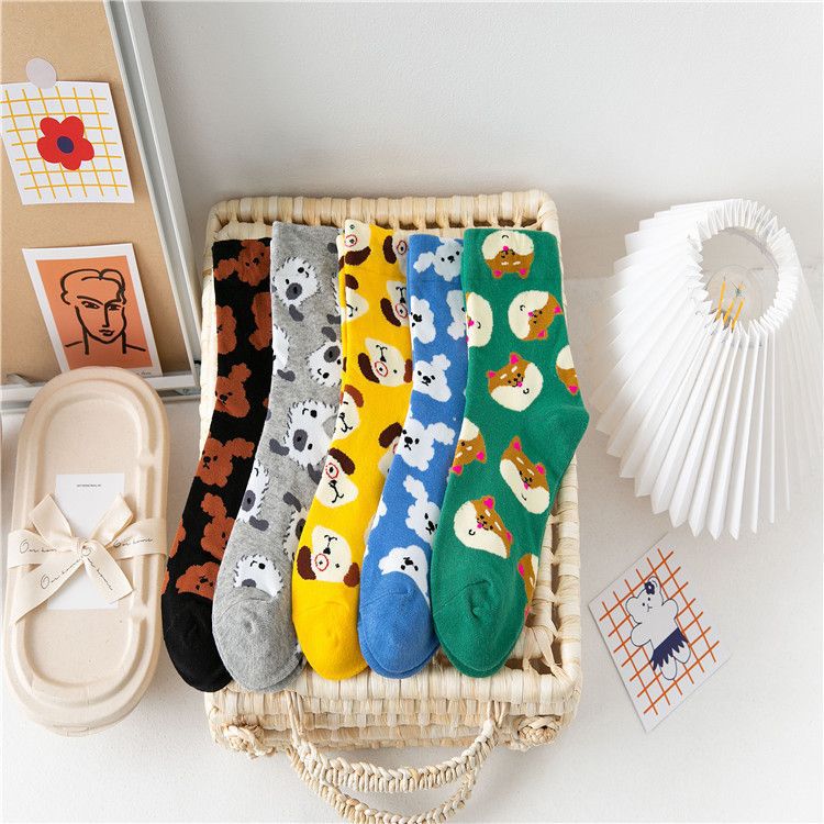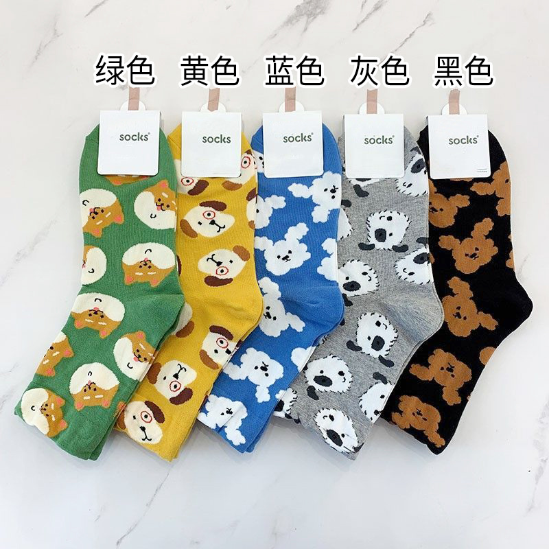 Zhuji 양말 여성용 종아리 중간 양말 봄과 가을 귀여운 만화 개 양말 일본식 한국어 버전 다목적 대학 스타일