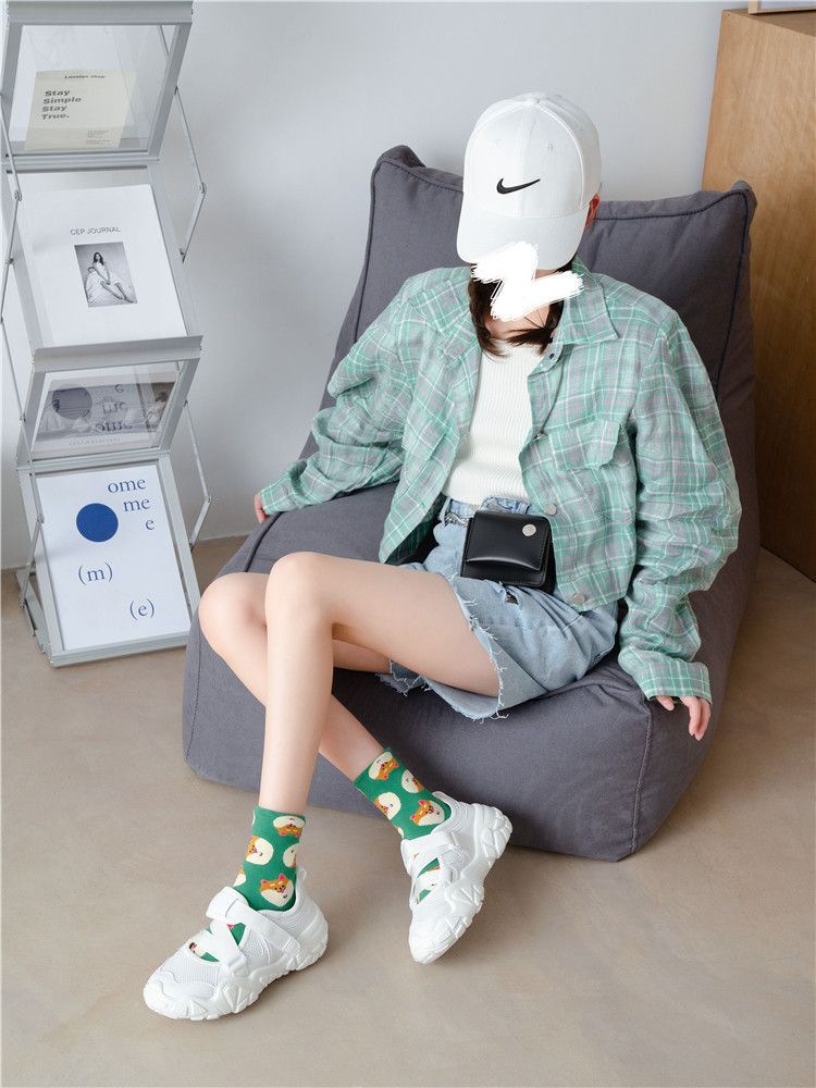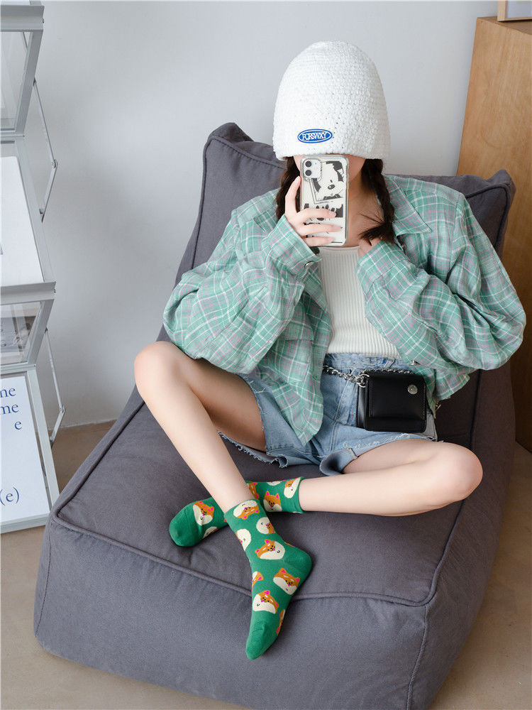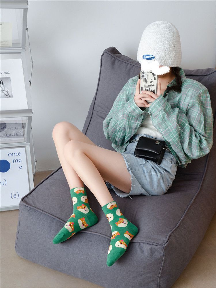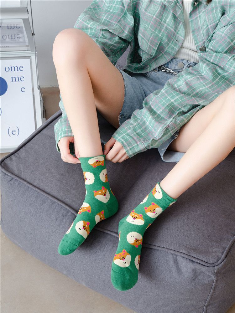 Zhuji 양말 여성용 종아리 중간 양말 봄과 가을 귀여운 만화 개 양말 일본식 한국어 버전 다목적 대학 스타일스토어 가기