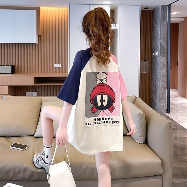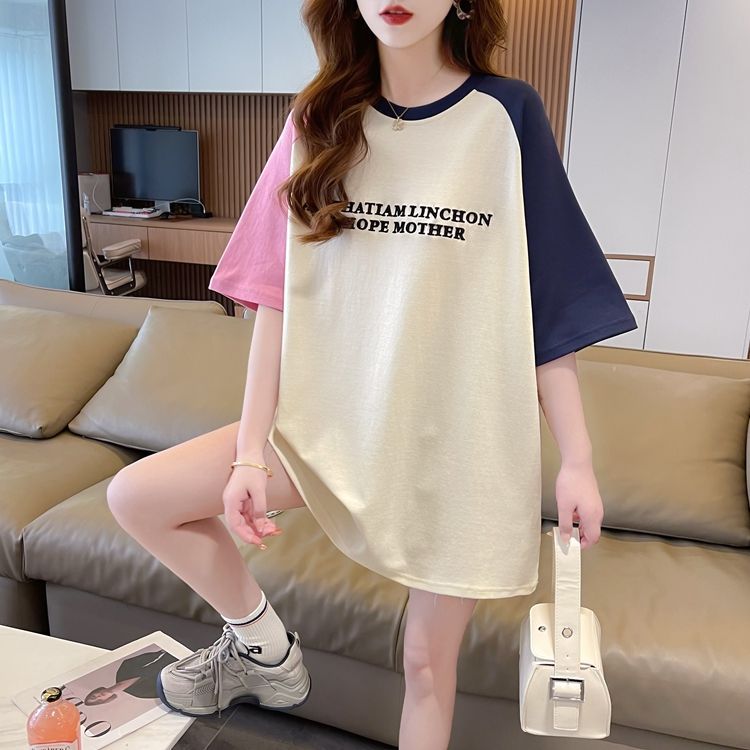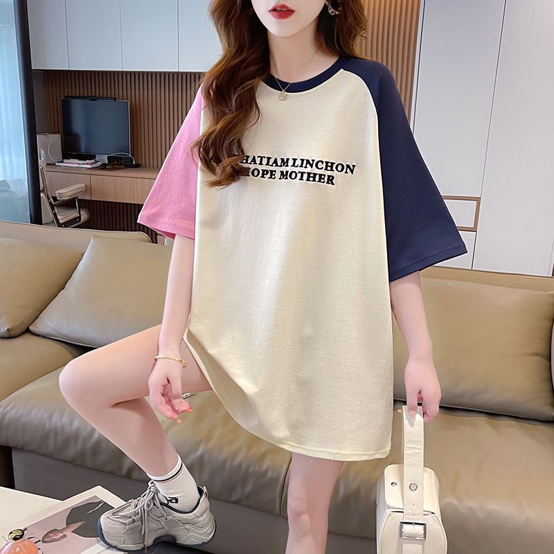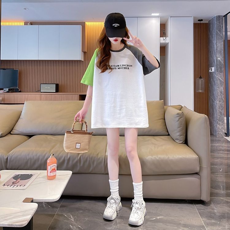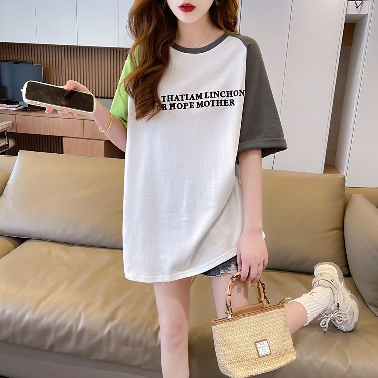 면화 여름 연령 감소 컬러 매칭 반팔 티셔츠 여성 2025 새로운 게으른 스타일 중간 길이의 한국식 탑 트렌디