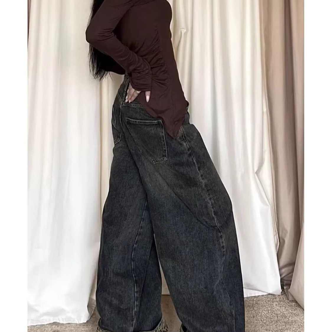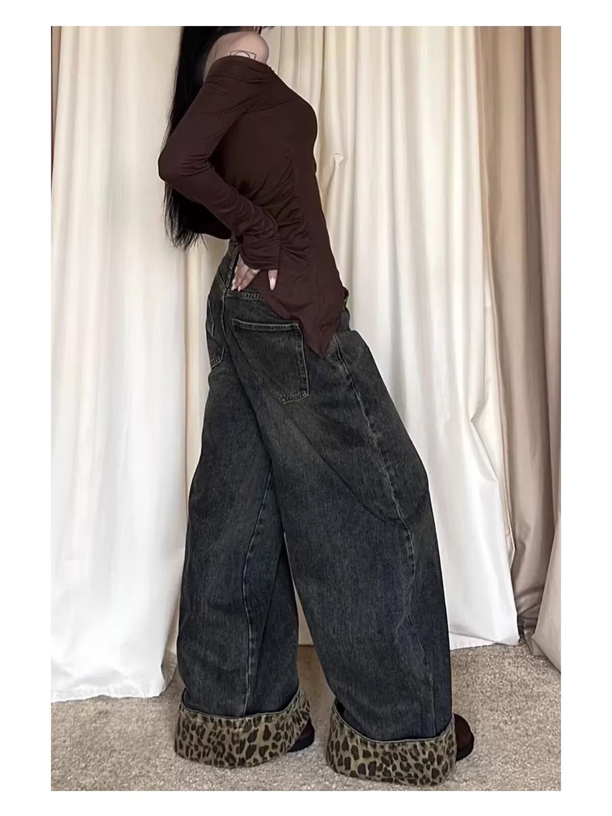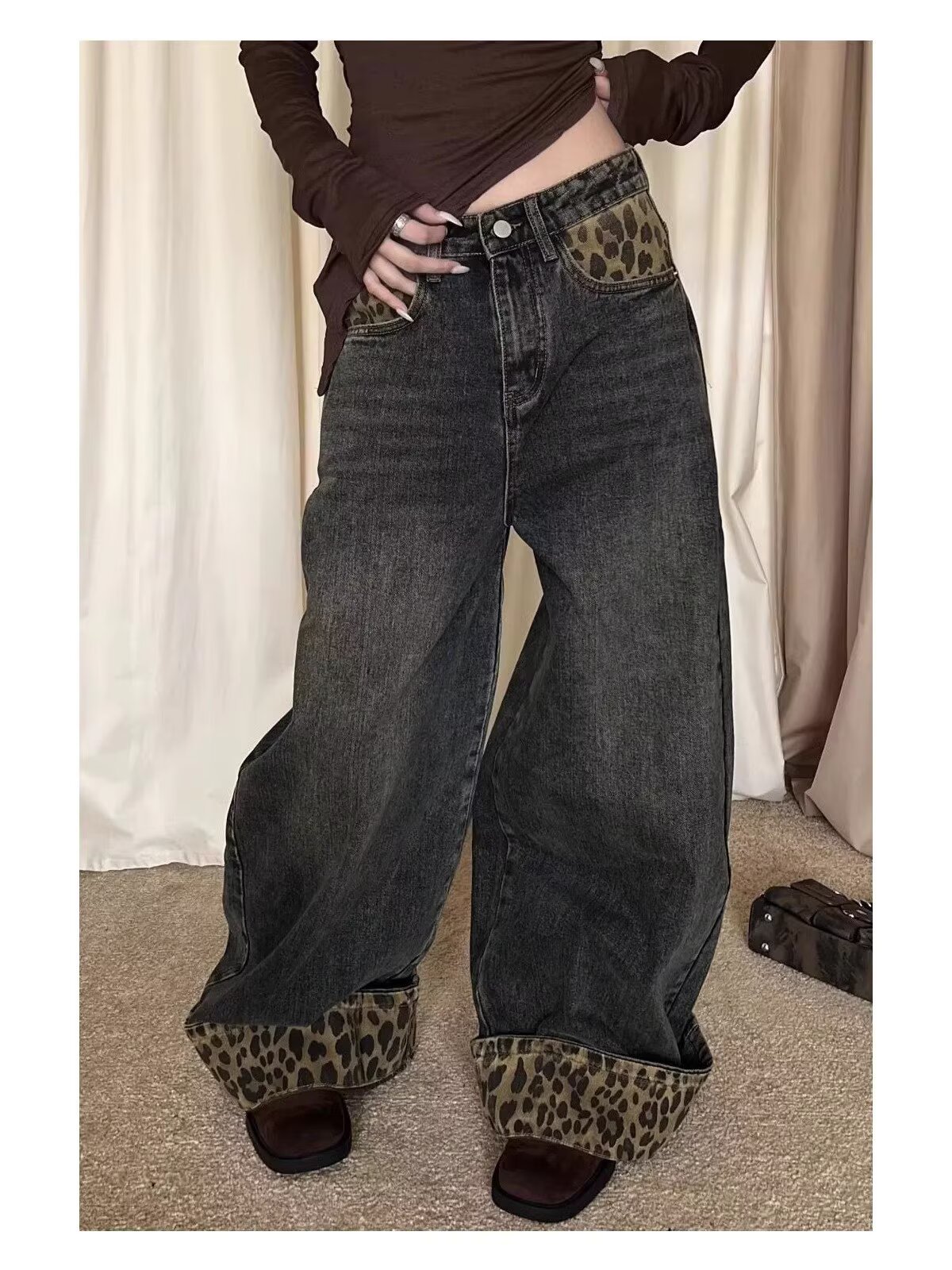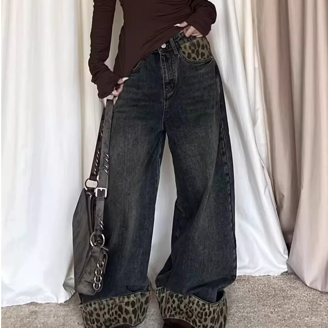 아메리칸 레트로 레오파드 프린트 컬링 틈새 디자인 스플라이스 청바지 여성용 새로운 다용도 데님 와이드 팬츠 트렌디스토어 가기