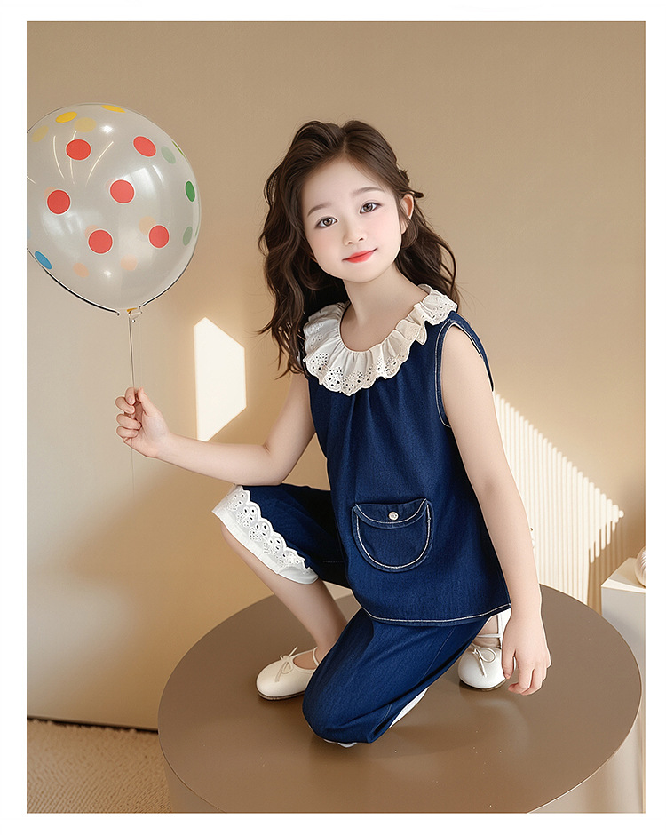 여자 여름 민소매 양복 2025 새로운 어린이 조끼 데님 스타일 투피스 세트 아기 여름 옷 유행