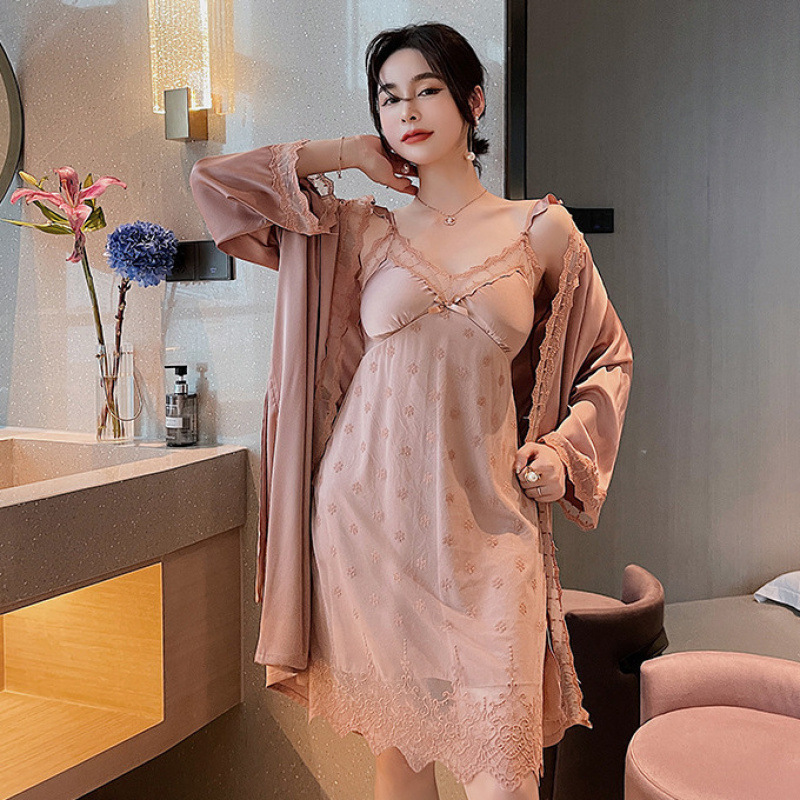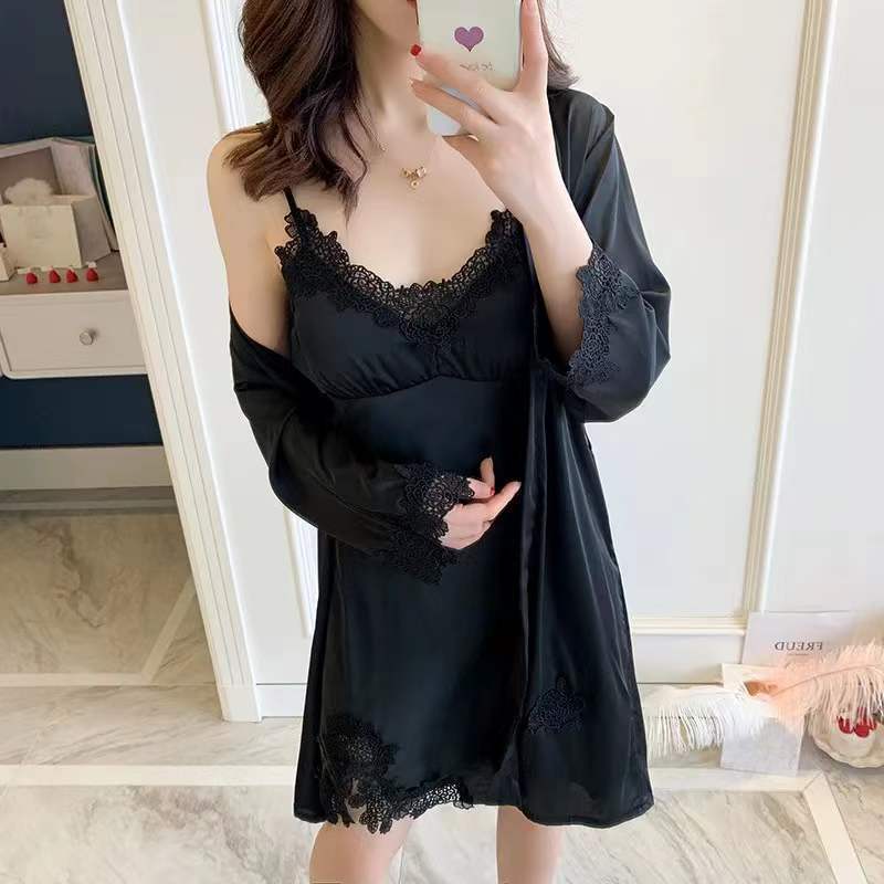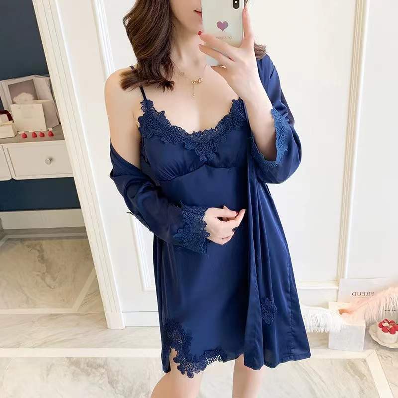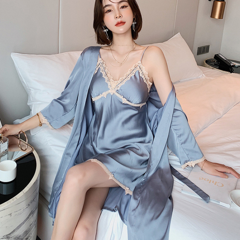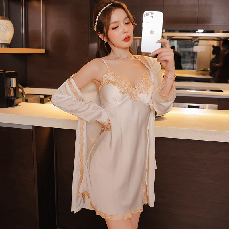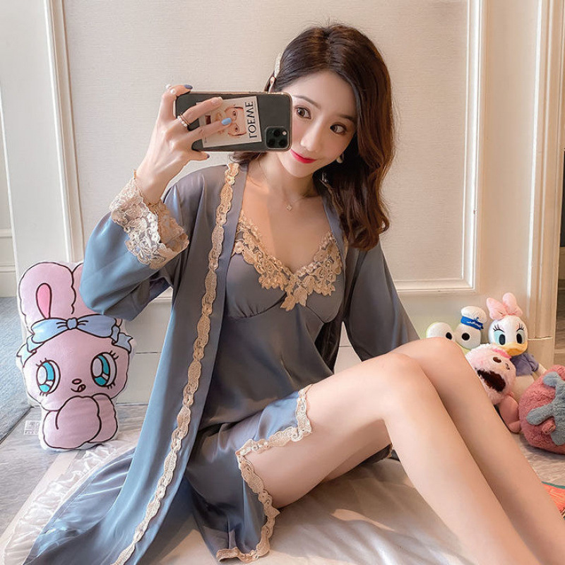 신부 모닝 가운 섹시한 잠옷 여성 여름 아이스 실크 얇은 봄과 가을 레이스 슬링 가슴 패드 나이트 드레스 투피스 세트