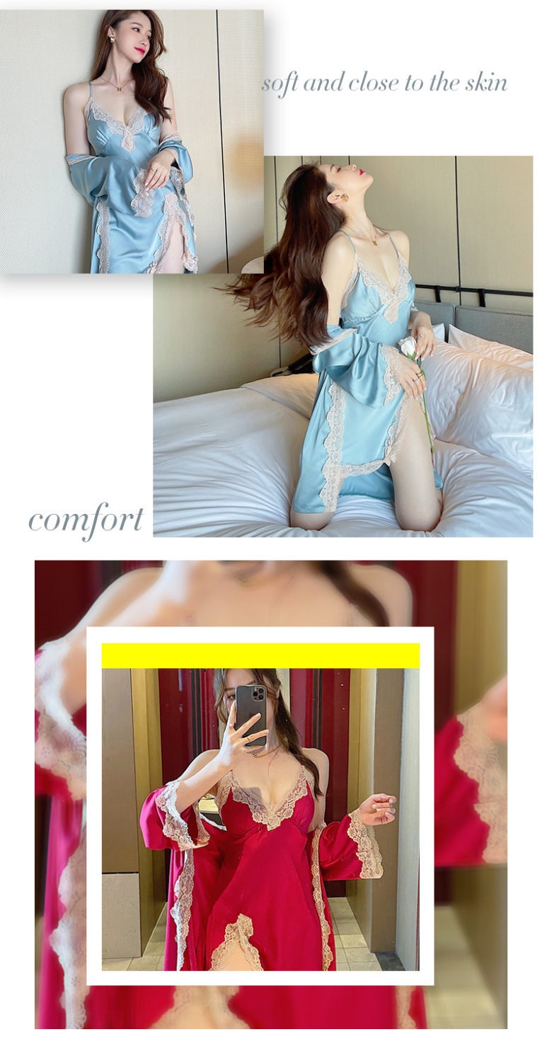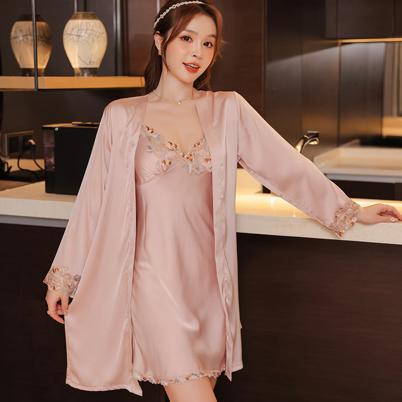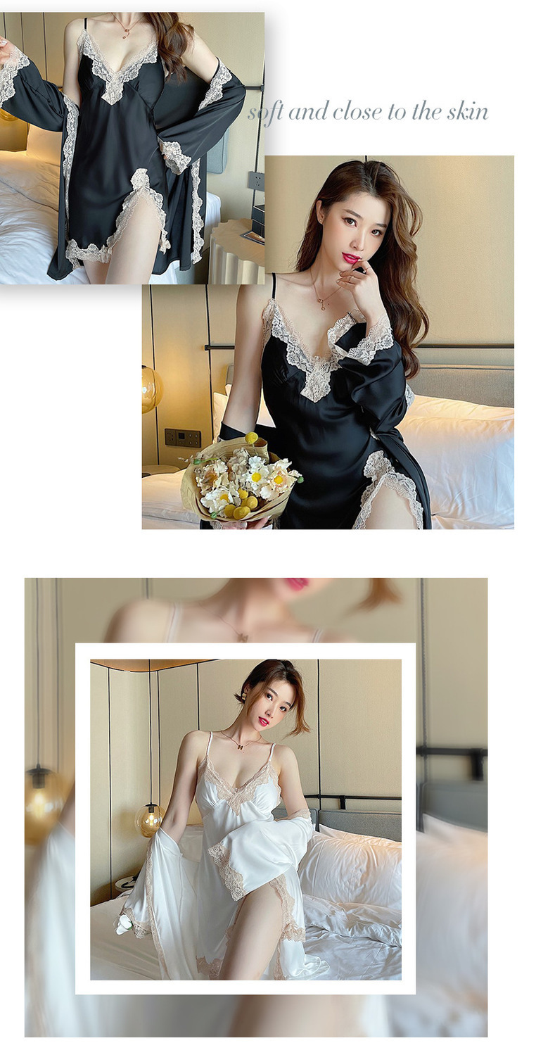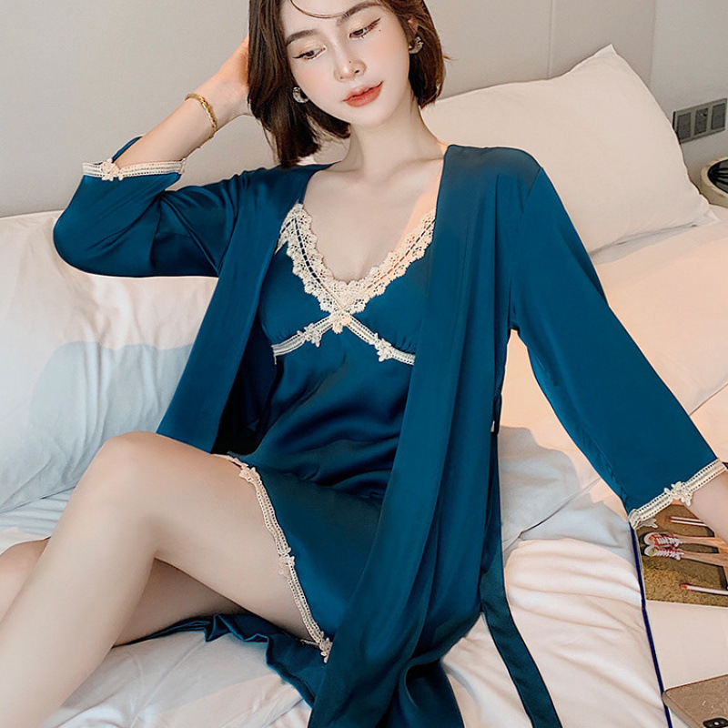 신부 모닝 가운 섹시한 잠옷 여성 여름 아이스 실크 얇은 봄과 가을 레이스 슬링 가슴 패드 나이트 드레스 투피스 세트