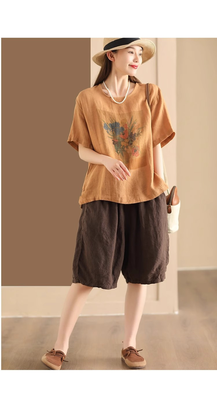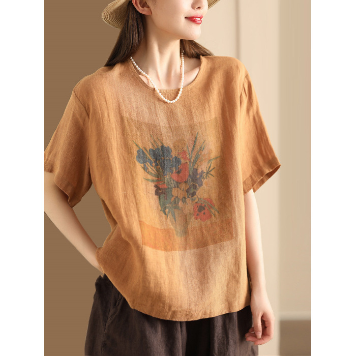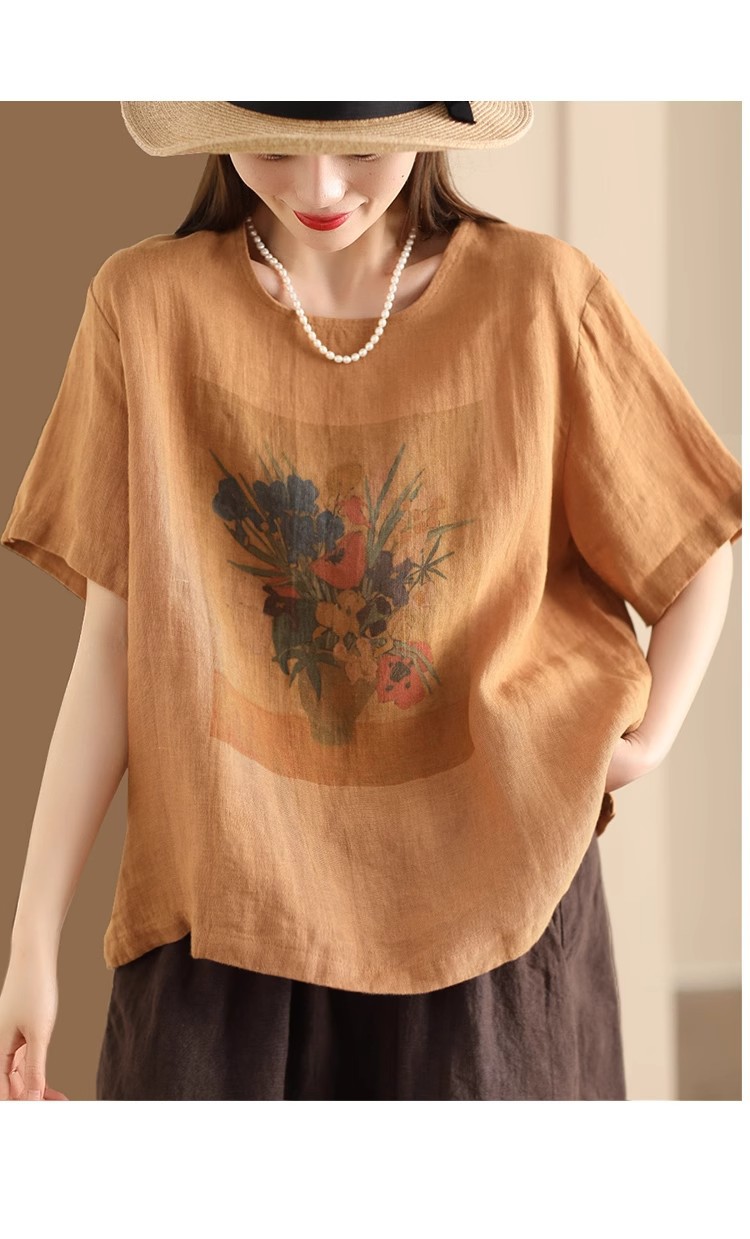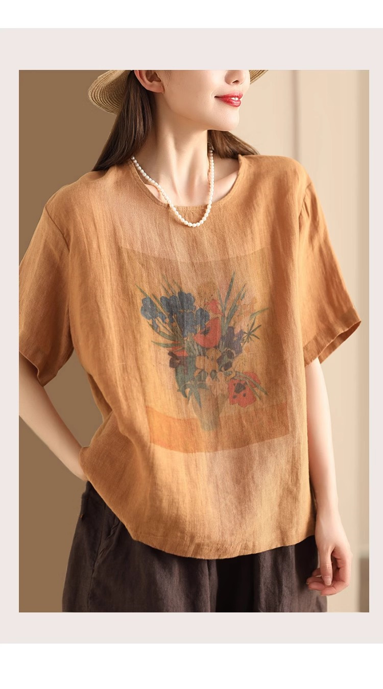 #603 2025 여름 인쇄면 및 리넨 티셔츠 여성용 크루 넥 반팔 셔츠 리넨 다크 브라운 오렌지 화이트 체닐스토어 가기