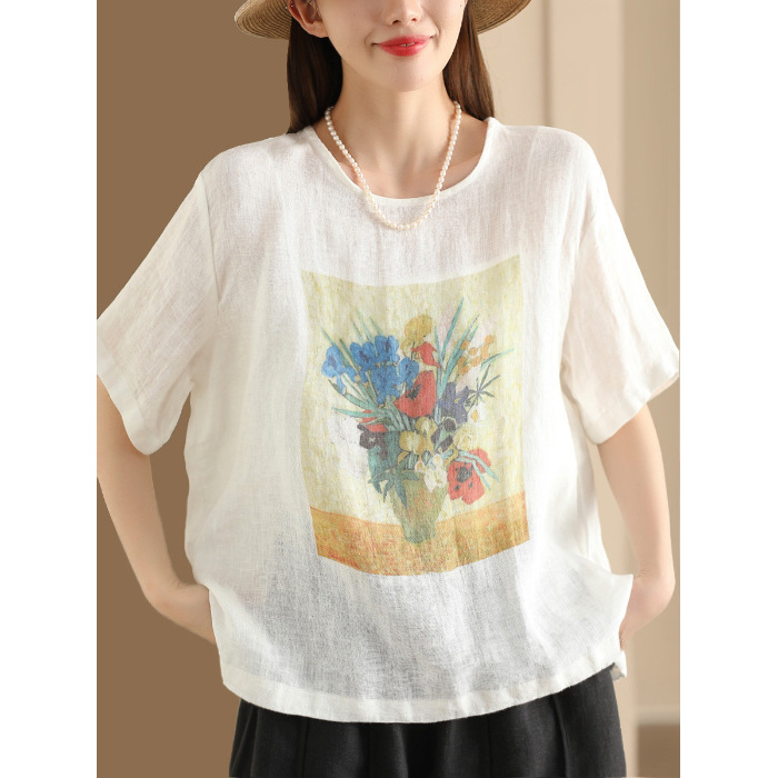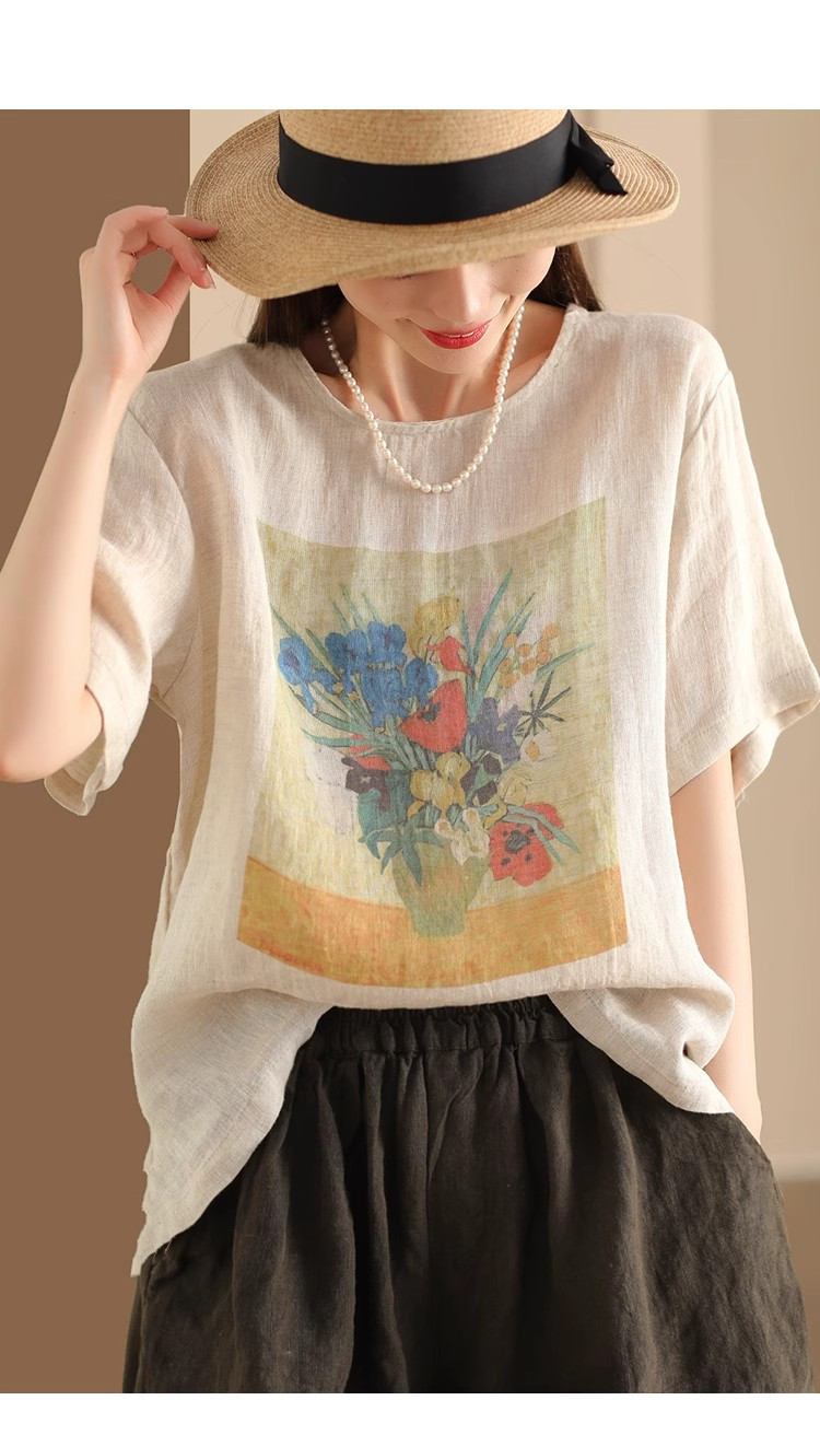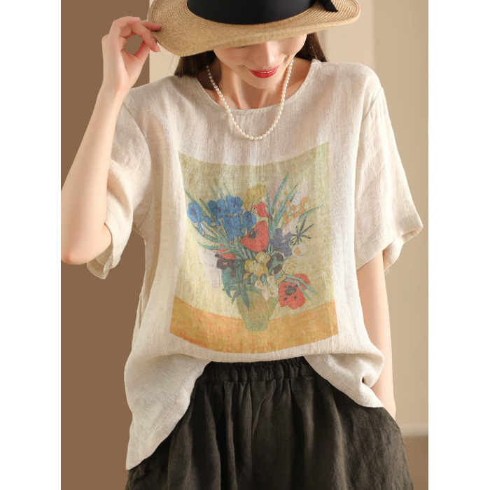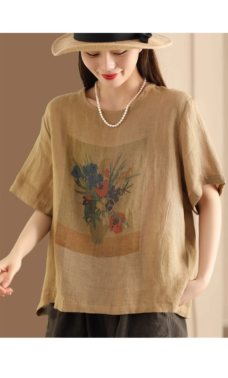 #603 2025 여름 인쇄면 및 리넨 티셔츠 여성용 크루 넥 반팔 셔츠 리넨 다크 브라운 오렌지 화이트 체닐스토어 가기