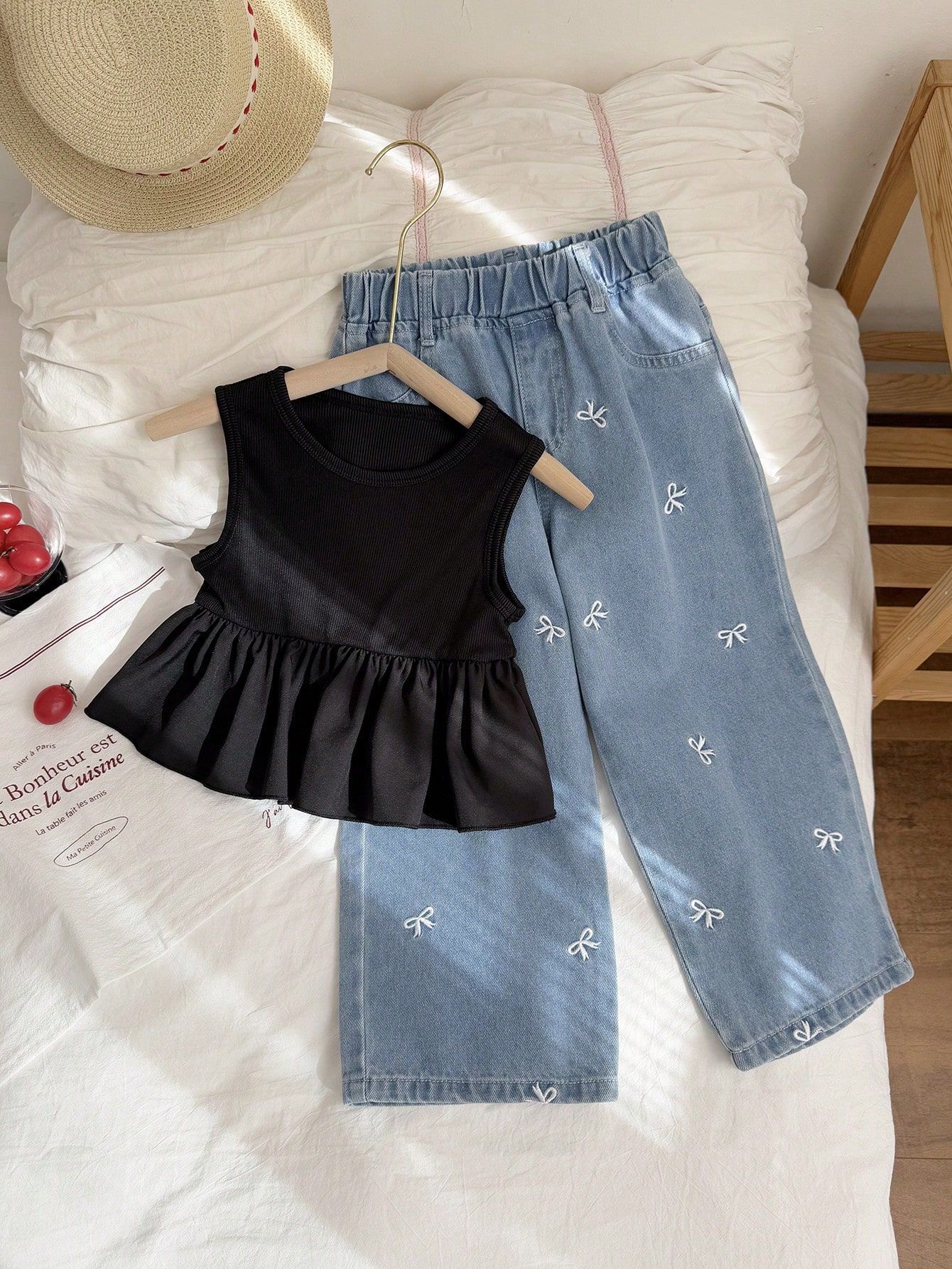 2025 새로운 봄과 여름 국경 소녀 니트 크루 넥 탑 활 자수 청바지 투피스 세트스토어 가기