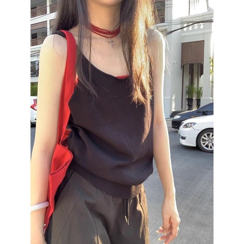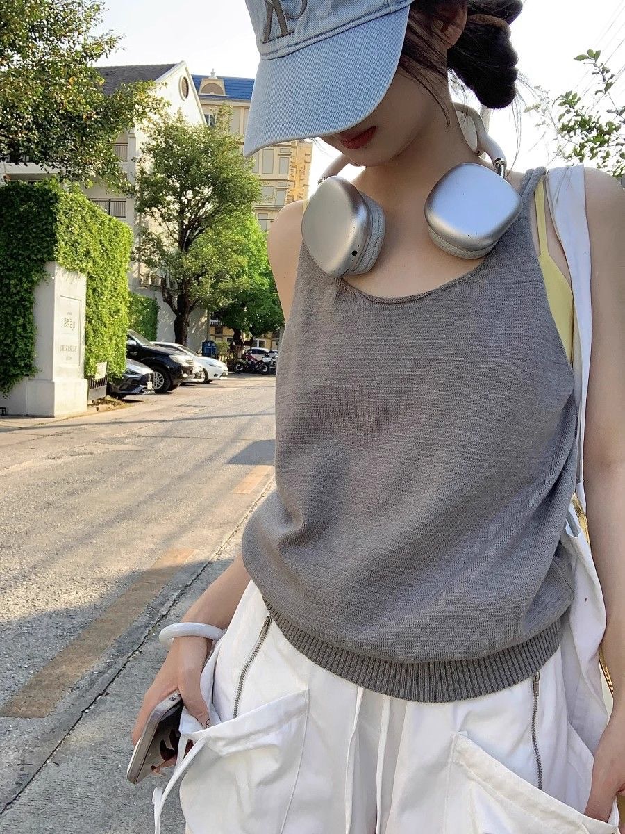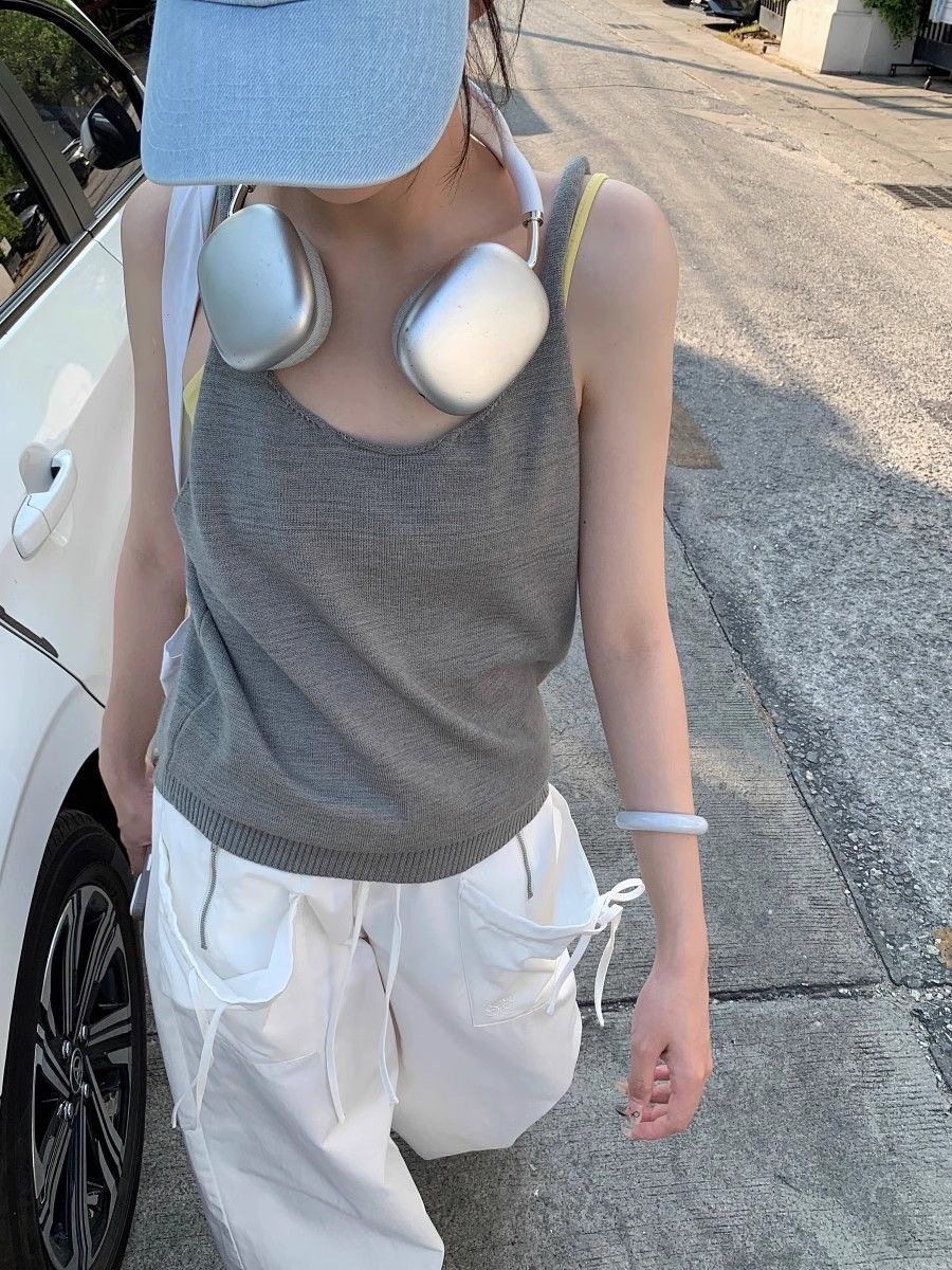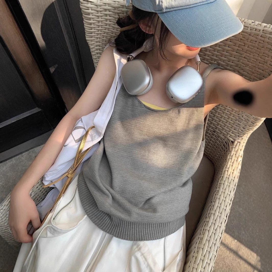 회색 니트 작은 카미 솔 여성 내복 여름 새로운 스파이스 걸스 외부 착용 백리스 느슨한 슬림 소매 탑