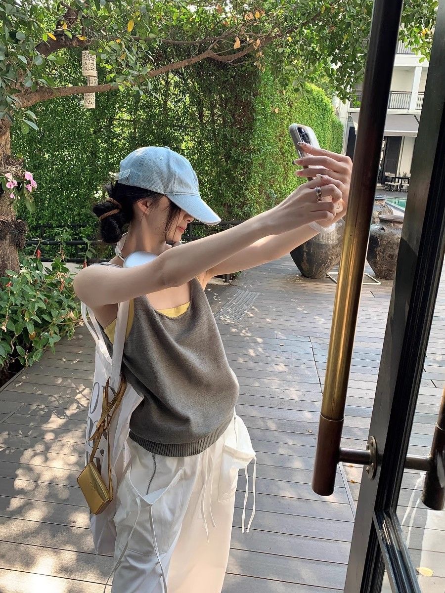 회색 니트 작은 카미 솔 여성 내복 여름 새로운 스파이스 걸스 외부 착용 백리스 느슨한 슬림 소매 탑스토어 가기