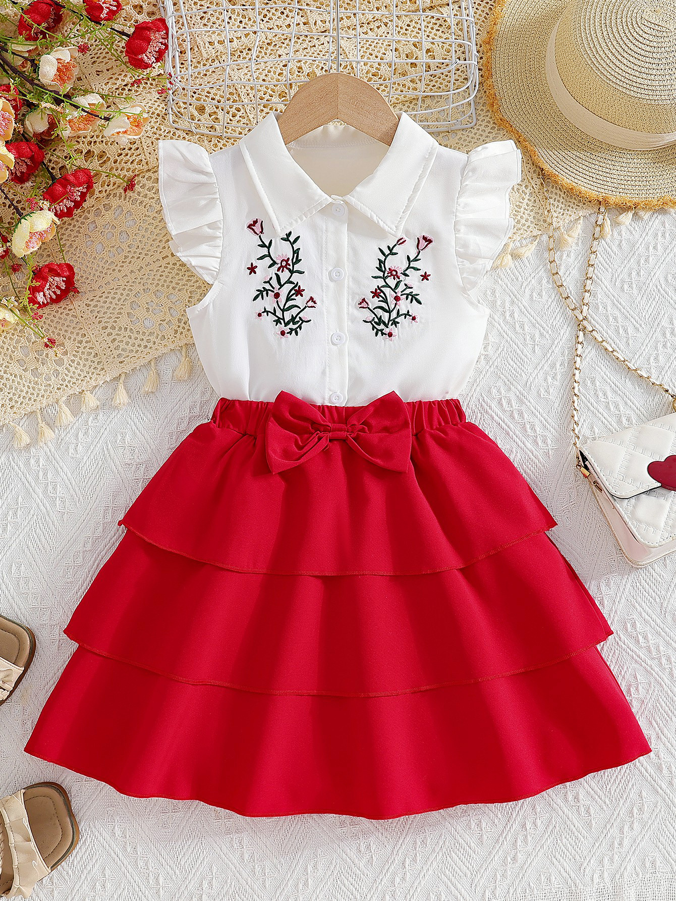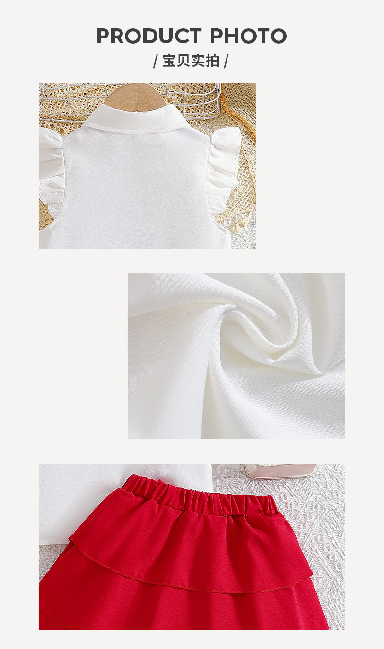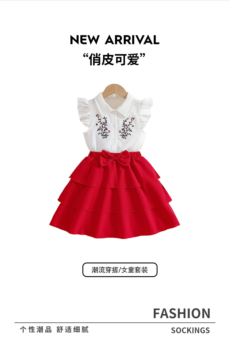 대외 무역 소녀 여름 치마 세트 옷깃 플라잉 슬리브 프린트 탑 레드 케이크 스커트 어린이 투피스 세트