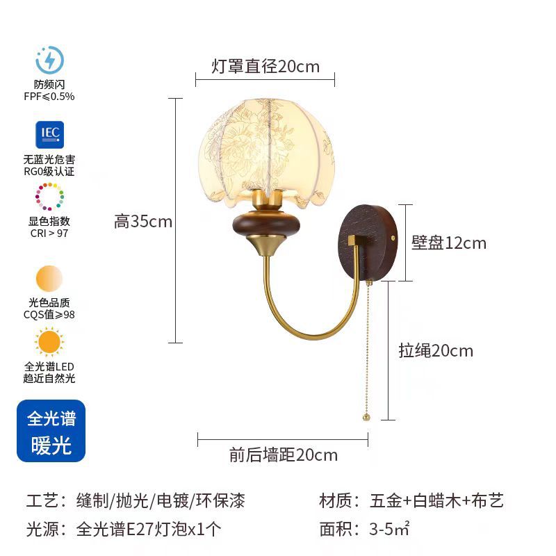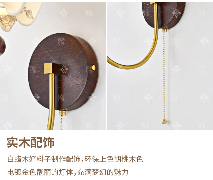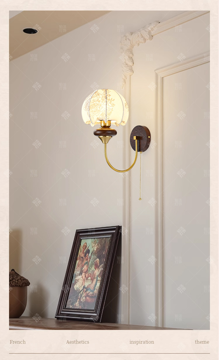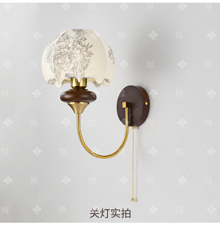 프랑스 중간 고대 벽 램프 침실 침실 램프 미국 복고풍 패턴 원단 거실 단단한 나무 램프 풀 와이어 스위치