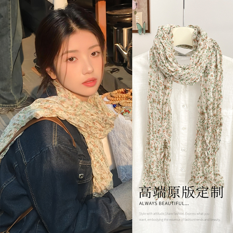 여성을 위한 목가적 작은 꽃무늬 면 및 린넨 스카프, 작은 신선한 주름 긴 실크 스카프, 얇은 목 보호대, 목 스카프, 문학적 스타일