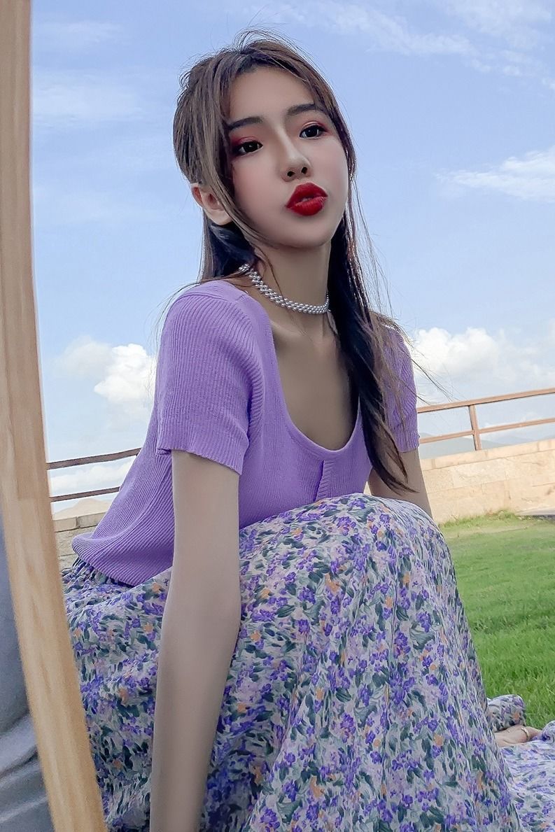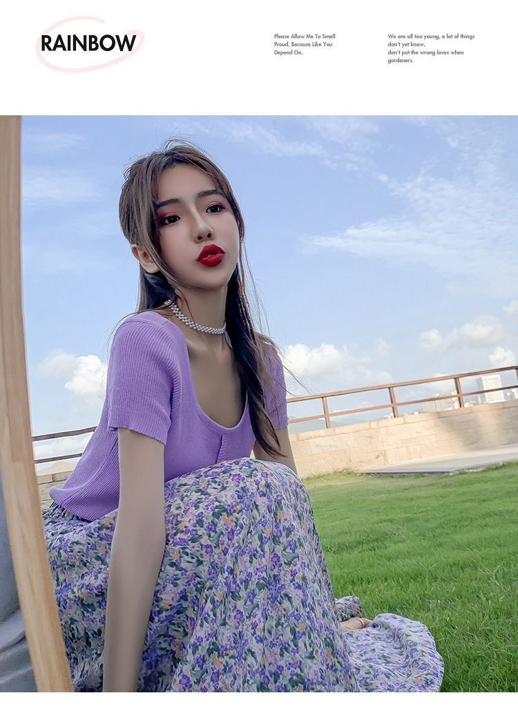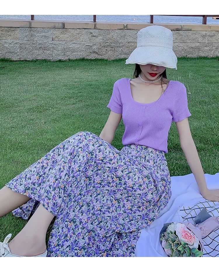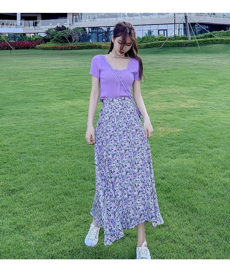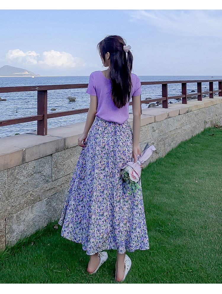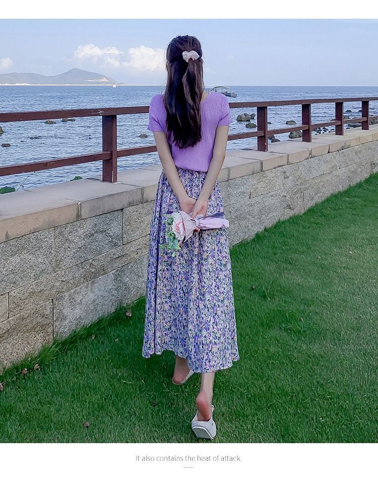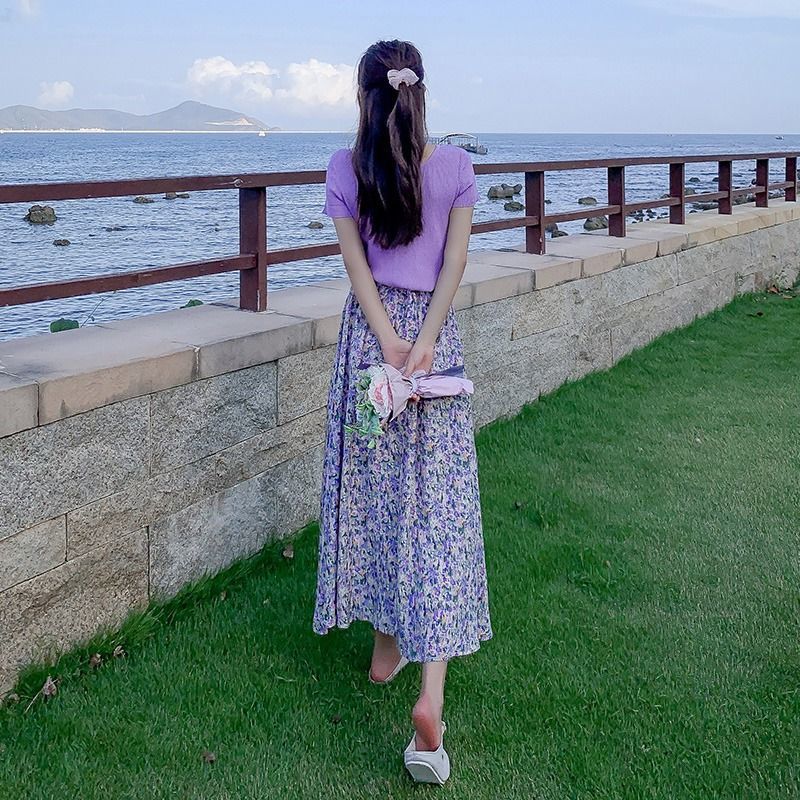 보라색 꽃 인쇄 치마 여성용 신선한 프린트 치마 헵번 스타일 슈퍼 페어리 모리 스타일 높은 허리 슬리밍 긴 원피스 트렌디스토어 가기