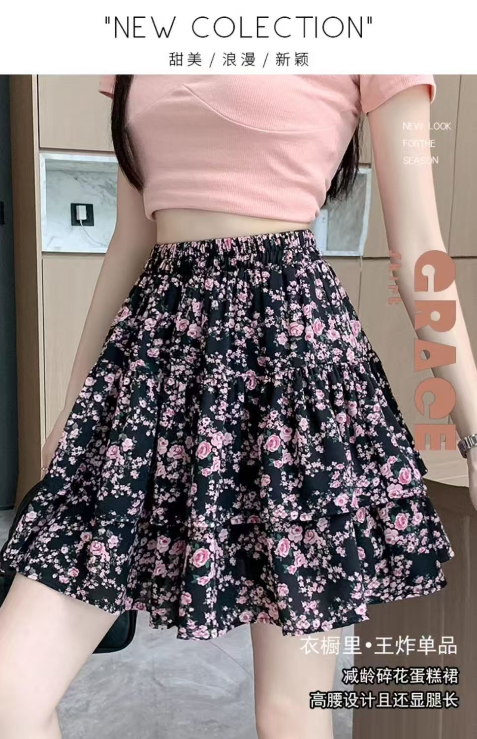 검은 치마 꽃 치마 여름 2025 새로운 높은 허리 케이크