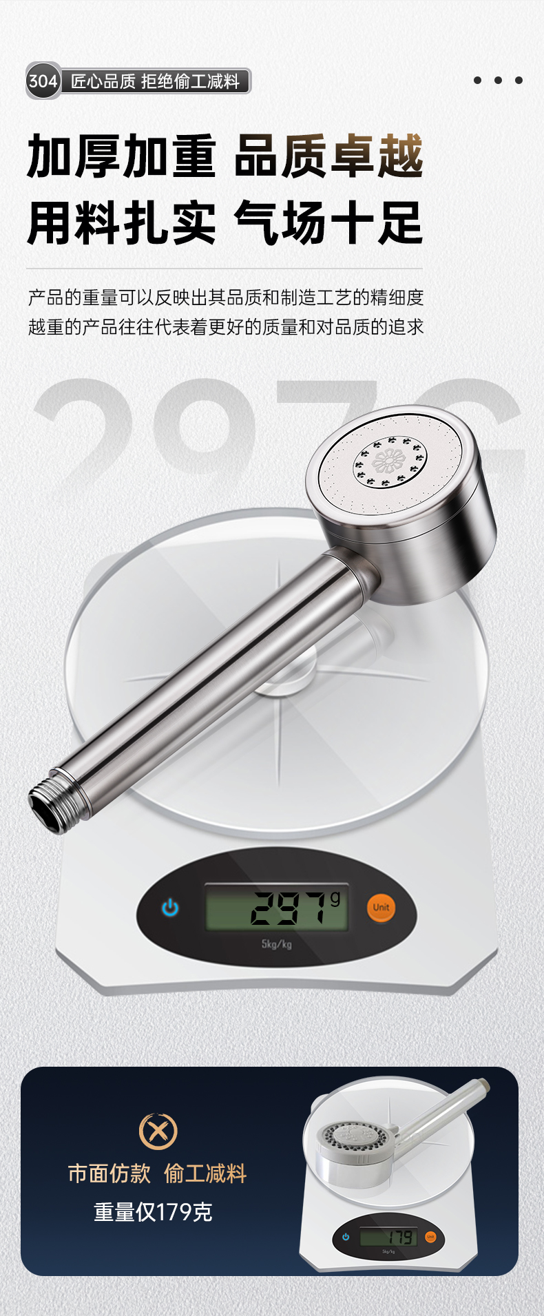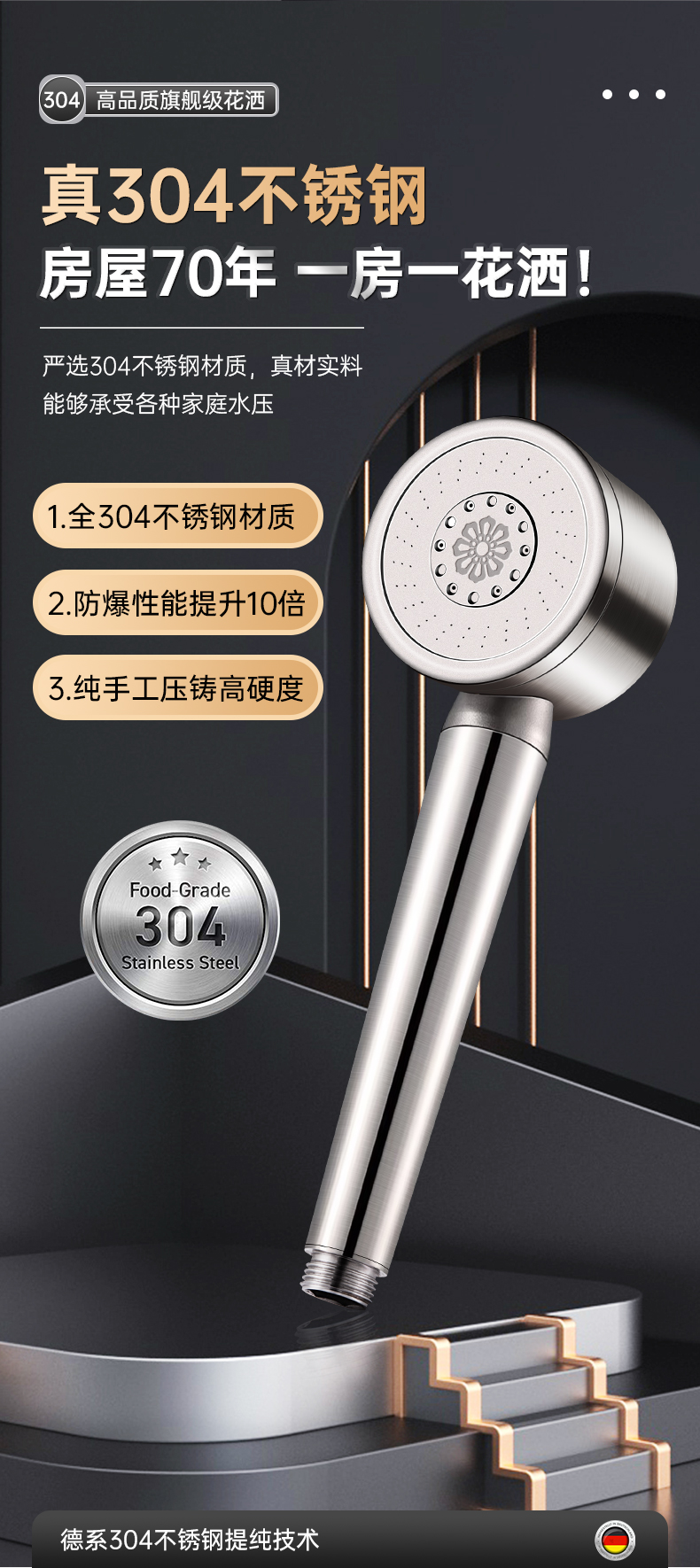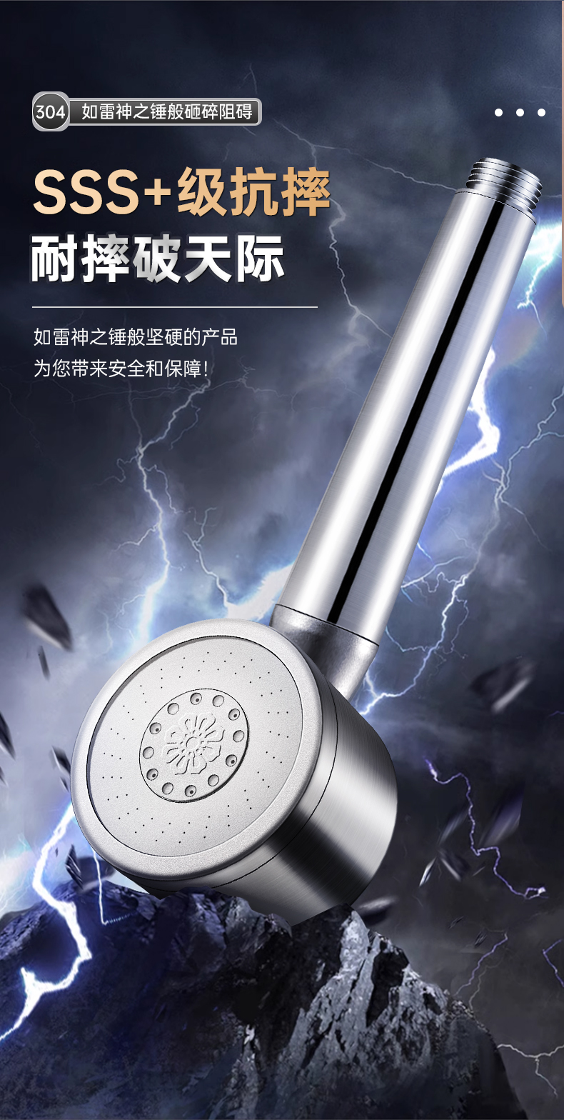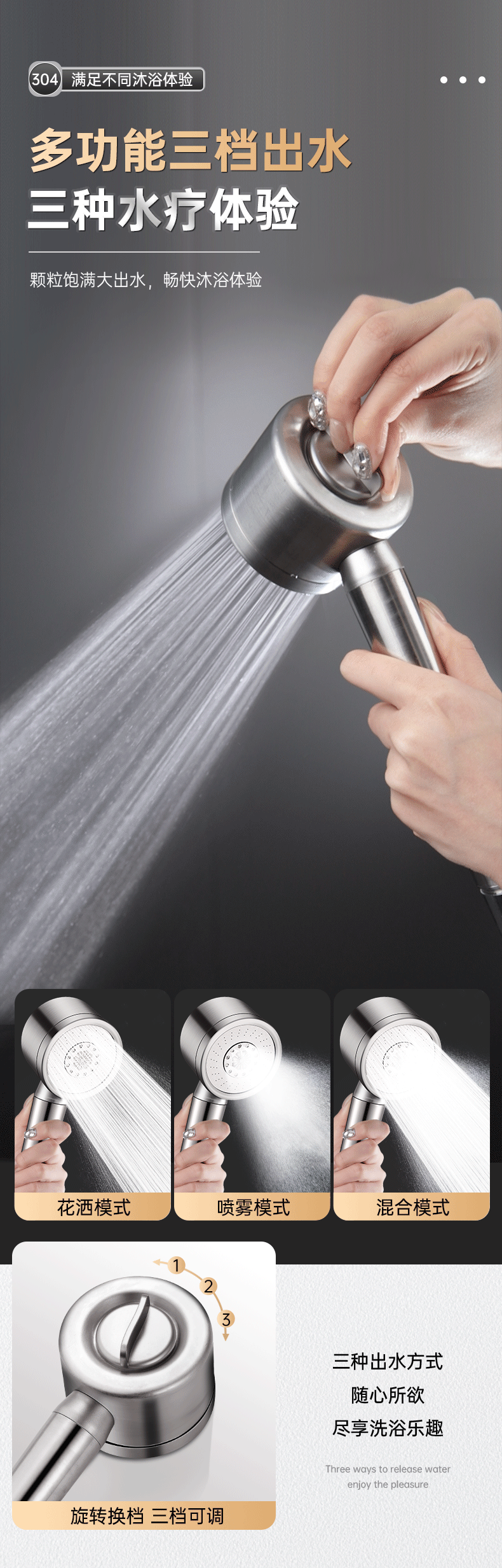 • 브러시드 실버 [두꺼운 304 스테인레스 스틸] 3단 강력한 슈퍼차저 샤워 헤드