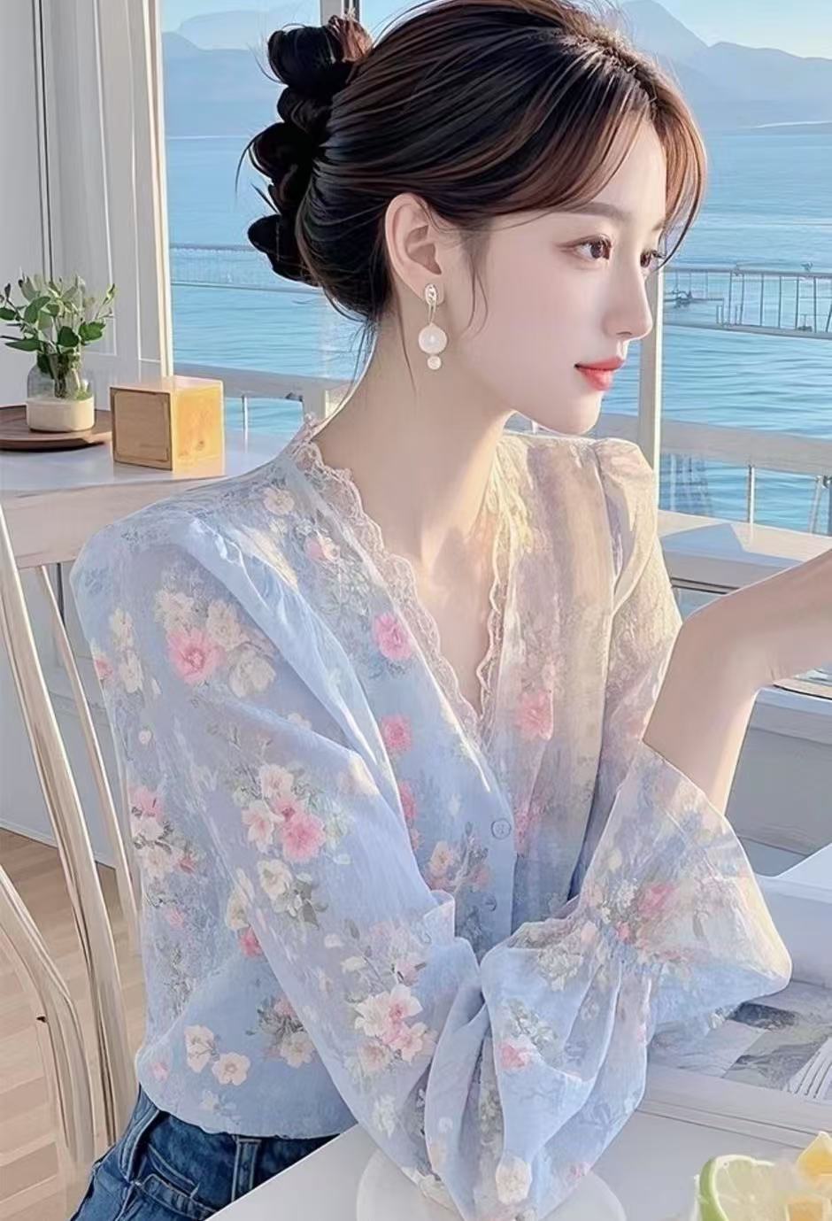프랑스 하이 엔드 센스 블루 플로랄 긴팔 쉬폰 셔츠 여성의 봄 새로운 도착 빛 럭셔리 서양식 아름다운 탑스토어 가기