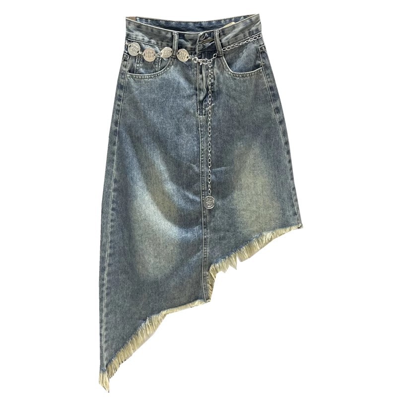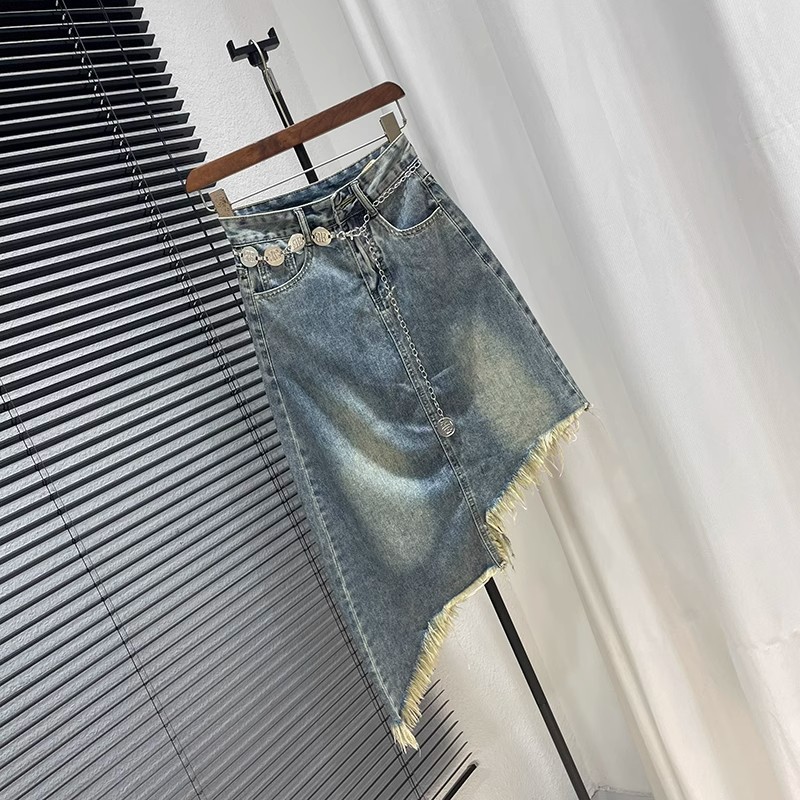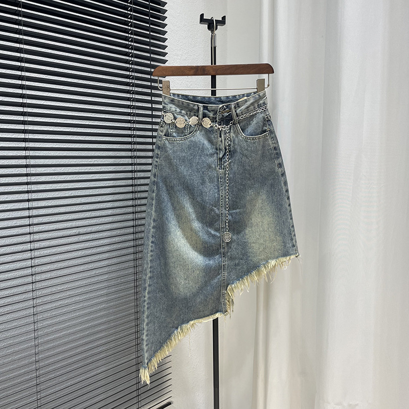 2025 여름 새로운 슬림핏 슬리밍 하이 웨이스트 레트로 불규칙한 데님 스커트 여성용 A 라인 힙 스커트 얇은스토어 가기