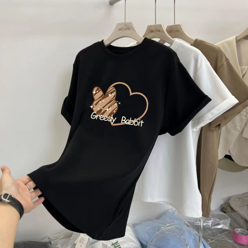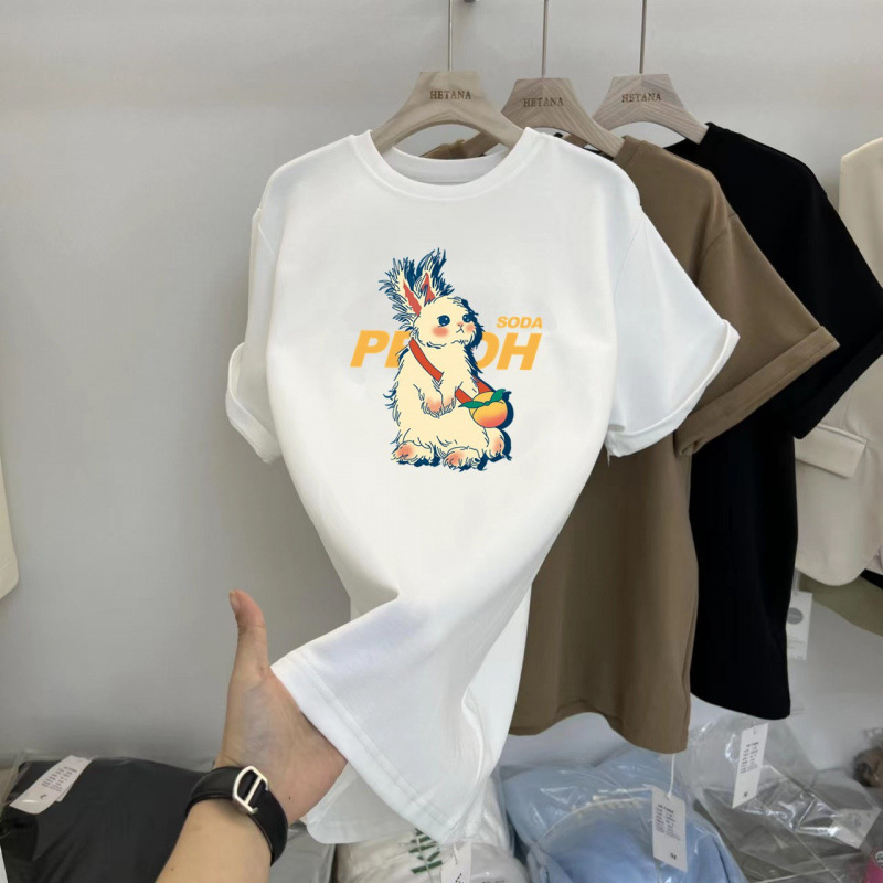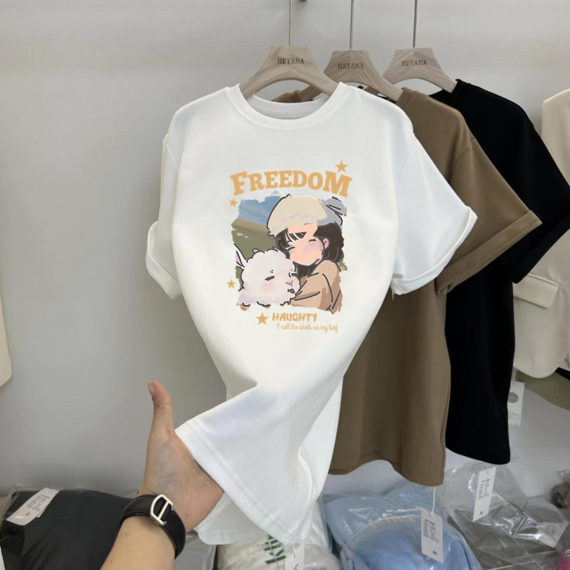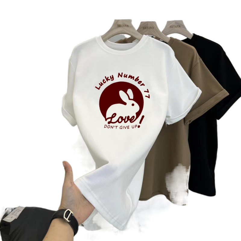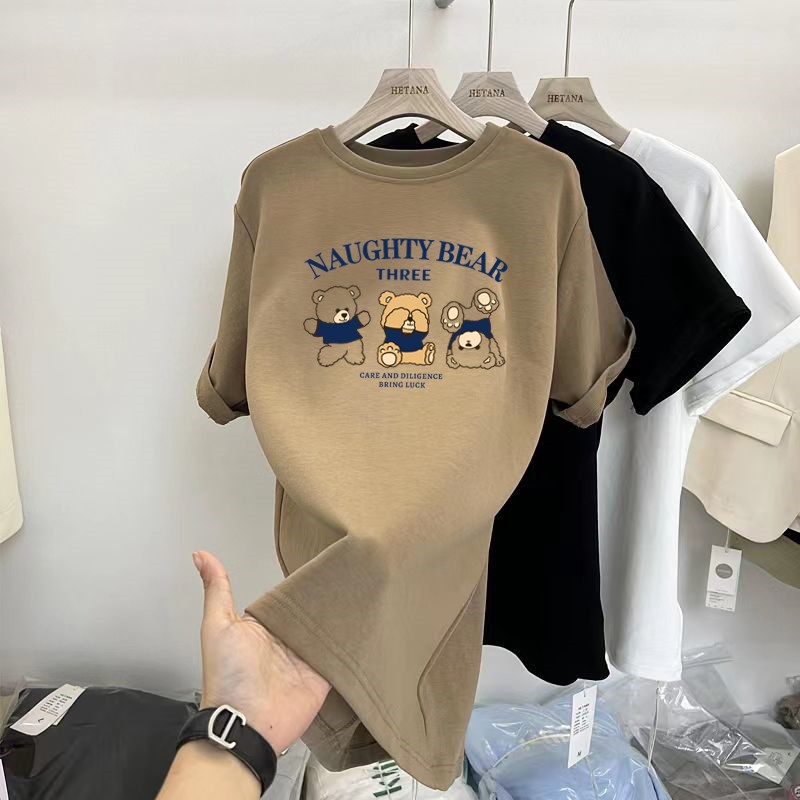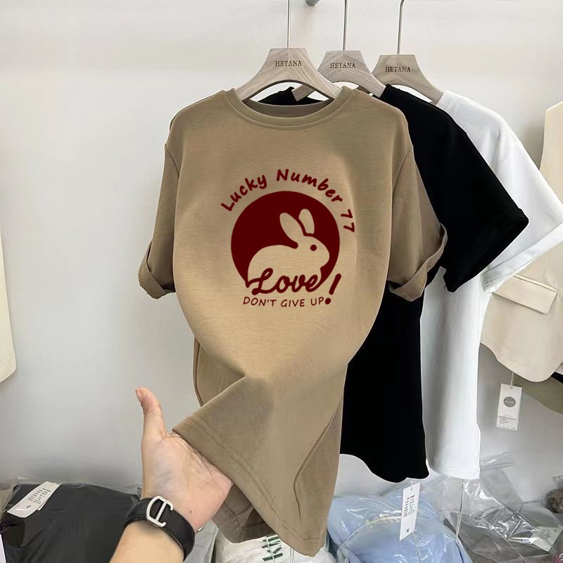 중간 길이의 반팔 티셔츠 여성용 엉덩이 커버 상어 바지 탑 루즈 코튼 토끼 다크 브라운 반소매 베이스 셔츠스토어 가기