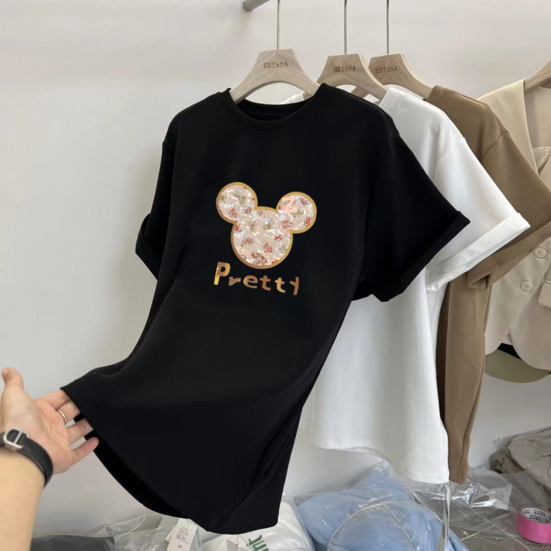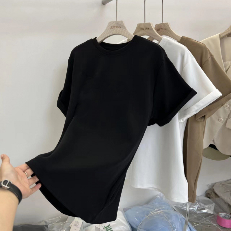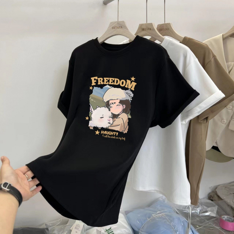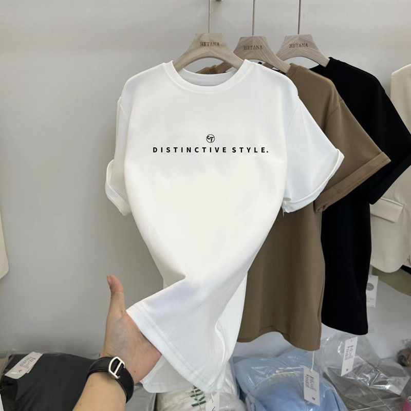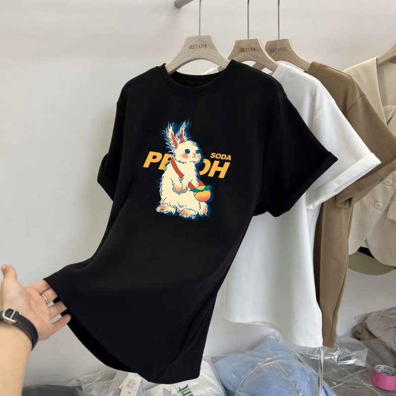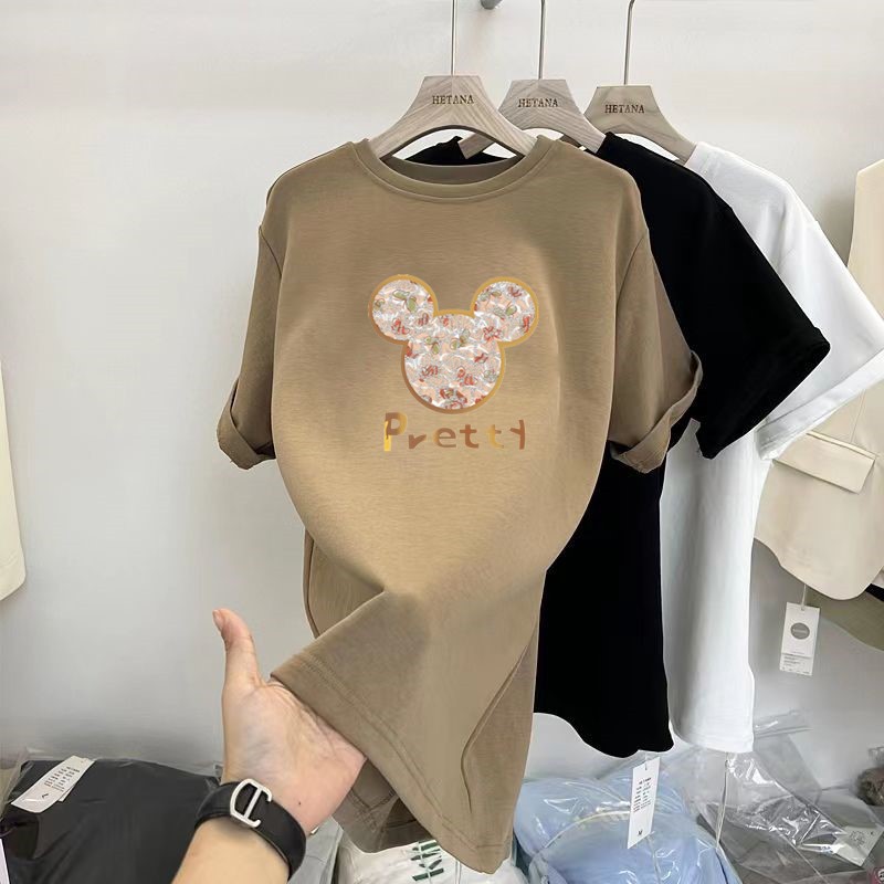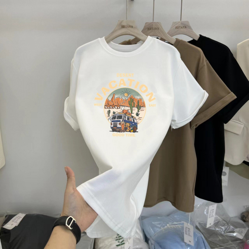 중간 길이의 반팔 티셔츠 여성용 엉덩이 커버 상어 바지 탑 루즈 코튼 토끼 다크 브라운 반소매 베이스 셔츠스토어 가기