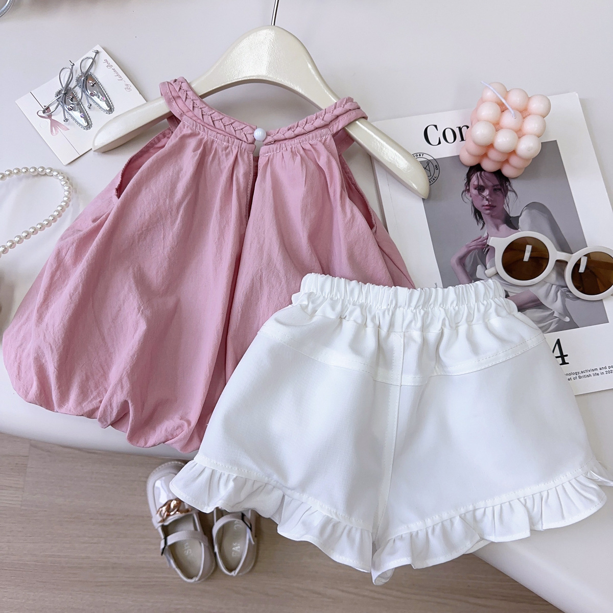 여자 달콤한 정장 여름 새 여자 아기 홀터넥 조끼 탑 프릴 반바지 정장스토어 가기