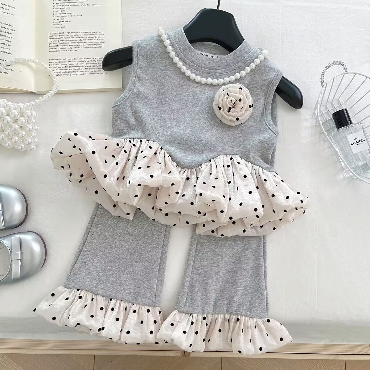 소녀 세트 여름 2025 새로운 도착 민소매 꽃 공주 티셔츠 탑 폴로 도트 레이스 플래 바지 얇은스토어 가기