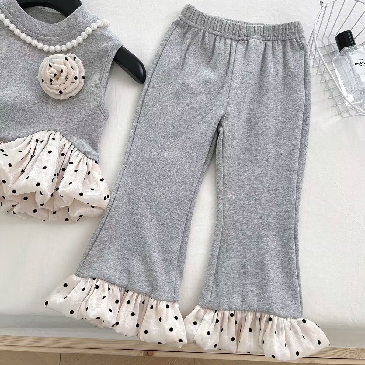 소녀 세트 여름 2025 새로운 도착 민소매 꽃 공주 티셔츠 탑 폴로 도트 레이스 플래 바지 얇은