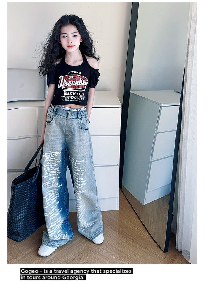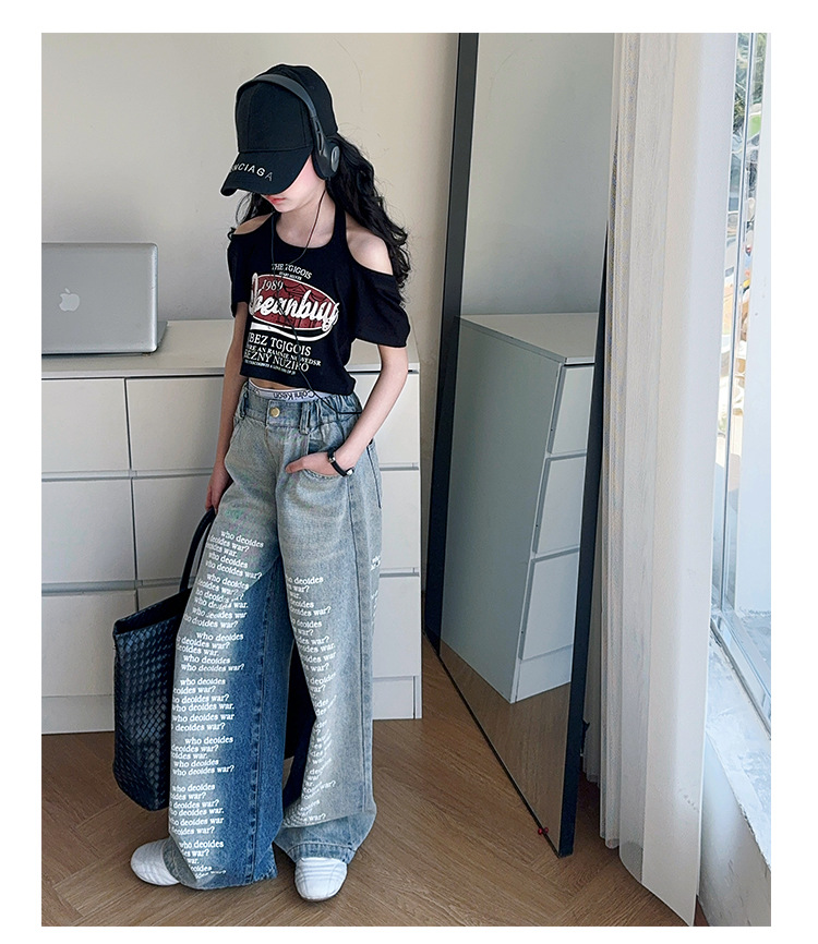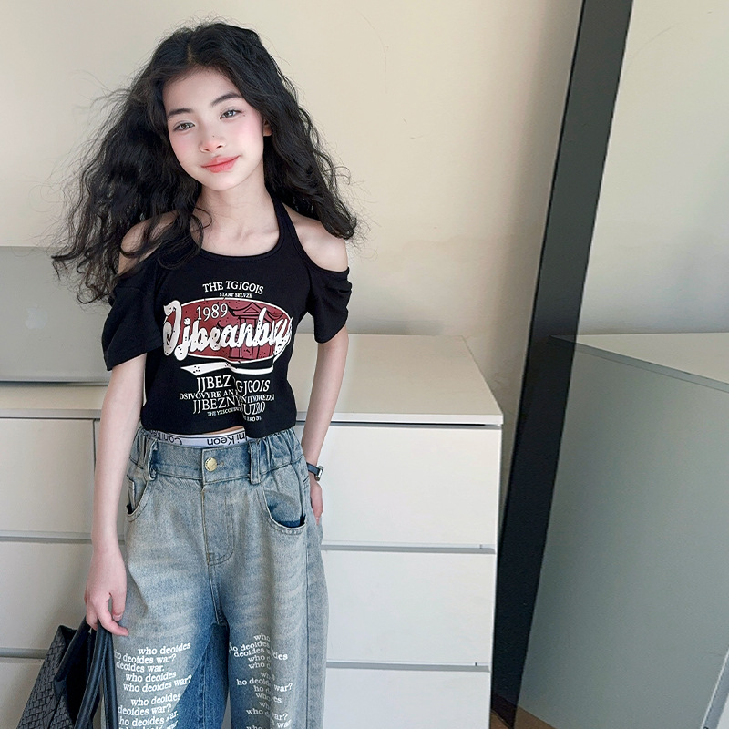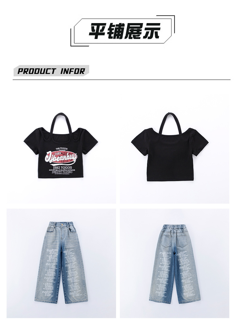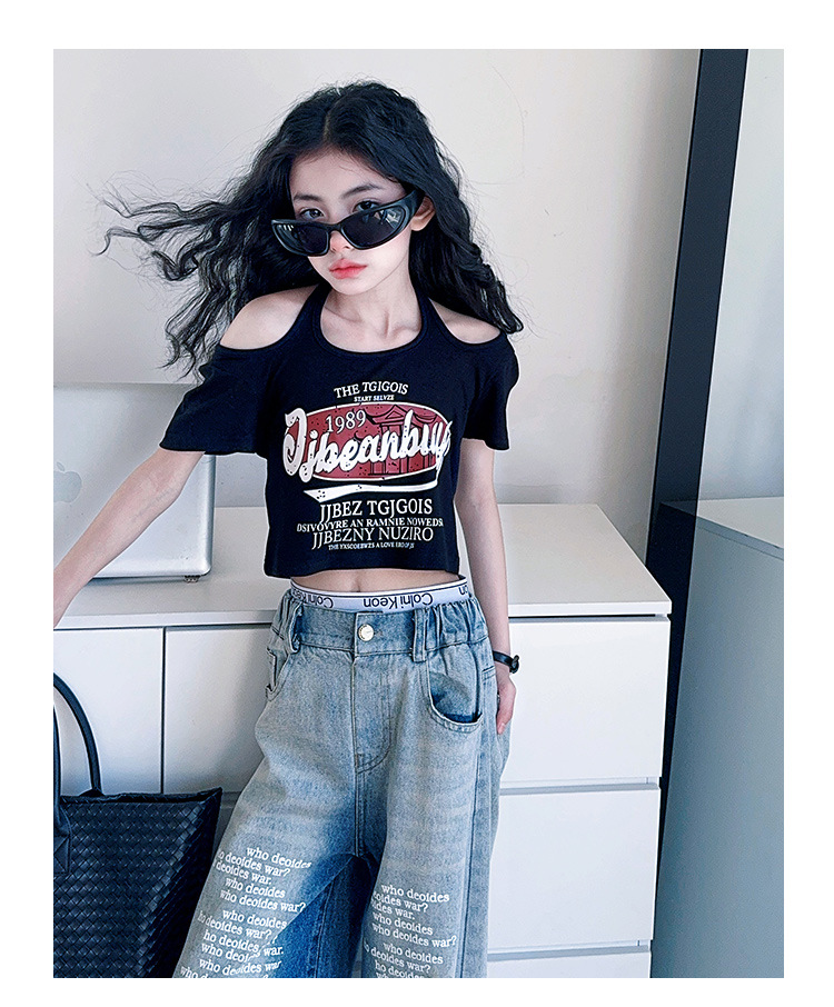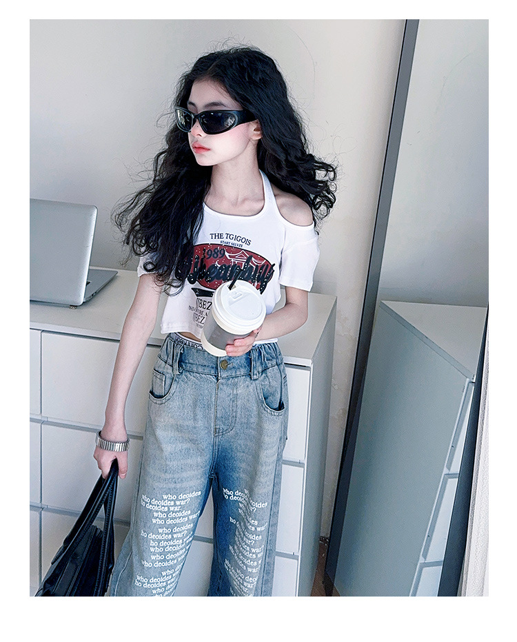 크로스보더 레트로 핫걸 쇼트 홀터넥 탑 틈새 반팔 티셔츠 여아 여름 레터 와이드 레그 청바지 세트스토어 가기