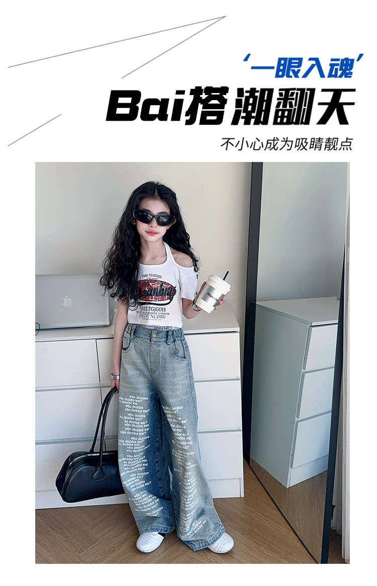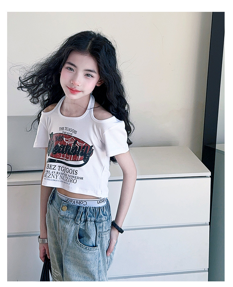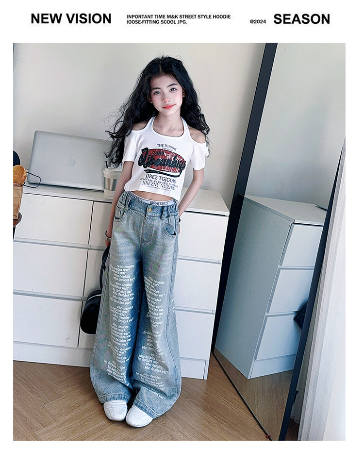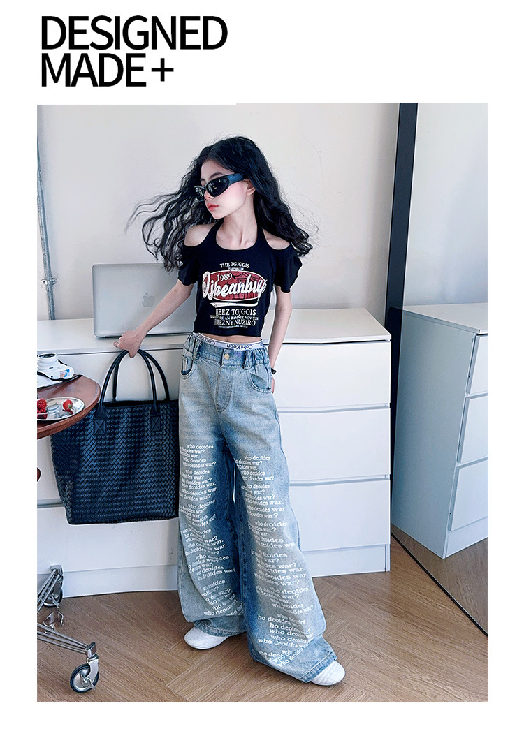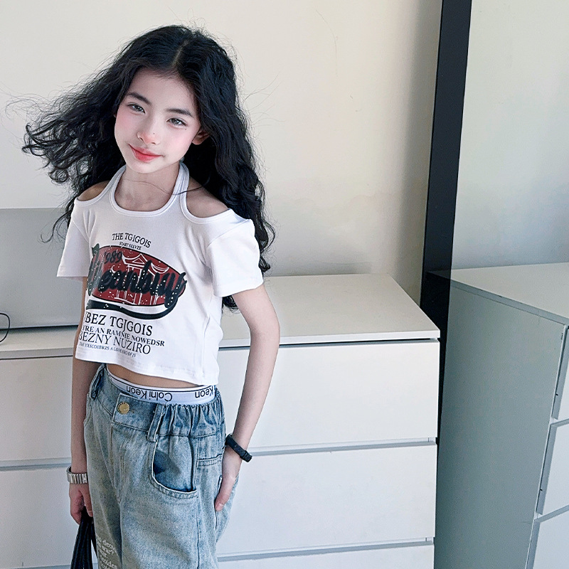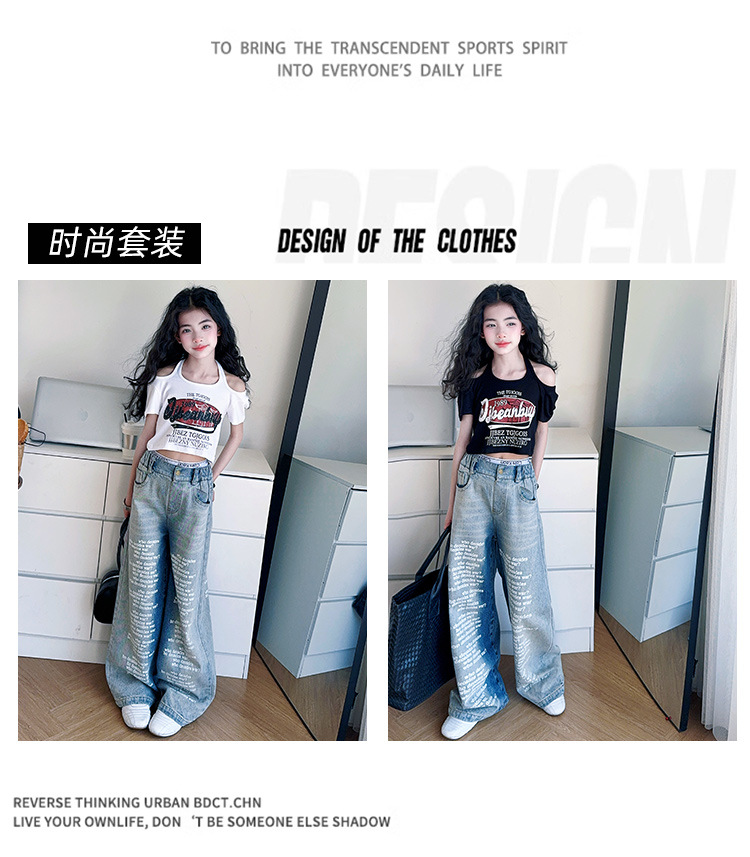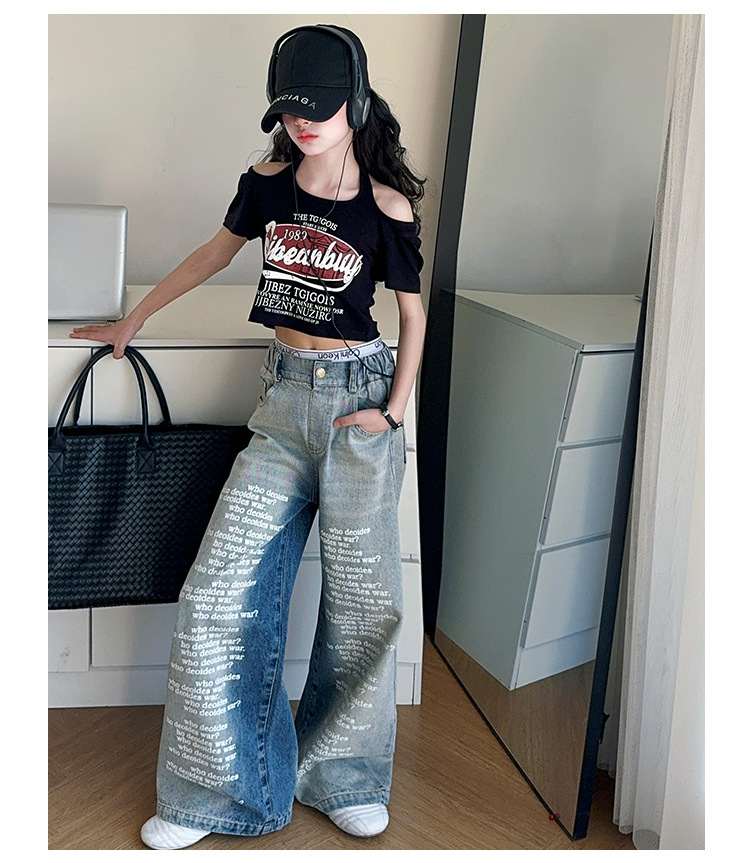 크로스보더 레트로 핫걸 쇼트 홀터넥 탑 틈새 반팔 티셔츠 여아 여름 레터 와이드 레그 청바지 세트스토어 가기