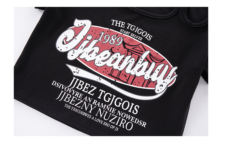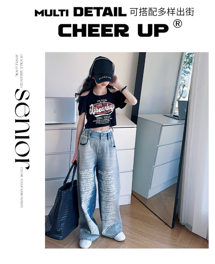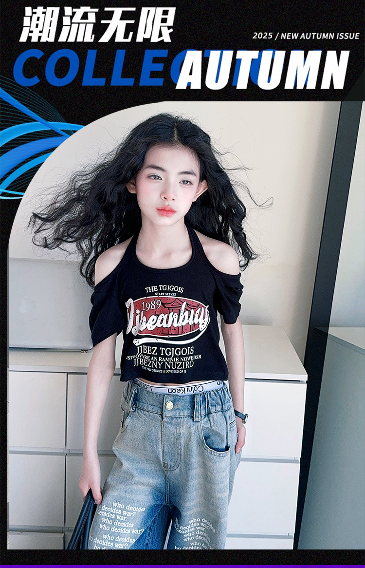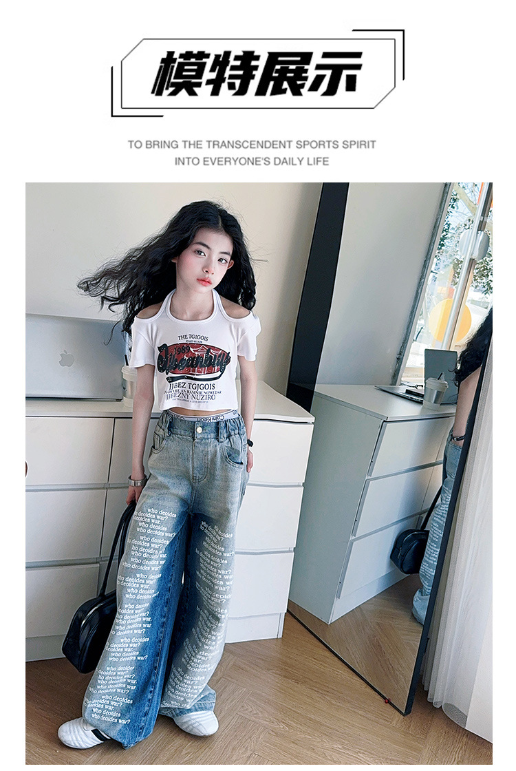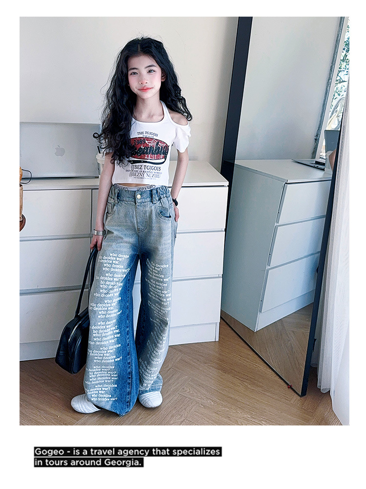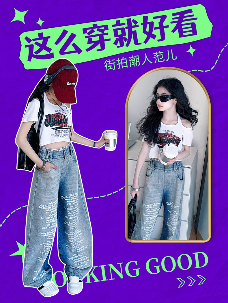 크로스보더 레트로 핫걸 쇼트 홀터넥 탑 틈새 반팔 티셔츠 여아 여름 레터 와이드 레그 청바지 세트스토어 가기