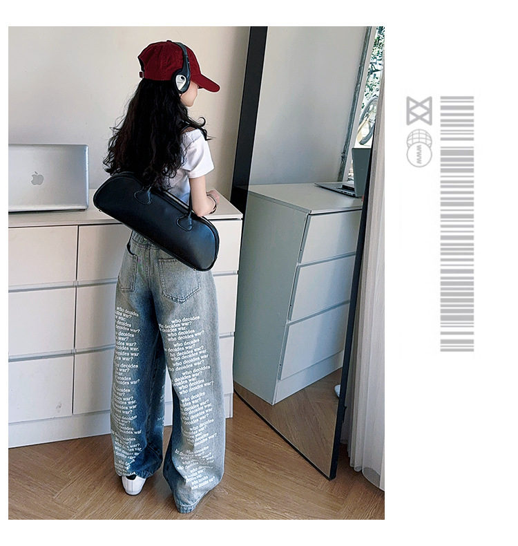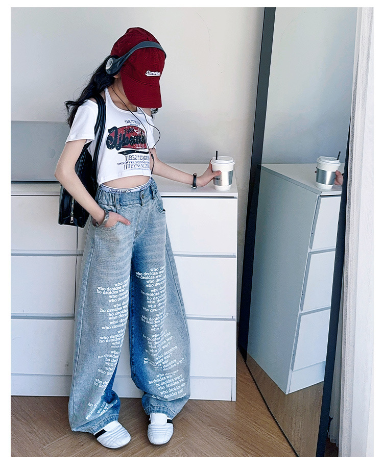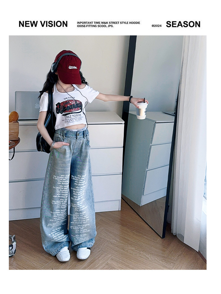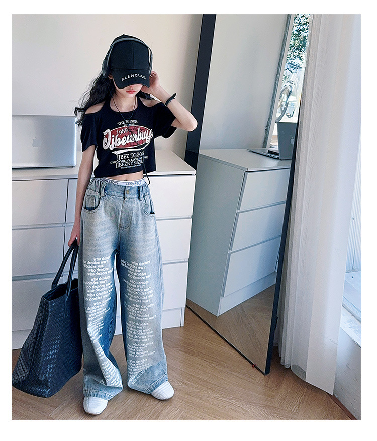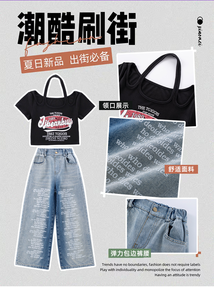 크로스보더 레트로 핫걸 쇼트 홀터넥 탑 틈새 반팔 티셔츠 여아 여름 레터 와이드 레그 청바지 세트