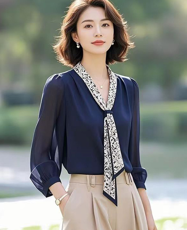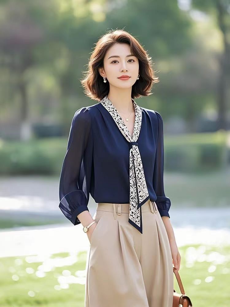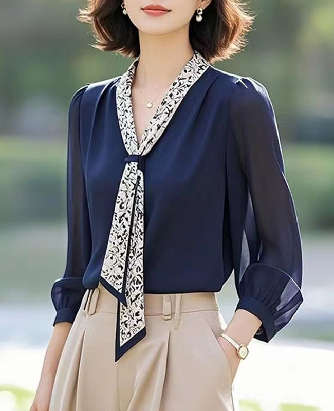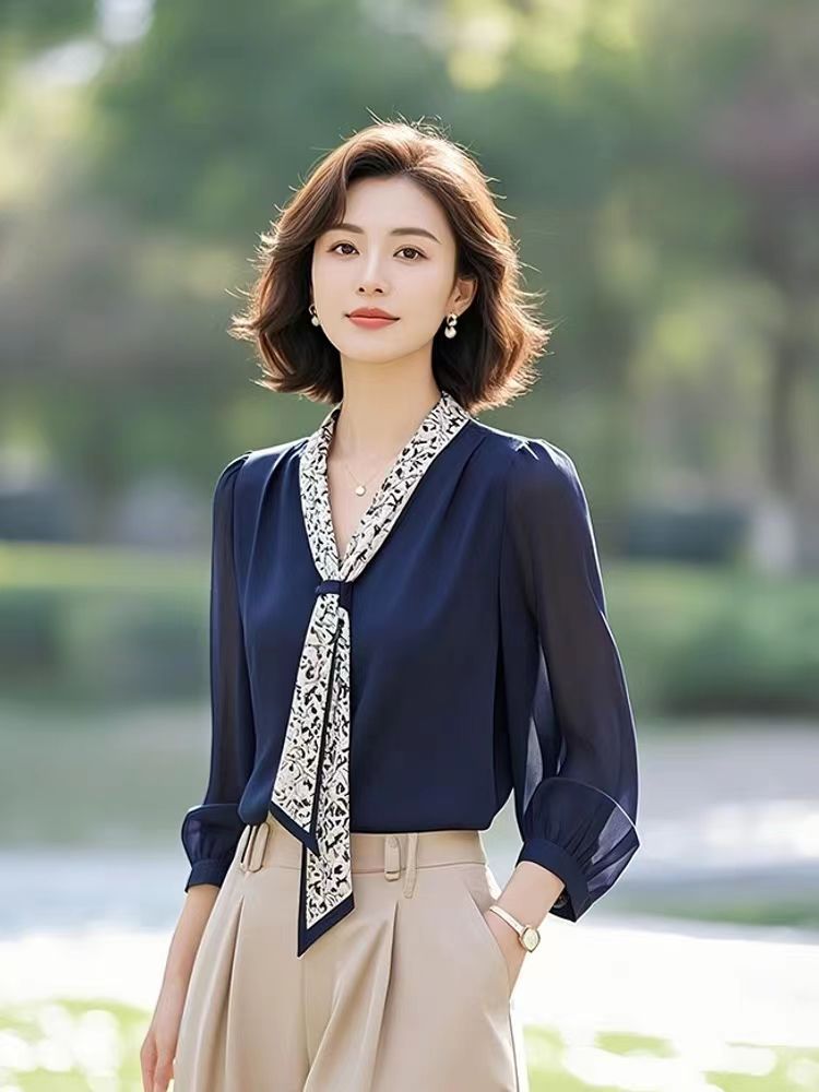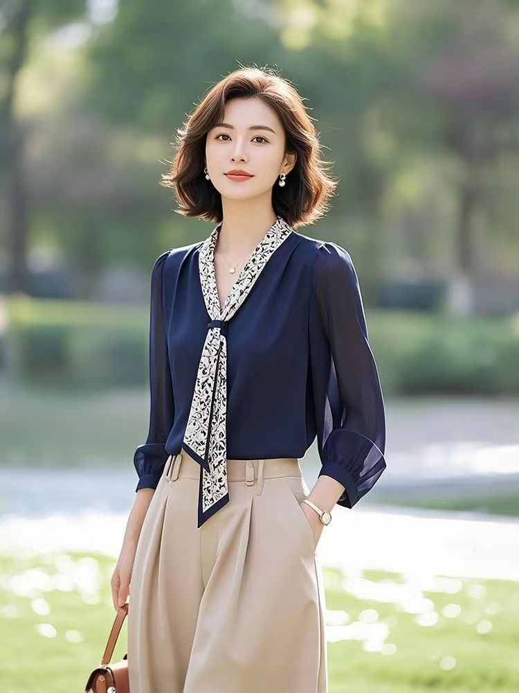 우아한 느슨한 서양 스타일 셔츠 슈퍼 잘 생긴 독특한 아름다운 푸른 스트리밍 쉬폰 셔츠 2025 새로운 여성의 봄스토어 가기