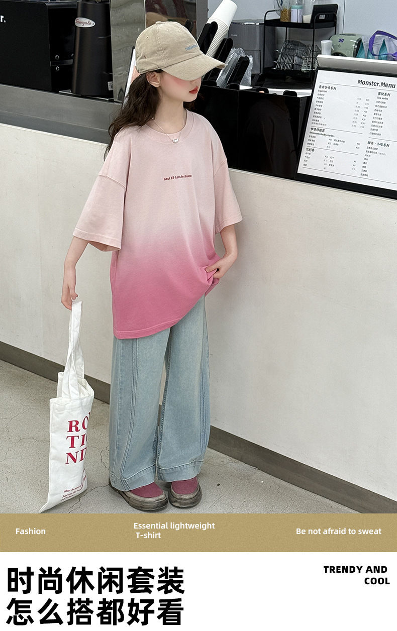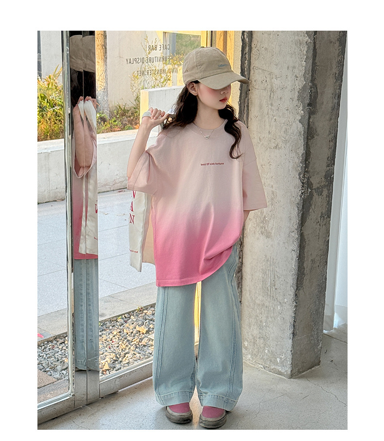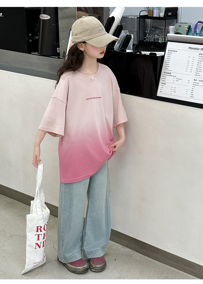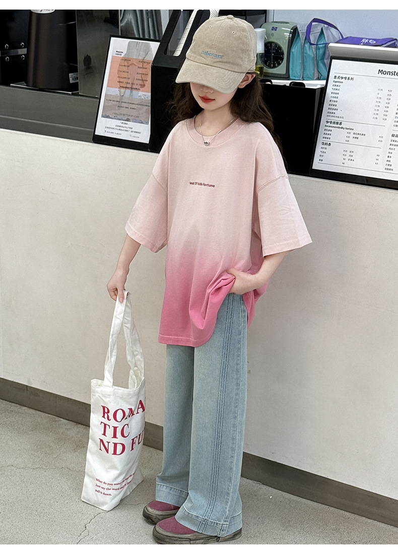 소녀 여름 반팔 티셔츠 2025 새로운 스타일 어린이 그라디언트 색상 변경 반팔 티셔츠 탑 큰 어린이 청바지