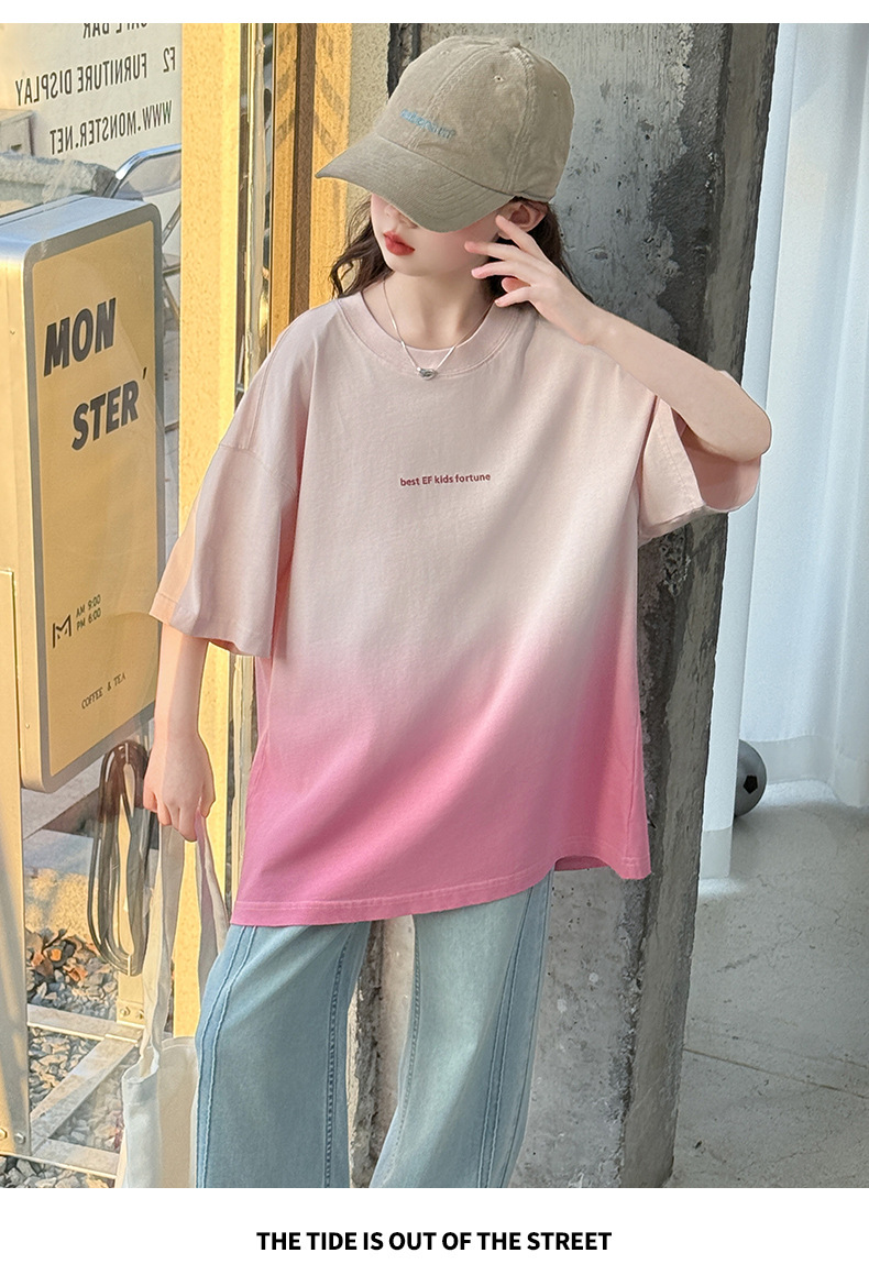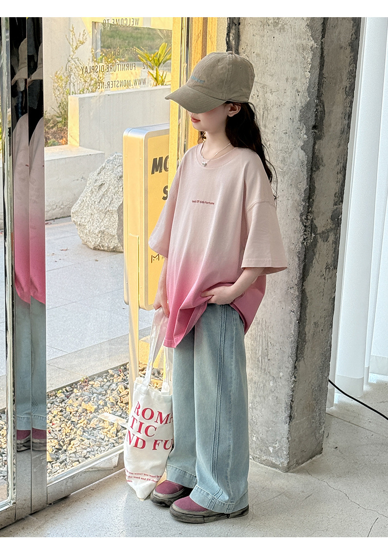 소녀 여름 반팔 티셔츠 2025 새로운 스타일 어린이 그라디언트 색상 변경 반팔 티셔츠 탑 큰 어린이 청바지스토어 가기