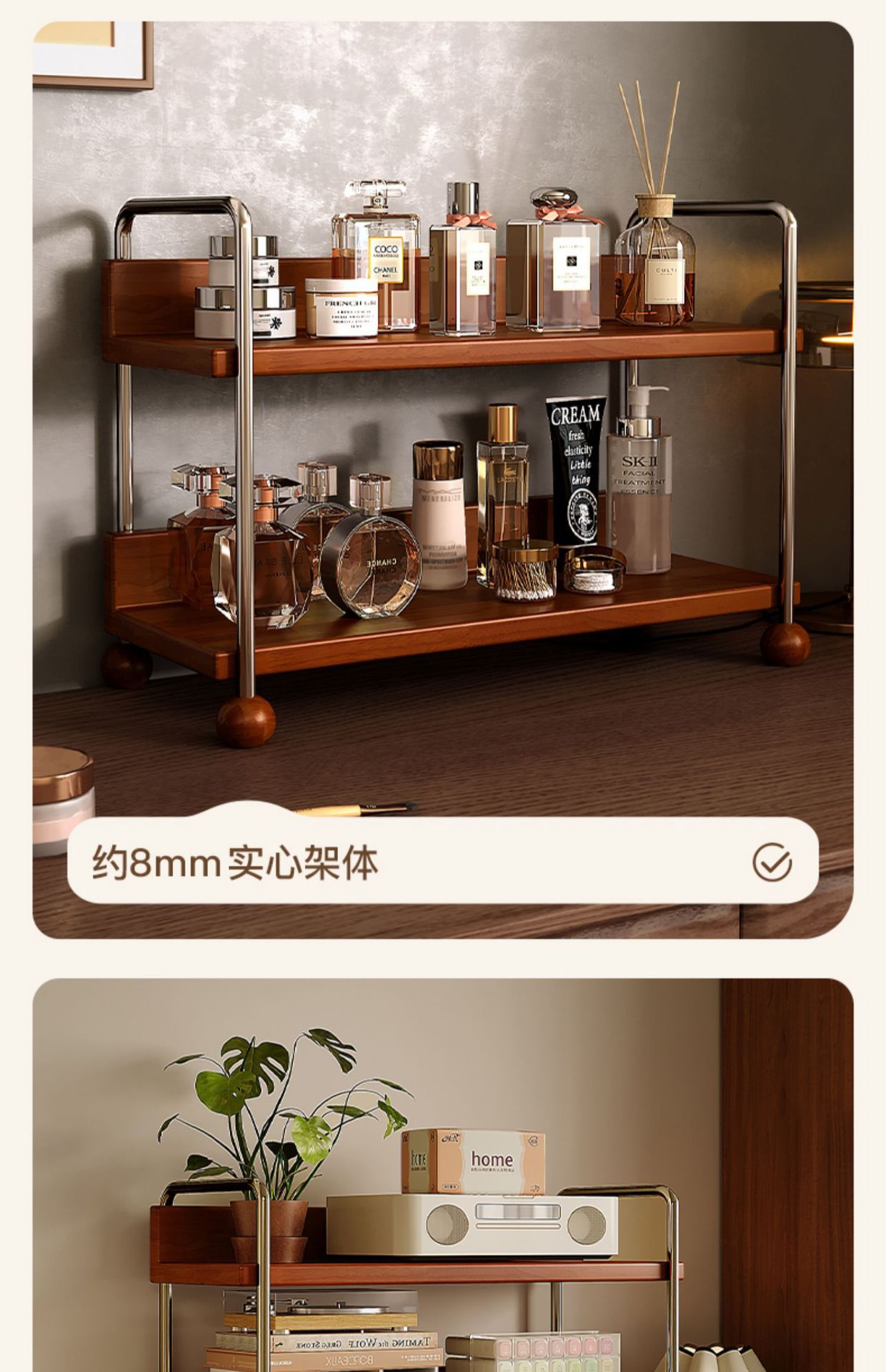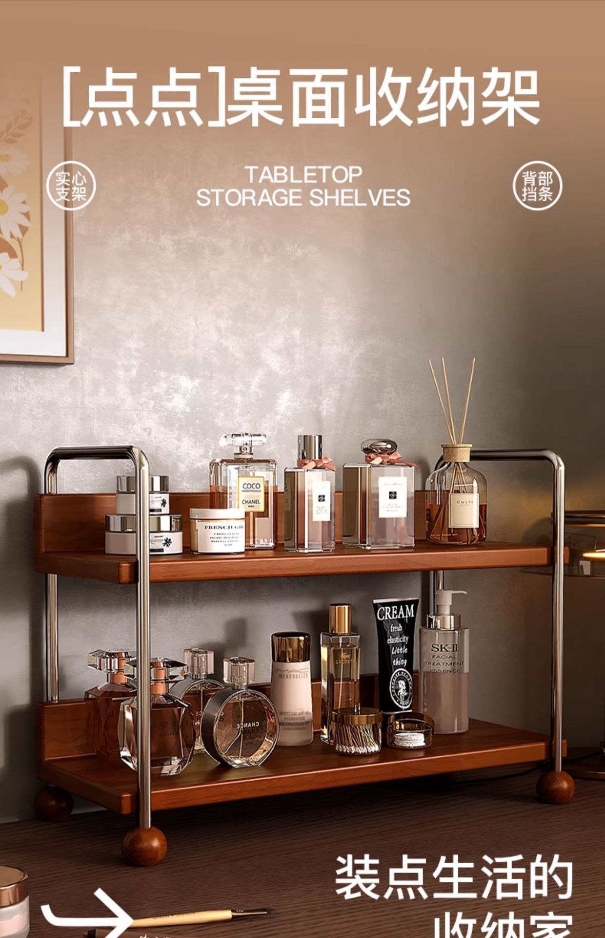 化妆品收纳盒梳妆桌面轻奢中古风实木多层高级护肤品香水置物架子