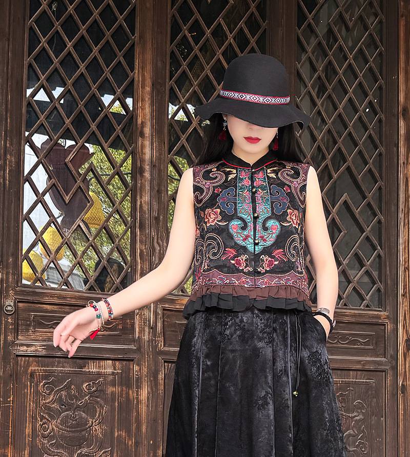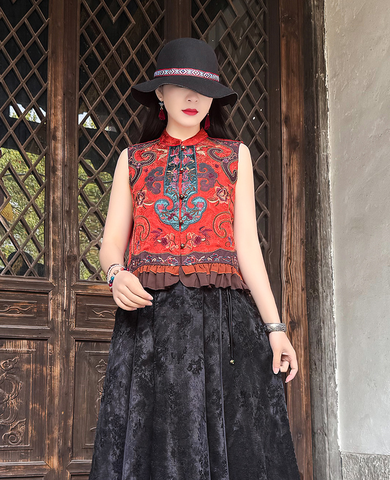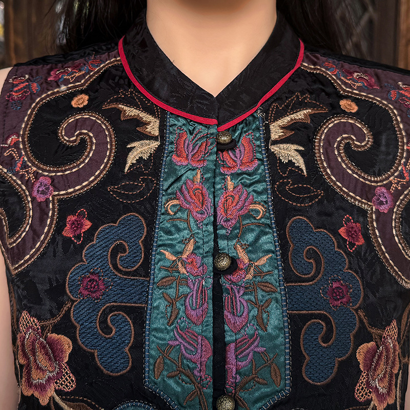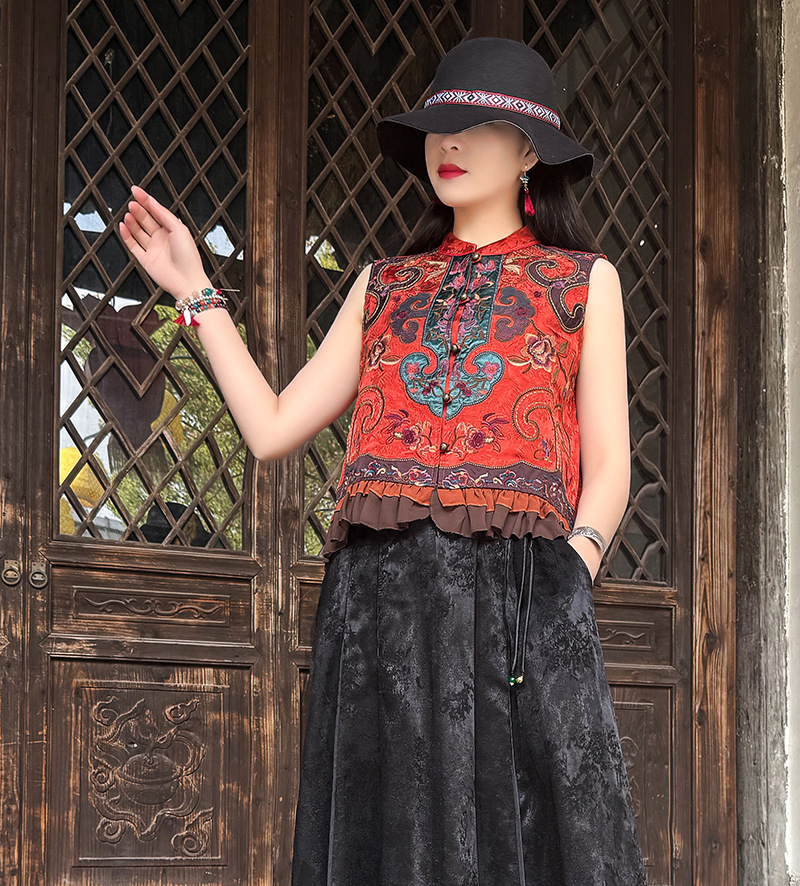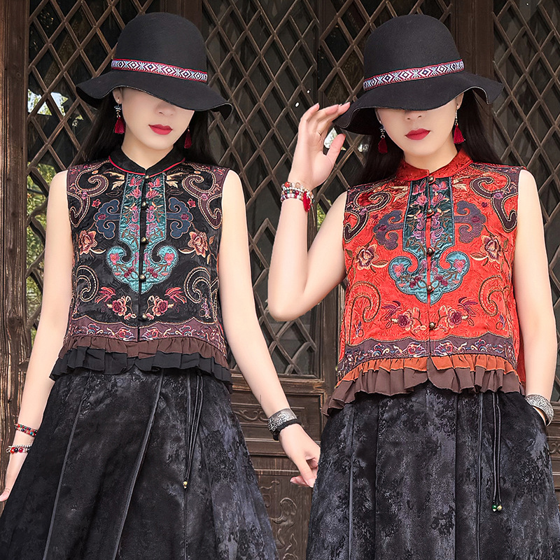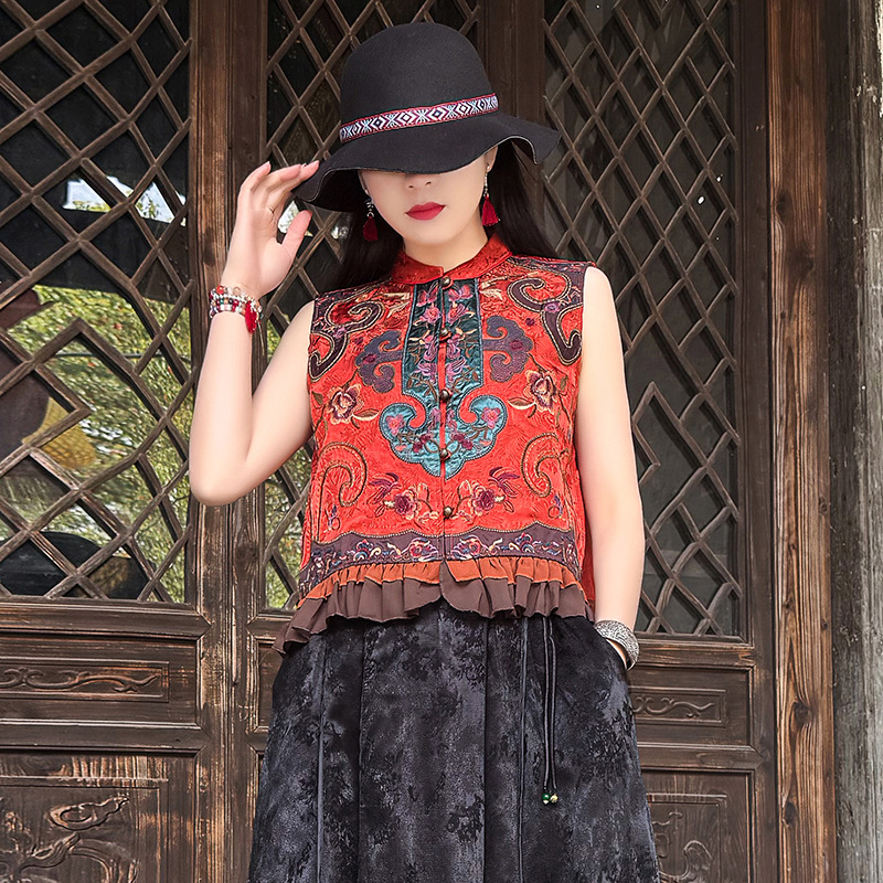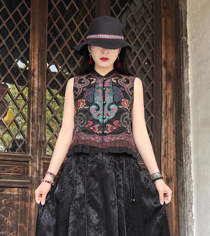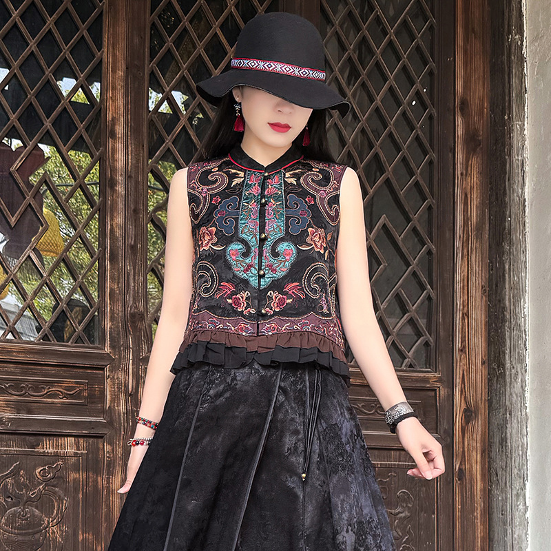 여성을위한 여름 얇은 조끼 민족 스타일 수 놓은 조끼 짧은 스타일 경량 통기성 중국 스타일 스탠드 칼라 대형 탑 여성 의류스토어 가기