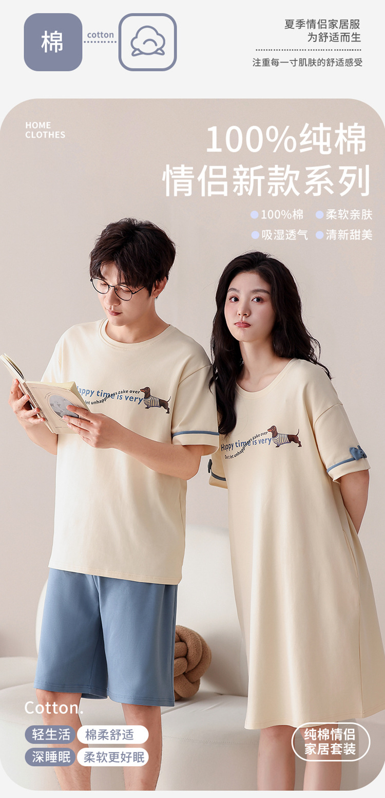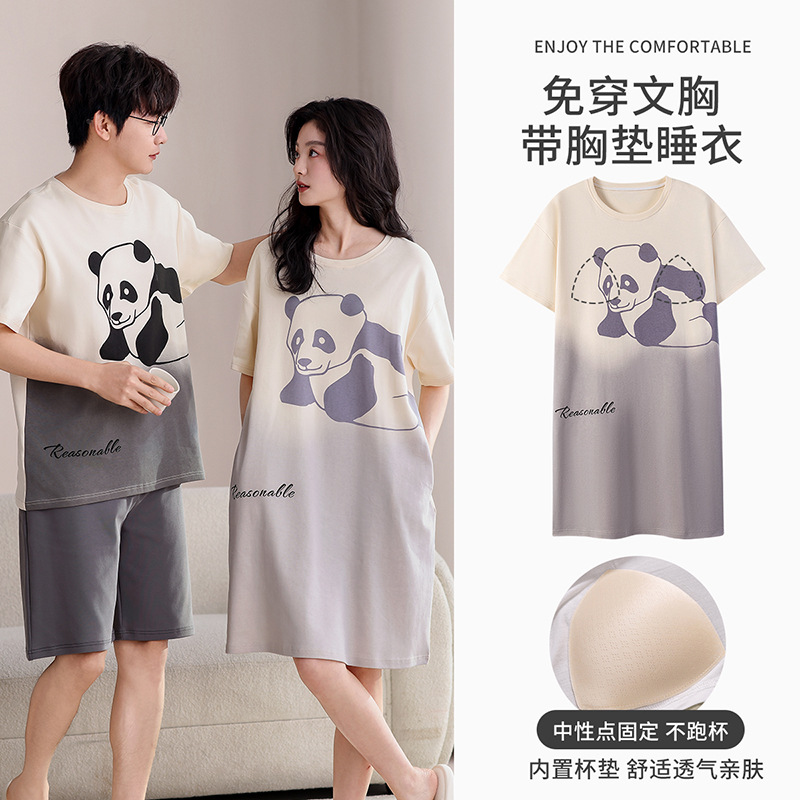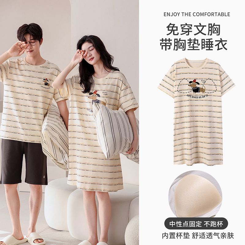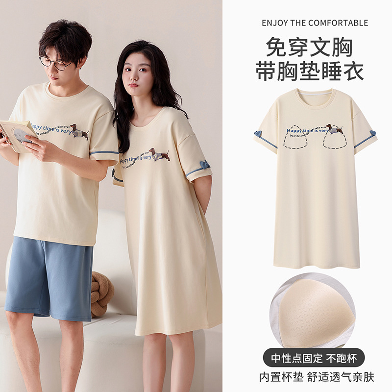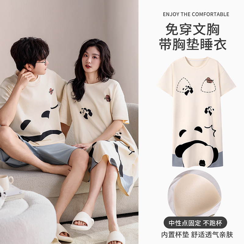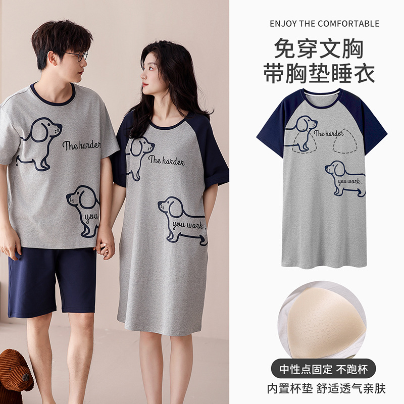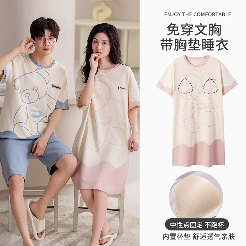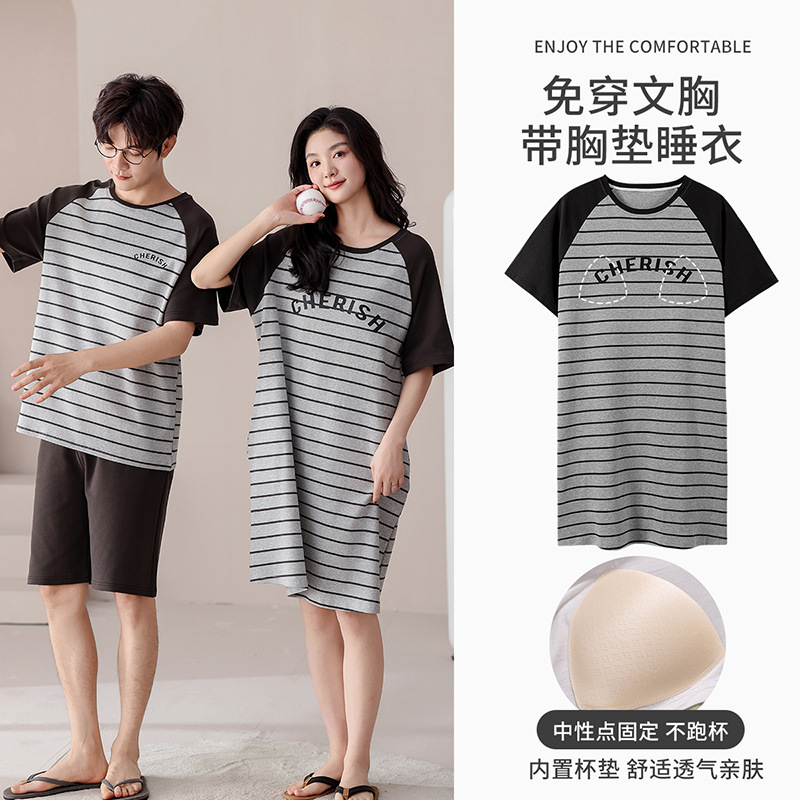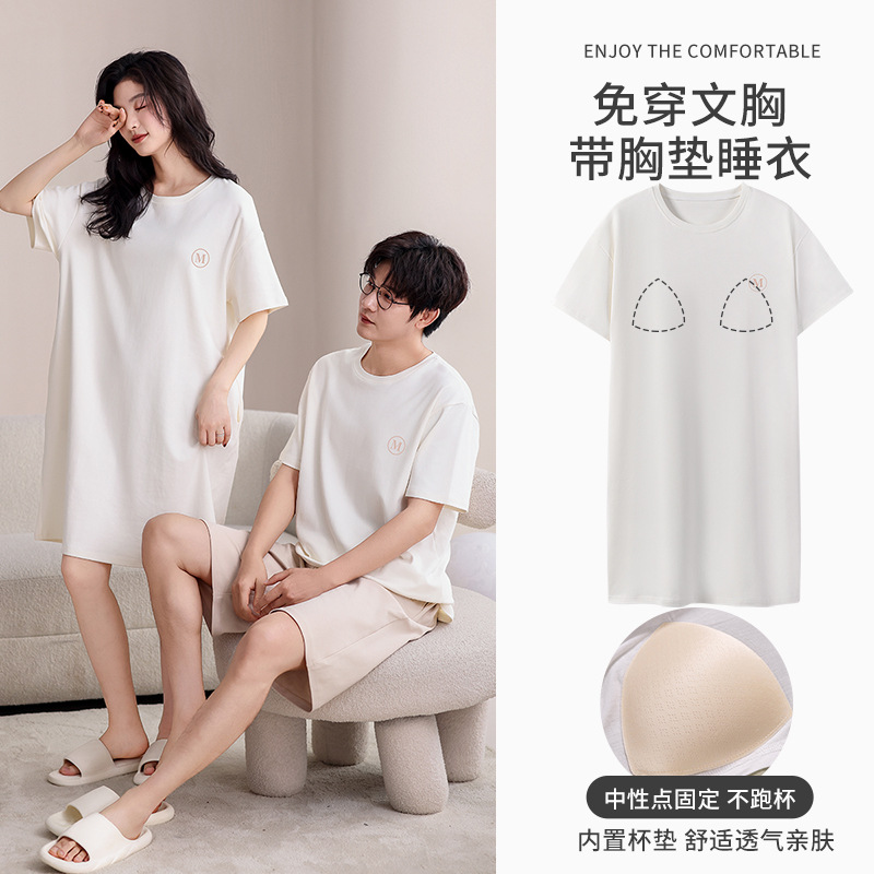 커플 잠옷 여름 항균 순수 코튼 얇은 가슴 패드 반팔 잠옷 여성 캐주얼 라운드 넥 남성 홈웨어 세트스토어 가기