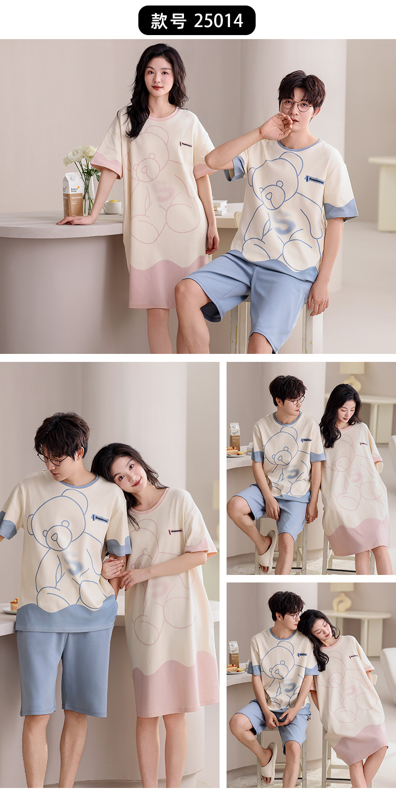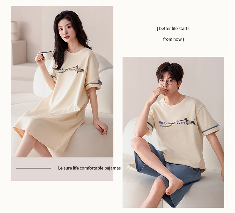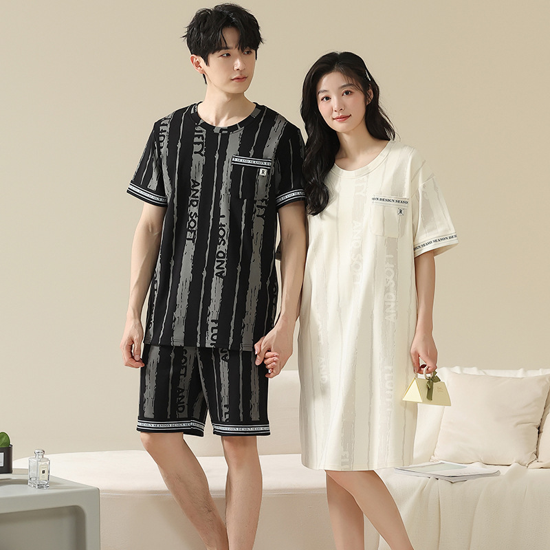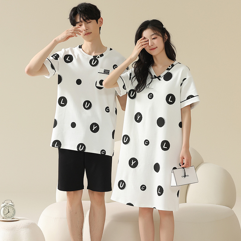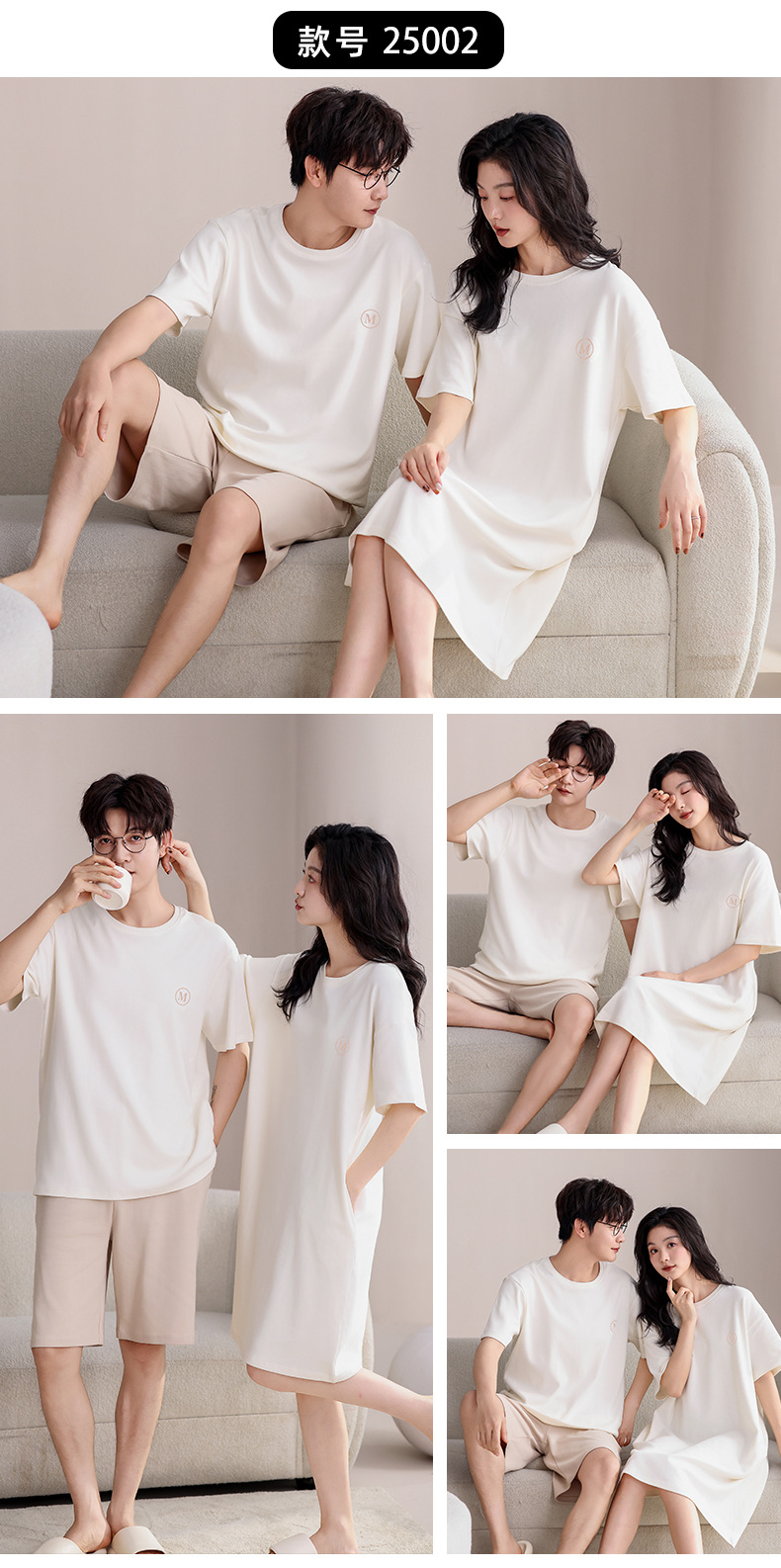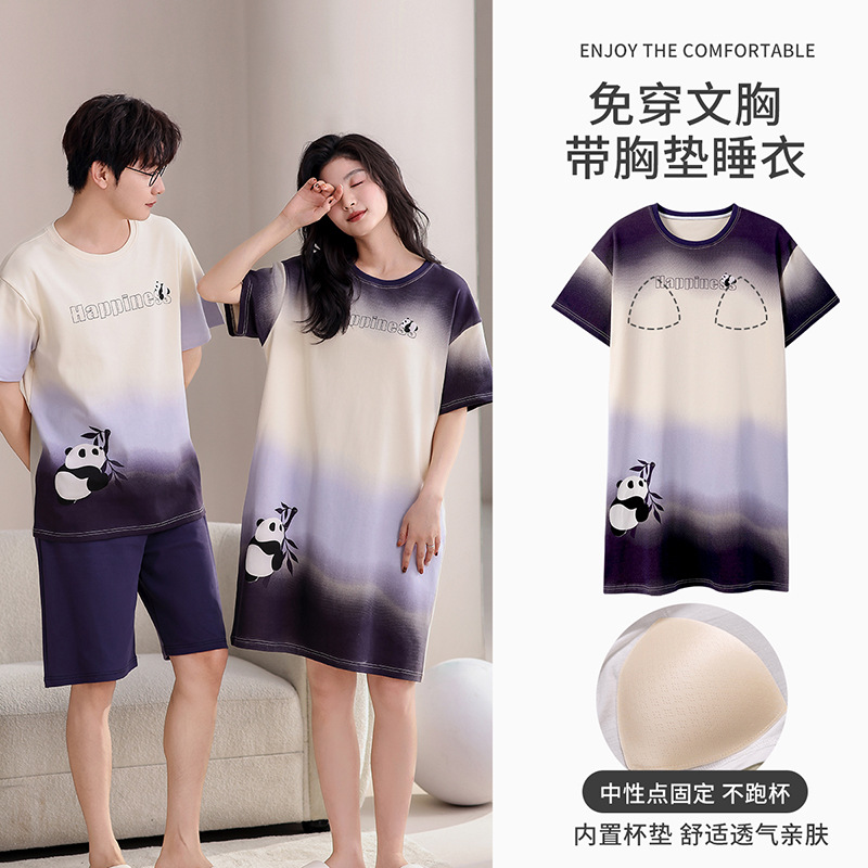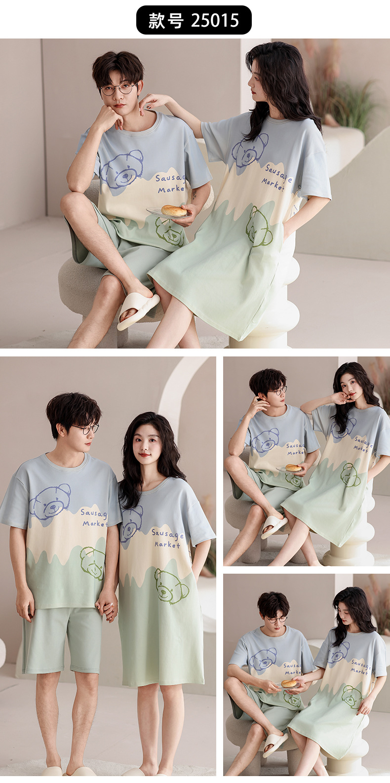 커플 잠옷 여름 항균 순수 코튼 얇은 가슴 패드 반팔 잠옷 여성 캐주얼 라운드 넥 남성 홈웨어 세트스토어 가기