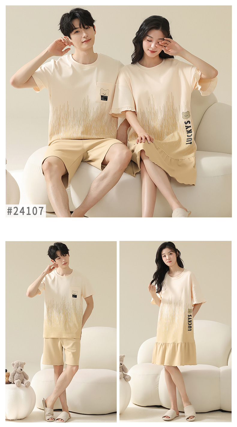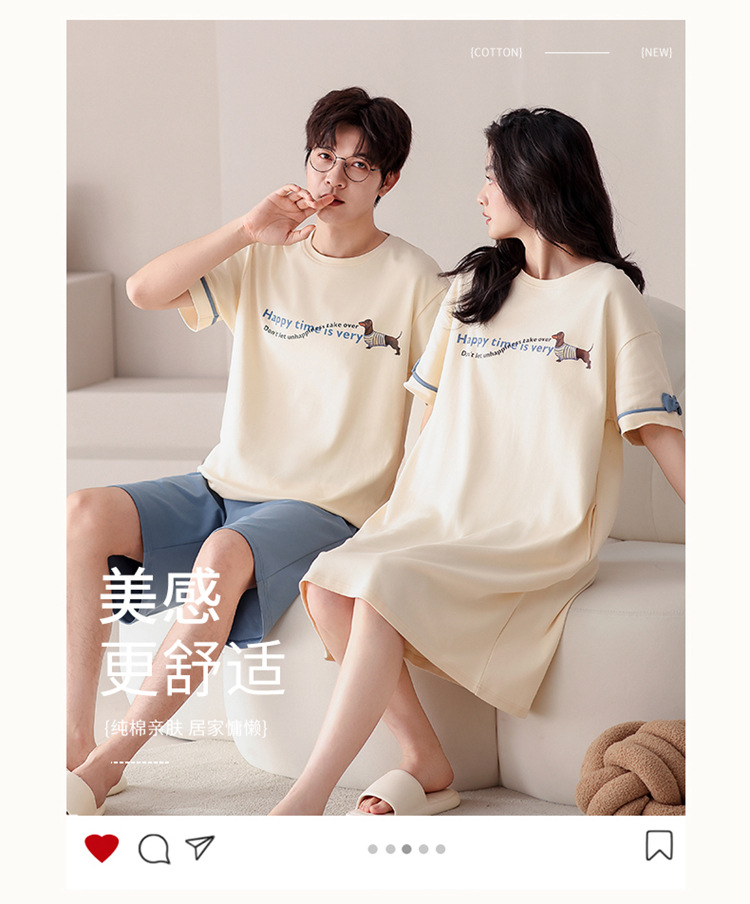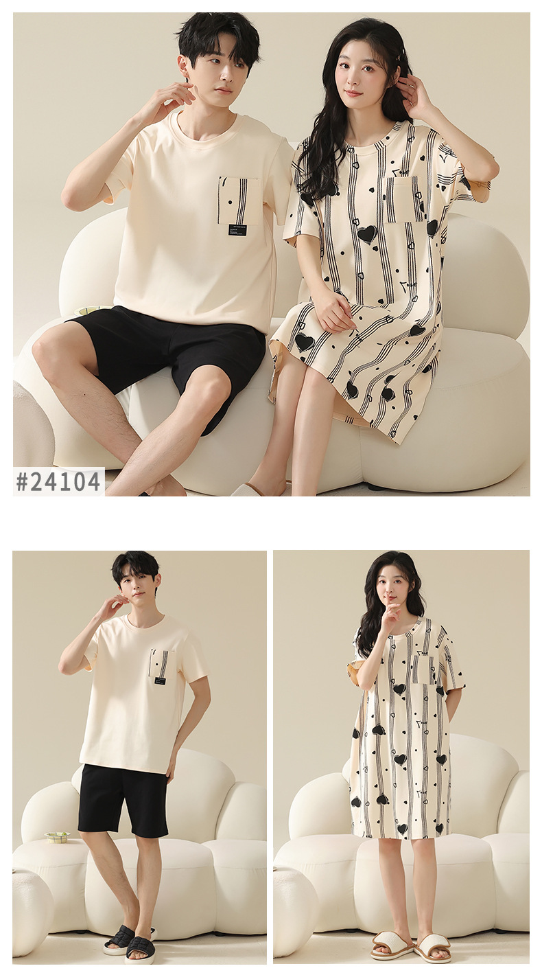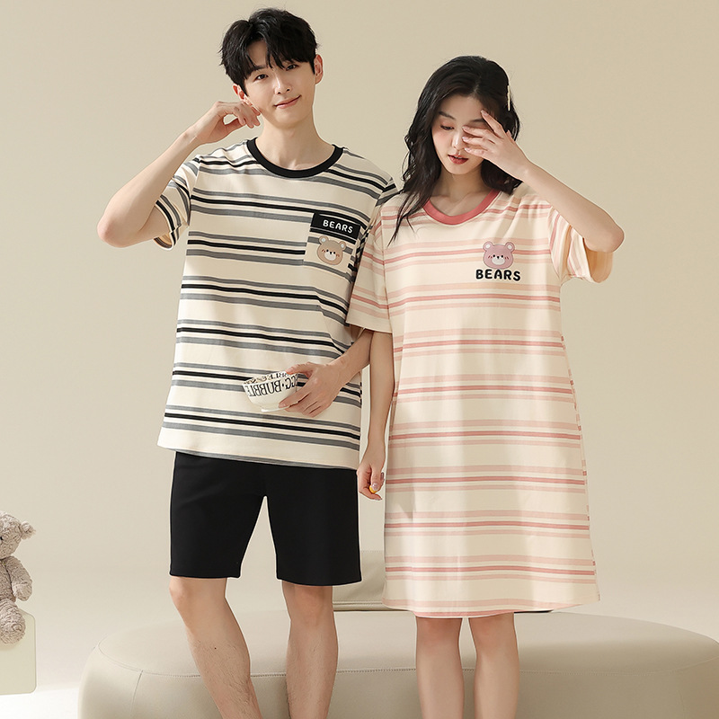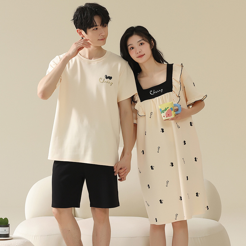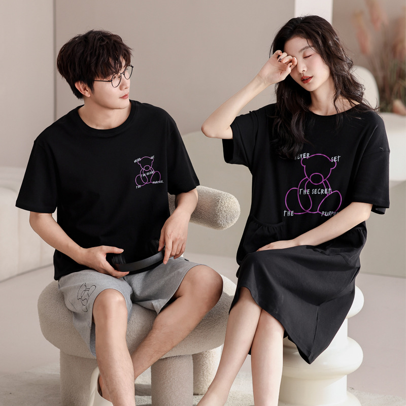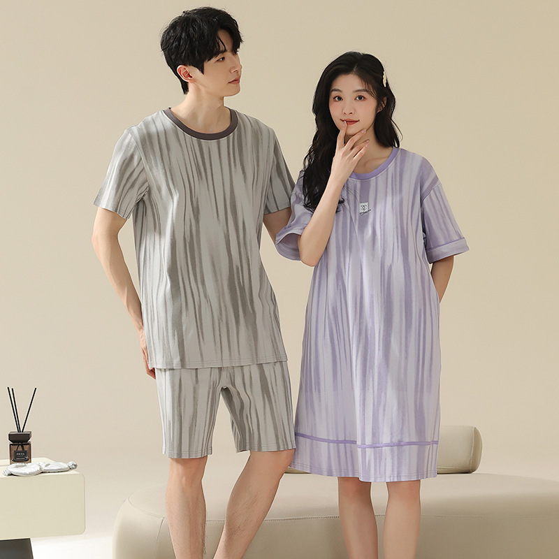 커플 잠옷 여름 항균 순수 코튼 얇은 가슴 패드 반팔 잠옷 여성 캐주얼 라운드 넥 남성 홈웨어 세트스토어 가기