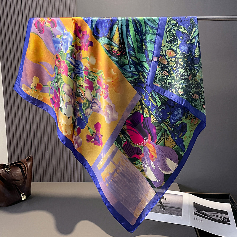유화 꽃 인쇄 스플 라이스 컬러 90 스퀘어 스카프 봄과 가을 맞춤형 패션 여름 태양 보호 시뮬레이션 실크 얇은 실크 스카프 여성용