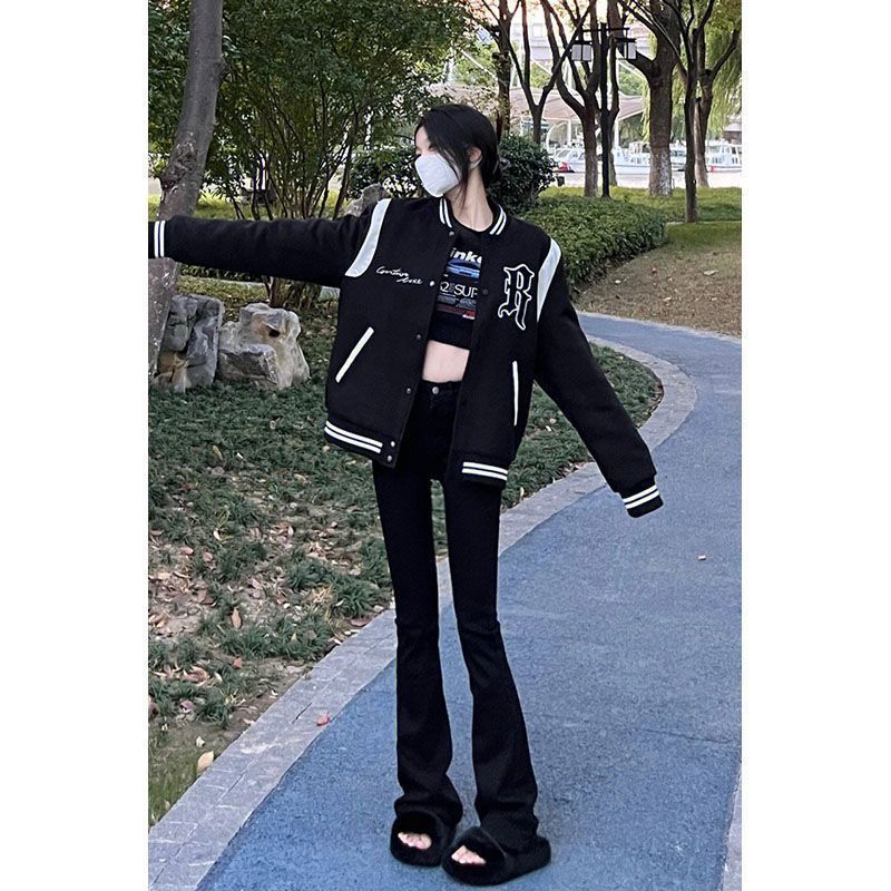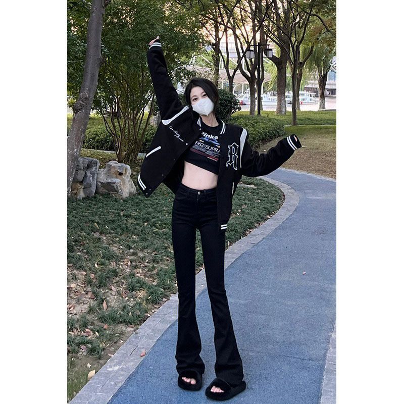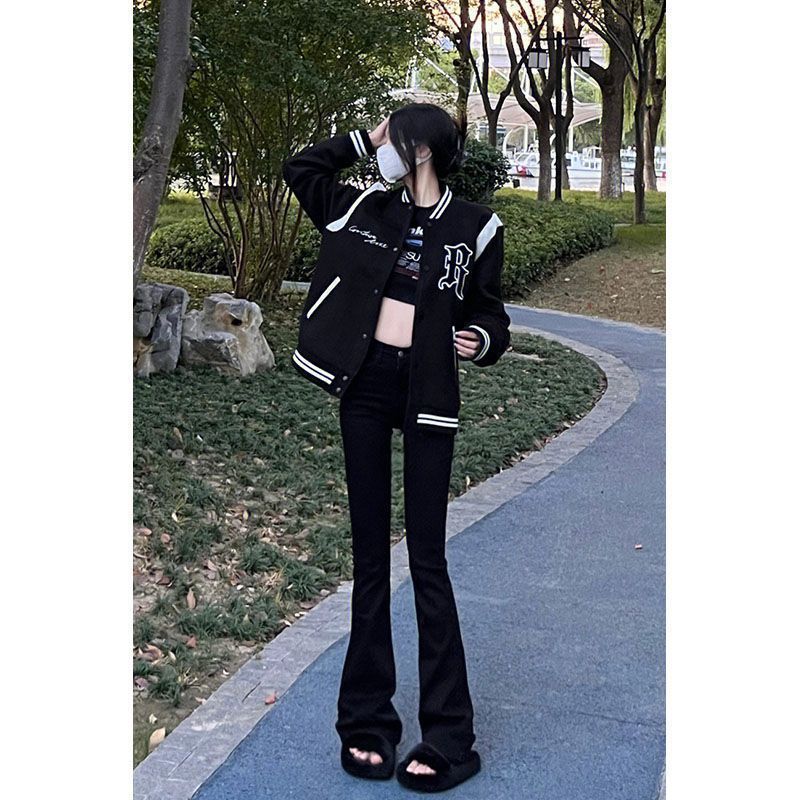 가을 여성을 위한 블랙 마이크로 플레어 디자인 청바지 새로운 다용도 하이웨이스트 슬리밍 스트레치 버전 말굽 바지
