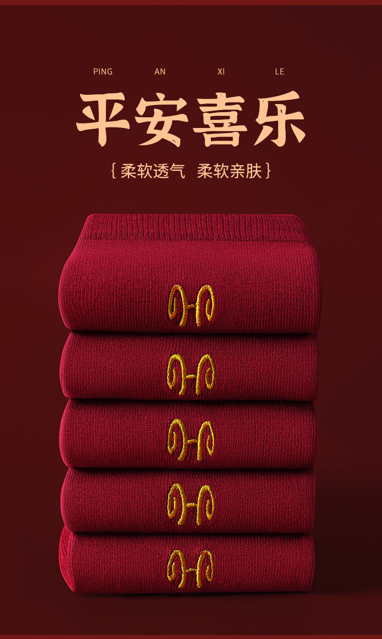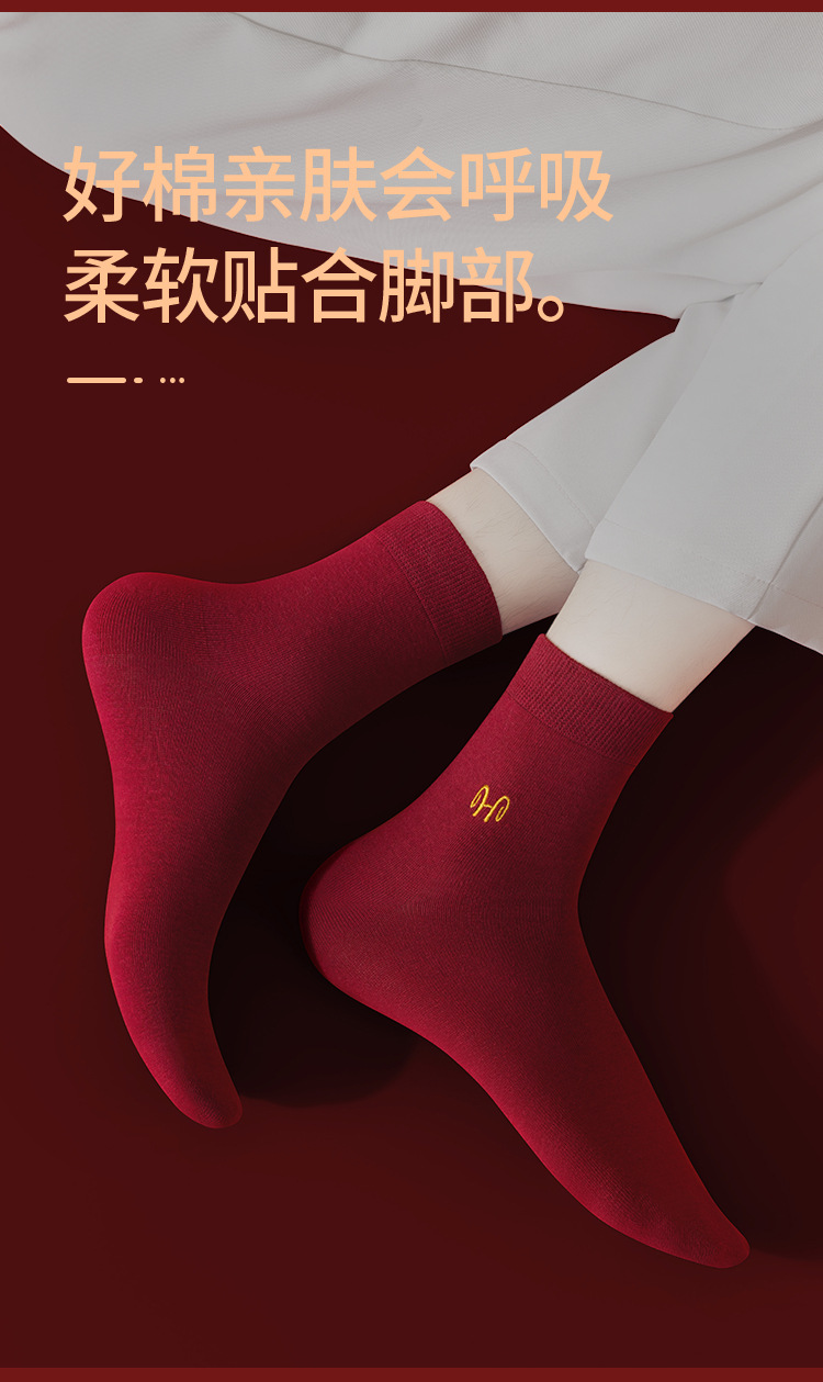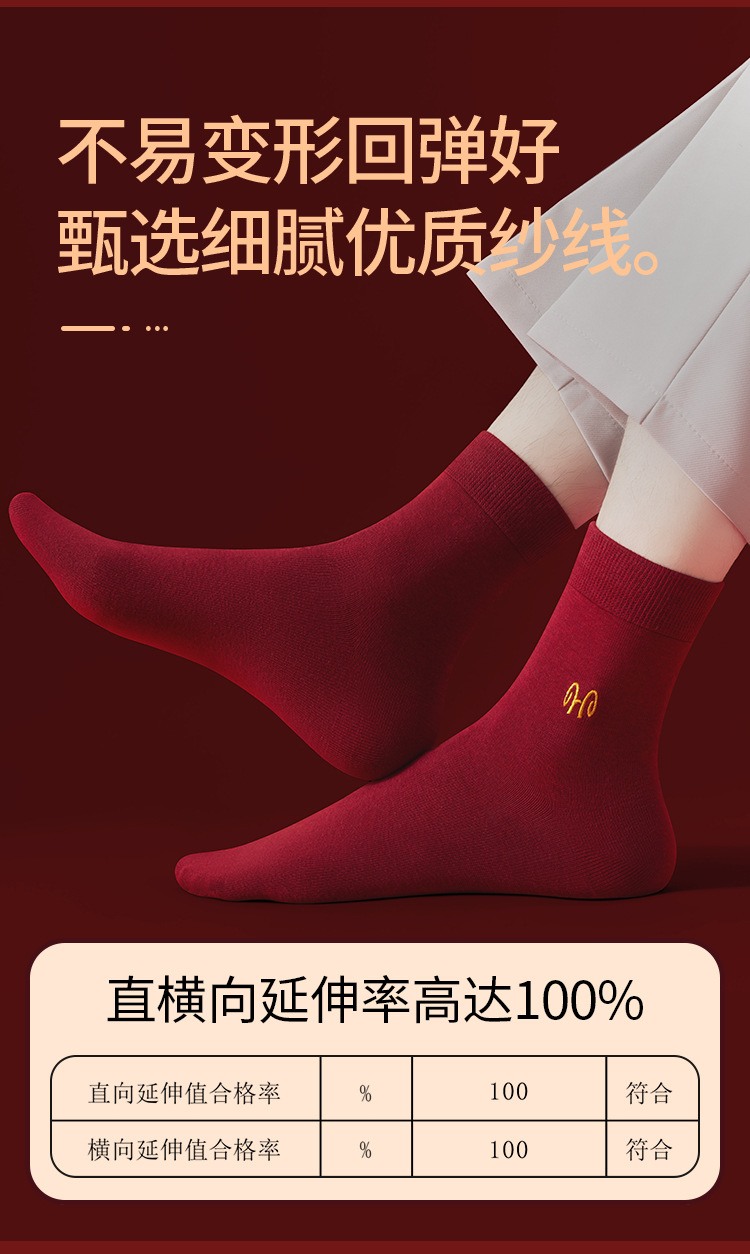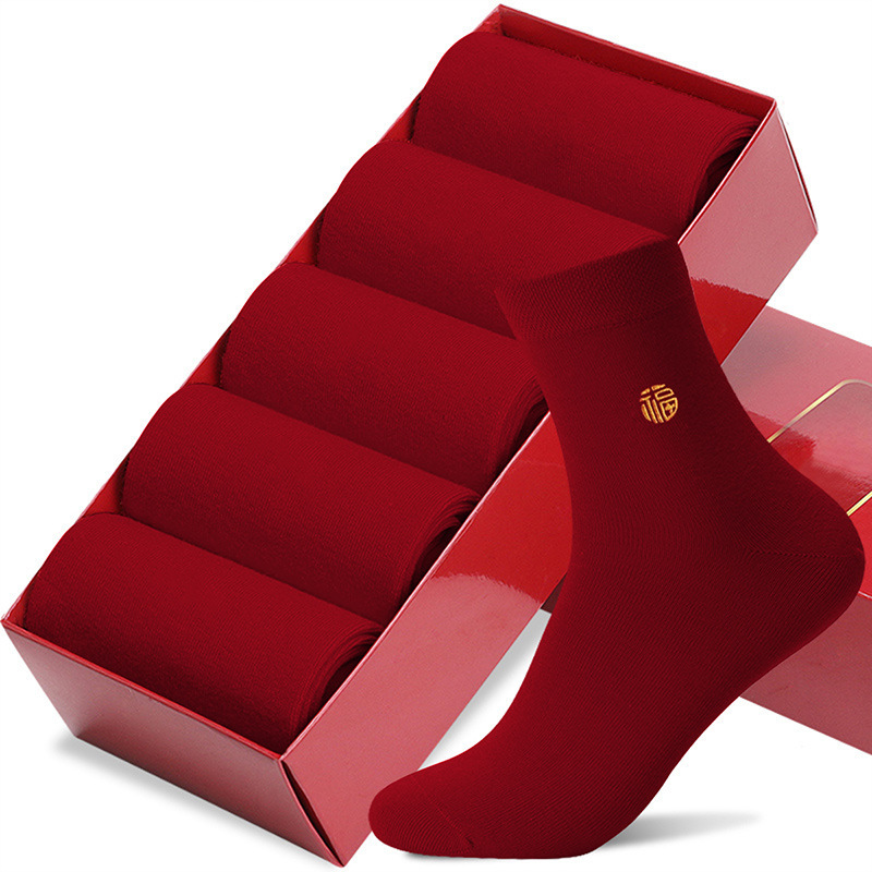 Hengyuanxiang 부르고뉴 코튼 축제 남성과 여성 양말 자수 결혼 행운의 해 빨간색 양말 5 쌍 박스형스토어 가기
