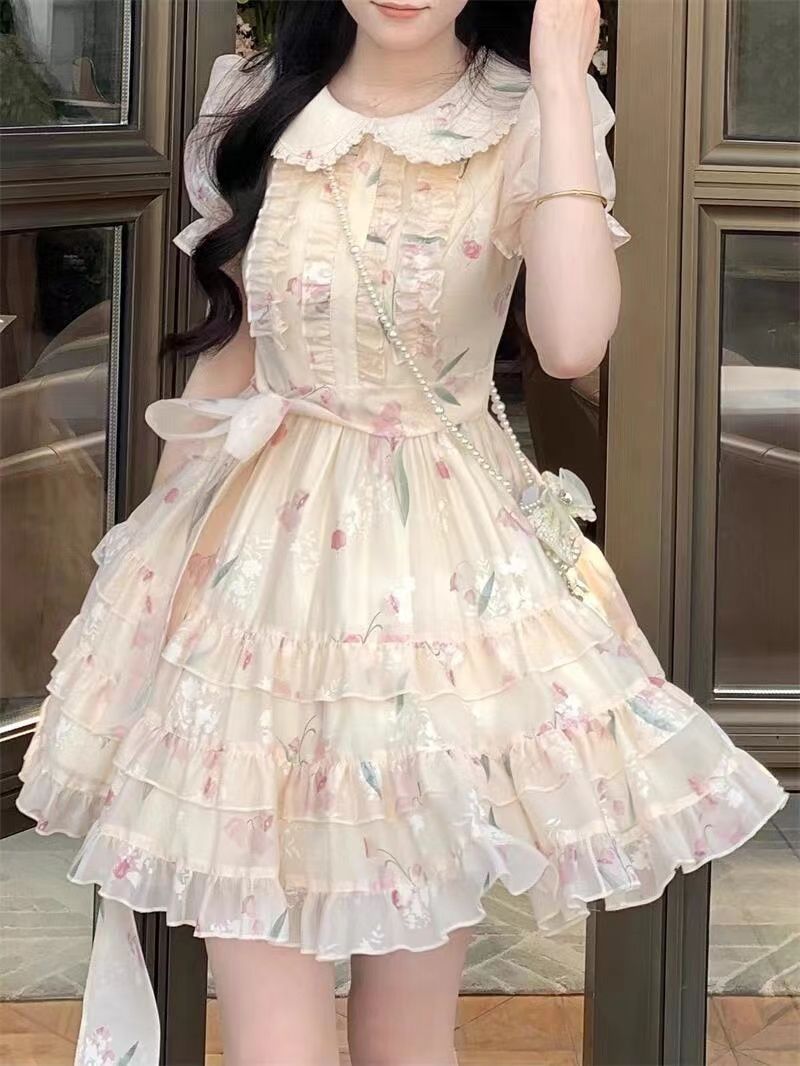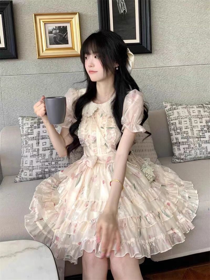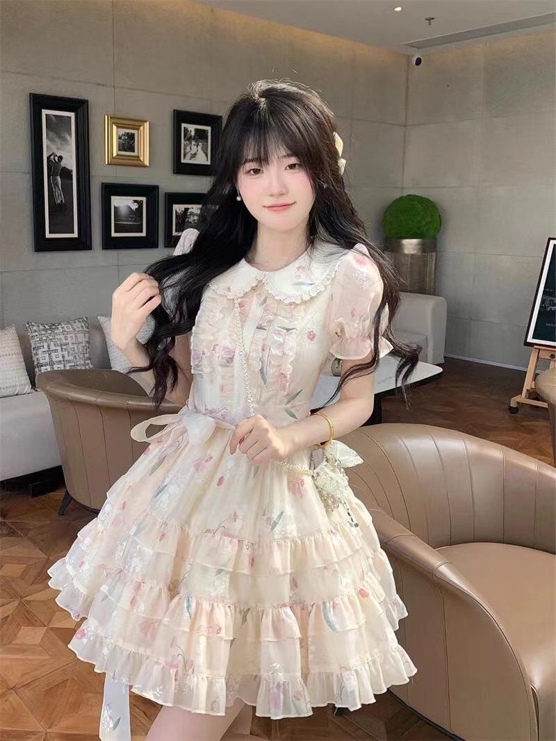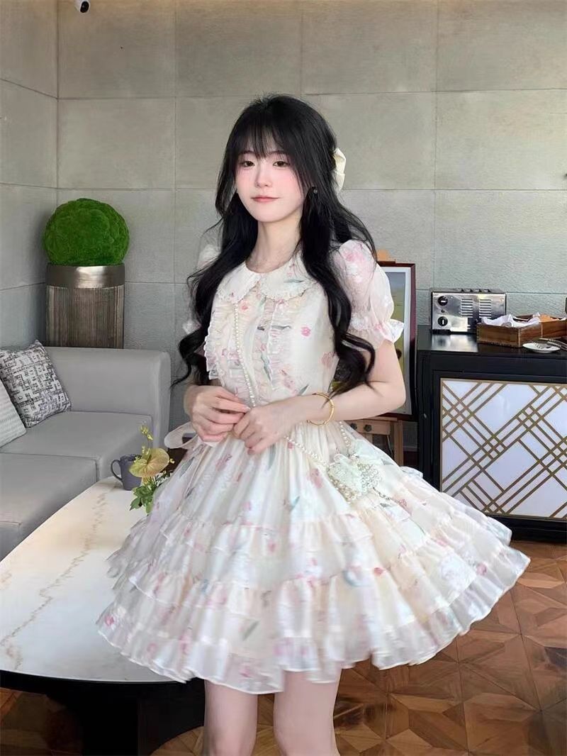 부드러운 스타일 인형 칼라 원피스 여성 여름 달콤한 쁘띠 꽃 공주 원피스 프랑스 스타일 타이트 웨이슬 원피스스토어 가기