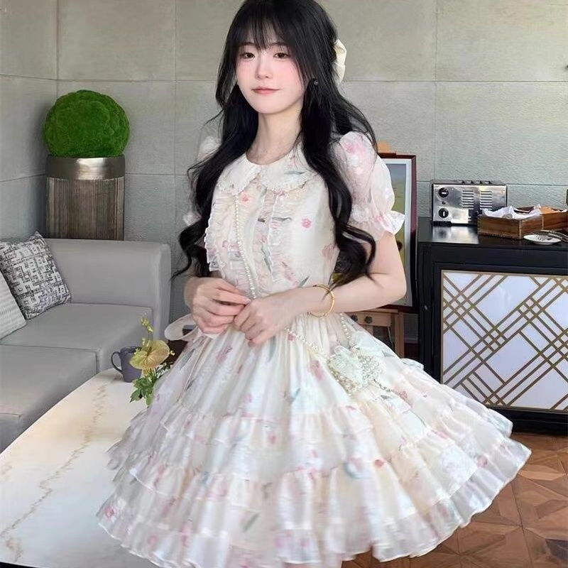 부드러운 스타일 인형 칼라 원피스 여성 여름 달콤한 쁘띠 꽃 공주 원피스 프랑스 스타일 타이트 웨이슬 원피스