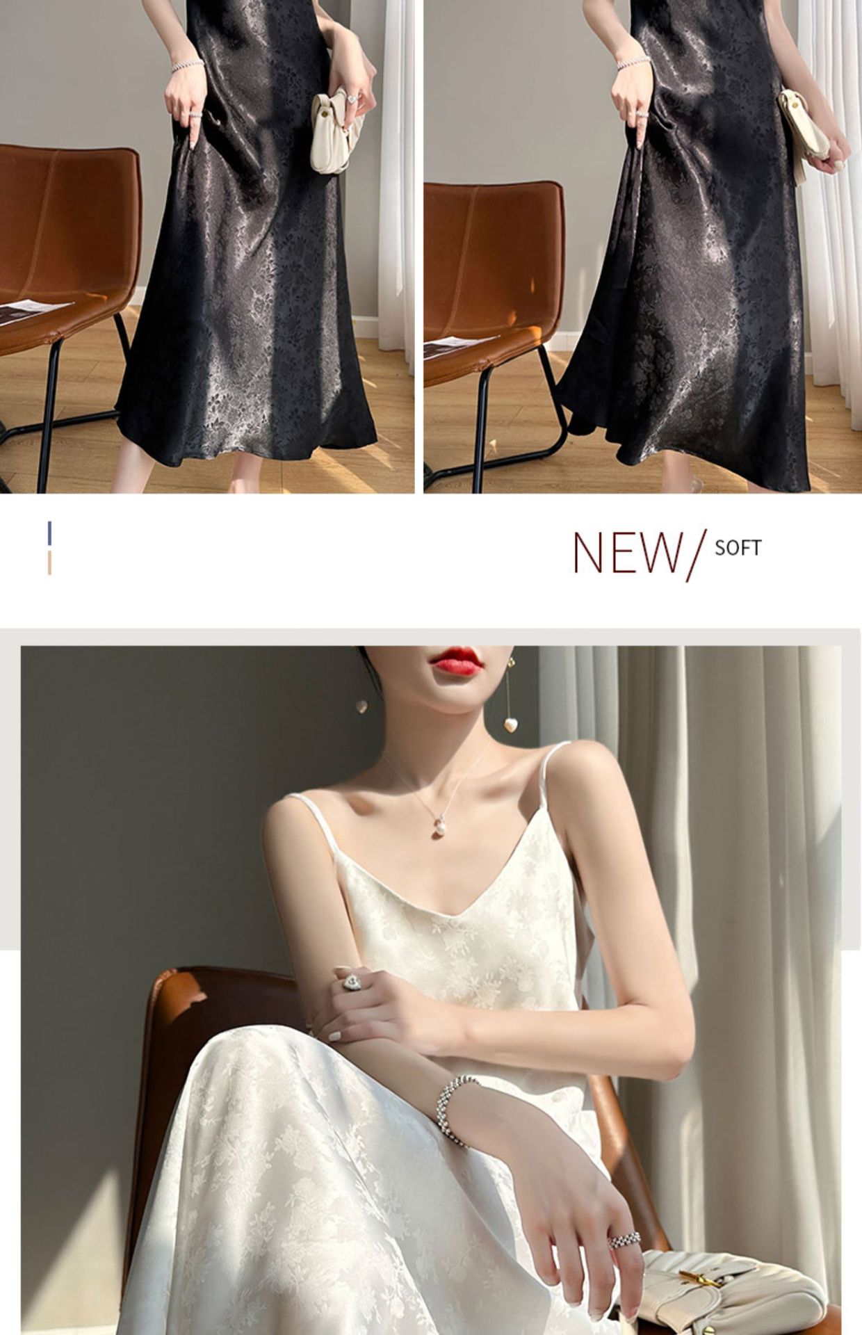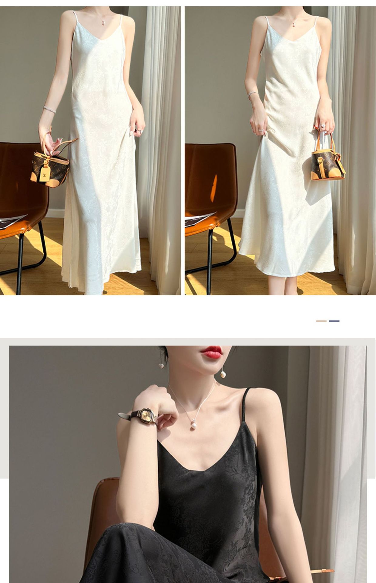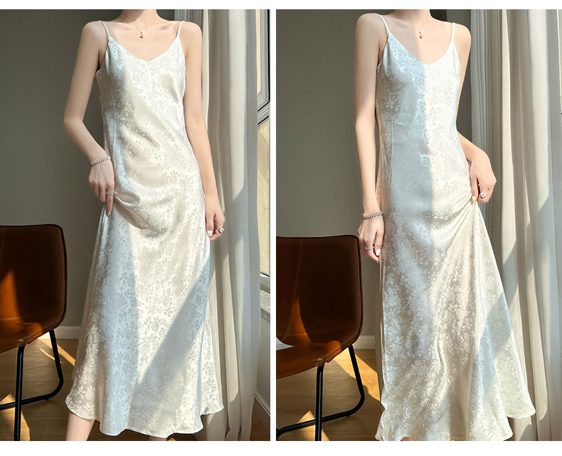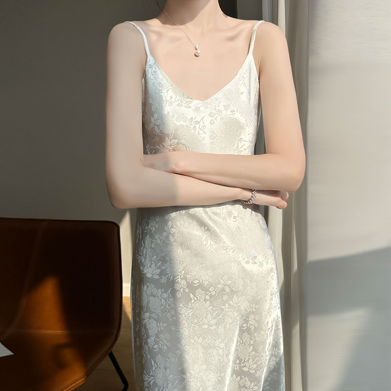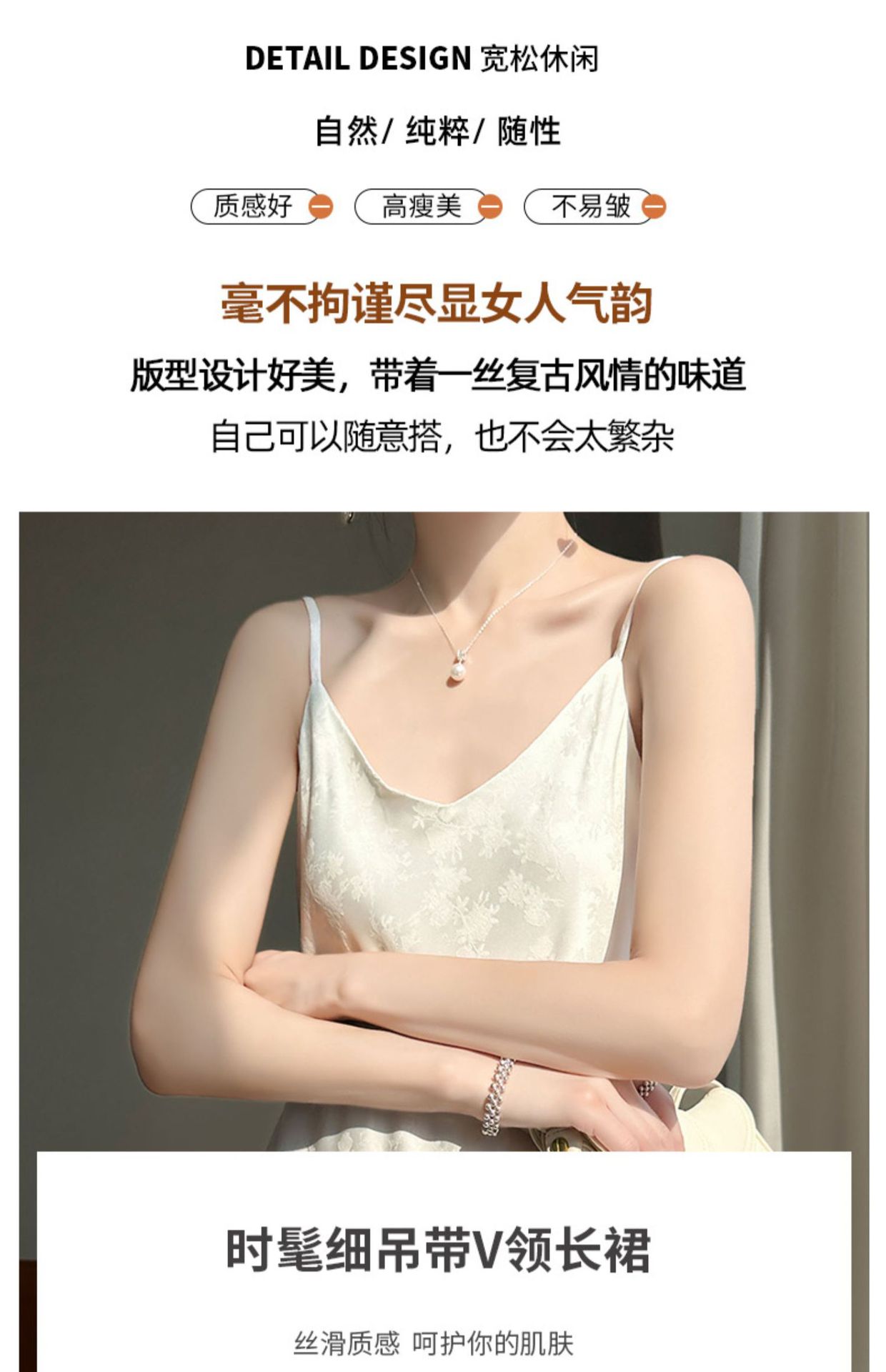 여름 자카드 V 넥 슬링 원피스 여성용 아세트산 새틴 오버 더 무릎 A 라인 롱 원피스 슬리밍 내셔널 스타일베이스 원피스스토어 가기